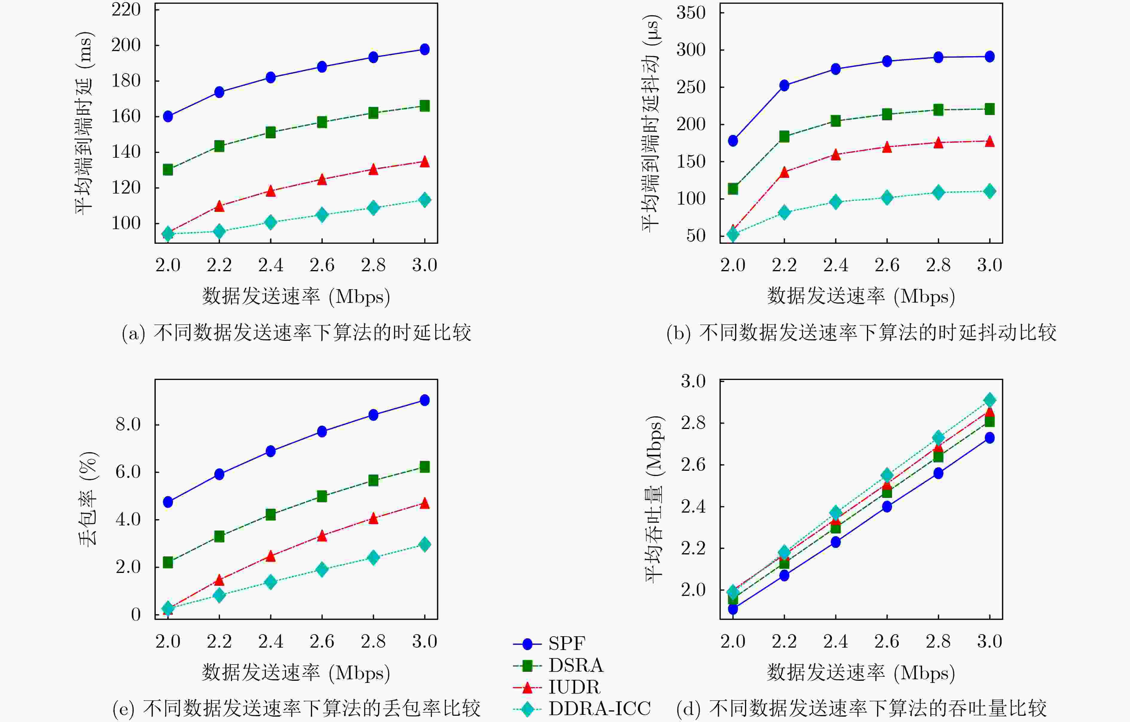算法 额外开销包数(个) 丢包率(%) 额外开销提升率(%) 丢包率降低(%) 降低-提升增益比 DSRA 9836 6.23 0.00 0.00 0.00 IUDR 12412 4.71 26.19 24.39 0.93 DDRA-ICC 12454 2.96 26.61 52.49 1.97 -