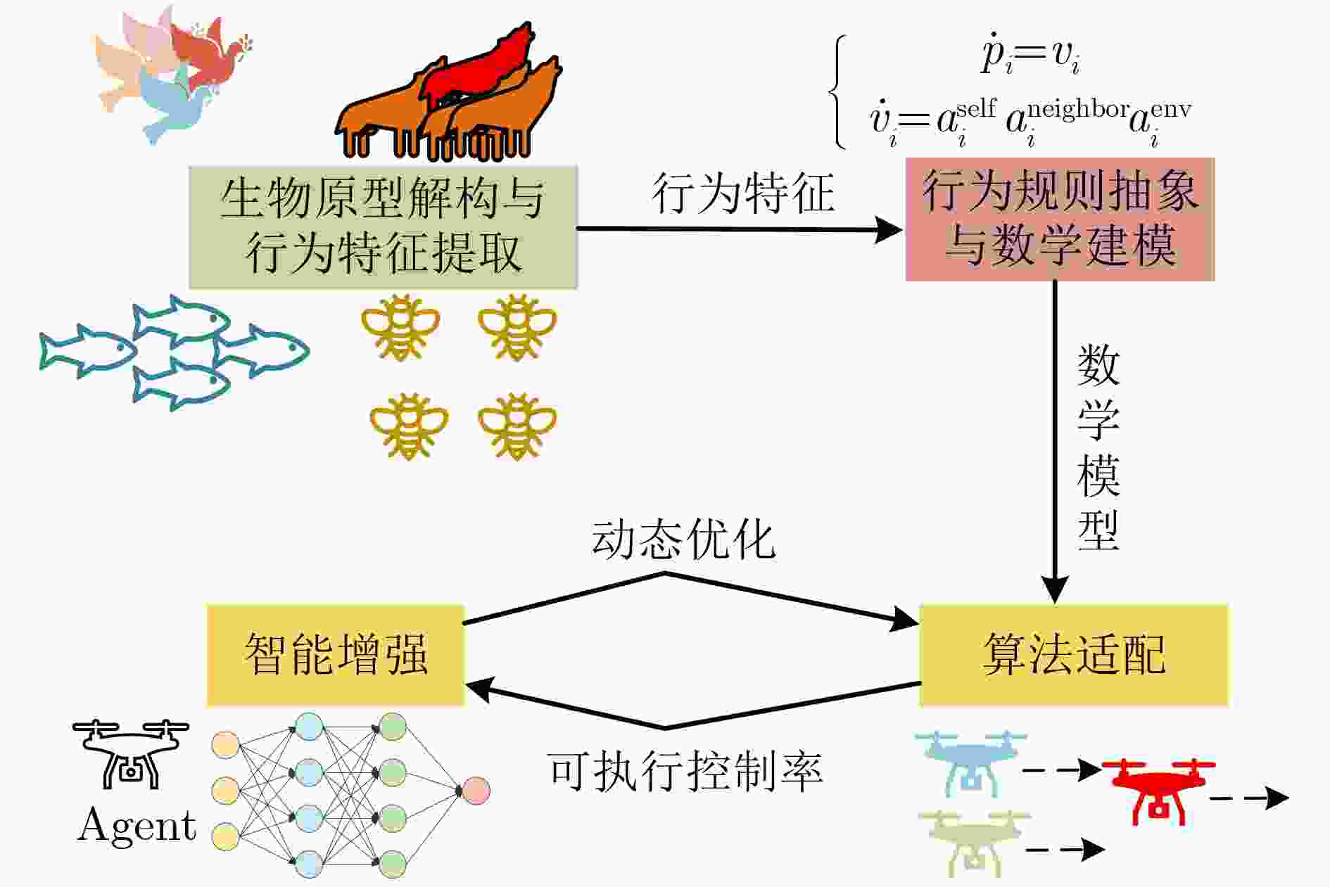 摘要: 该文针对生物群体协同行为向无人机集群工程模型转化的难题,结合群体仿生智能与深度强化学习(BSI-DRL)的融合演进趋势,聚焦仿生映射理论与建模方法创新,梳理BSI-DRL驱动的无人机集群建模进展与挑战。首先,明确群体仿生智能概念与核心特征,分析其3阶段发展范式跃迁及技术价值,解析4类典型生物群体协同机制,提炼仿生映射3关键步骤;其次,围绕BSI-DRL核心范式,综合分析仿生规则参数化DRL优化、仿生规则生成式多智能体强化学习、动态角色分配与分层DRL协同优化3大方向的技术优势与挑战;最后,展望跨物种生物机制融合、BSI-DRL闭环协同、仿鸟群相变控制与DRL融合等未来方向,为技术工程化落地提供理论和方法支撑。Abstract:
