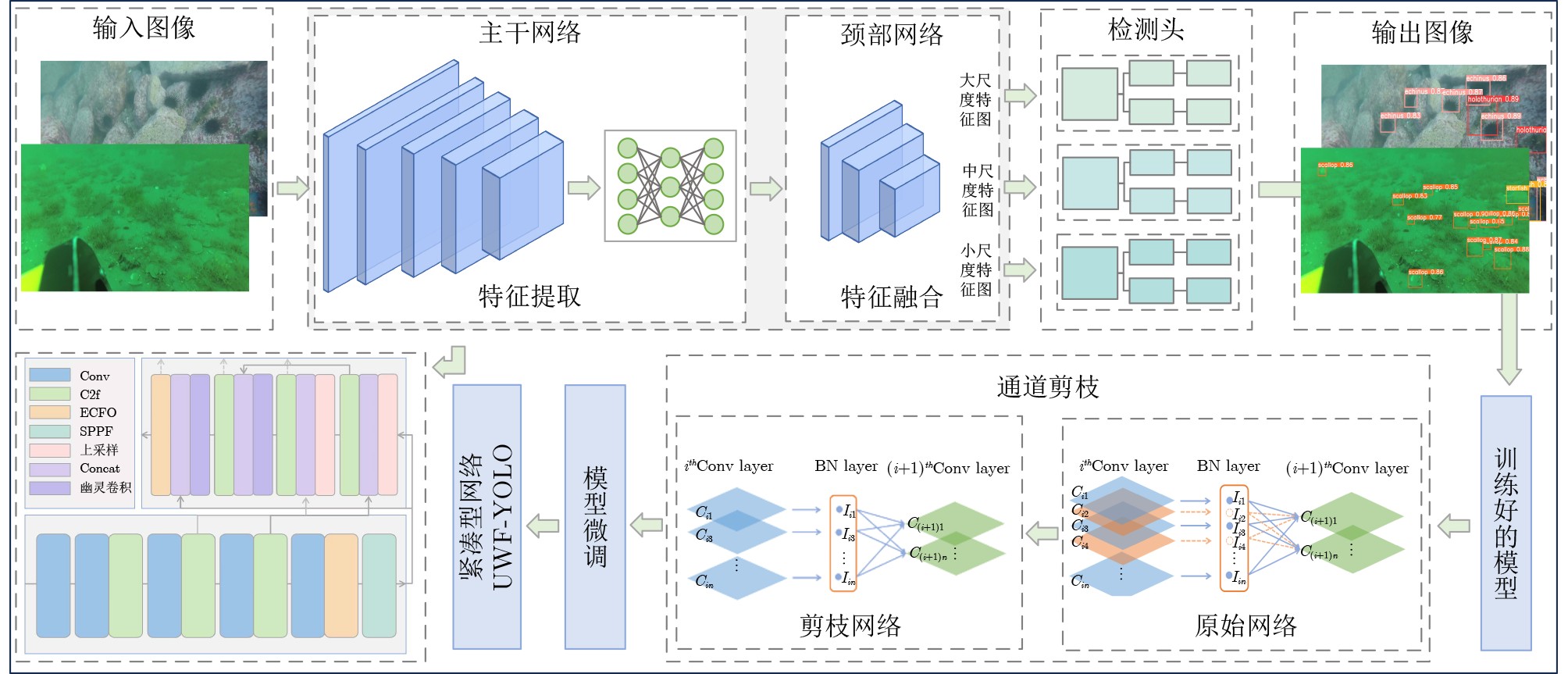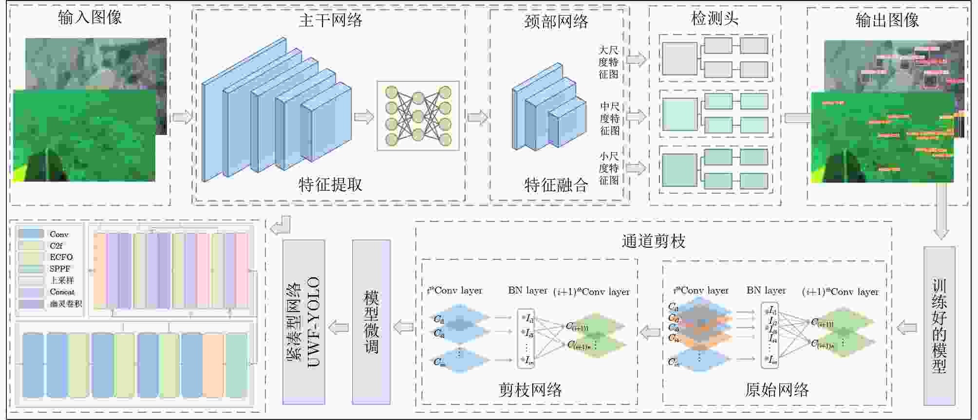 Objective The rapid development of underwater imaging technology has significantly elevated the importance of underwater object detection for resource exploration and environmental monitoring applications. Generally, complex underwater environments yield various degradations of image quality such as color casts, haze-like effects, and non-uniform illumination. Unfortunately, existing vision-based object detection algorithms always suffer from unpleasing performance and notable limitations especially for detecting small objects, resulting in missed detections and false positives. Moreover, existing deep learning based underwater detection models also face substantial challenges in striking an optimal balance between accuracy and lightweight design under the condition of limited equipment resources. To address these issues, it is of great importance to design efficient underwater object detection methods in view of water-related vision tasks, which play a crucial role in marine resource exploration, ecological monitoring, underwater robotics, and intelligent perception systems for autonomous underwater vehicles. Methods In this paper, we propose a novel lightweight framework based on redundant information optimization for underwater object detection. Technically, we propose a lightweight underwater object detection network called UWF-YOLO based on redundancy information optimization. First, the C2f module is reconstructed by FasterNet Block to optimize both the backbone and neck networks, and a feature channel selection mechanism is incorporated to reduce the redundant features. On other hand, due to the redundant traditional convolutional features in the YOLO neck, it is difficult to adapt to the underwater environment. Ghost Convolution is also introduced to generate the Ghost feature map for enhancing the multi-scale feature fusion capability of the neck network. Next, our proposed method achieves parameter sharing by replacing the original detection head with a redundant optimization group detection head (RRG-Head) based on group convolution, thereby reducing computational costs. Finally, the structured channel pruning technique is applied to identify the inter-layer dependencies of the graph and bind the pruning units. Combined with the LAMP weight magnitude score normalization for evaluating the importance of channels, the low-contributing groups are pruned and fine-tuned to achieve network size compression. In addition, since the scene of underwater detection datasets are typically monotonous and the underwater objects contained in the available datasets are usually small and clustered. We also construct an underwater object detection dataset with complex scene, namely CSUOD, by collecting real-world underwater images from different websites and platforms to ensure both its diversity and authenticity, followed by manual annotation and resolution normalization preprocessing. CSUOD is specifically designed for various challenging underwater environments characterized by color casts, haze-like effects, and non-uniform illumination. In our CSUOD, we manually select 1135 images containing 6 different types, and perform the manual annotation and resolution standardization operations.Results and Discussions Extensive experiments are conducted on three public underwater object detection datasets (i.e., DUO, RUOD, and TrashCan) by comparing several popular and widely used object detection methods. The proposed model is evaluated against mainstream detectors, including YOLOv5s, YOLOv7-tiny, YOLOv8s, YOLOv9-tiny, and Deformable DETR. In computational complexity assessment, experimental results show that the proposed method has reduced the FLOPs, model size, and parameters by 60.4%, 77.3%, and 78.4%, respectively, compared to the baseline. In addition, our method has outperformed YOLOv9-tiny with comparable parameters by 0.3%, 2.3%, and 3.4% in mAP across the three datasets. Also, some comparative results on our established CSUOD dataset also indicate that our proposed model has a good improvement and stability even in complex underwater environments. Qualitative visualization results further illustrate the model’s robustness and detection stability under various underwater degradations, such as haze-like effects and non-uniform illumination. Conclusions Quantitative and qualitative experiments on different datasets have validated the effectiveness and robustness of the proposed method. In addition, our method achieves superior detection performance in complex underwater environments, effectively solving missed detections and false positives caused by background interference. A large number of experimental results show that our designed UWF-YOLO can not only achieve significant light weighting, but also maintain the comparable detection accuracy comparing with the benchmark model. This balance between the detection accuracy and low computational cost makes it particularly suitable for underwater devices with limited resources. Besides, the proposed method has great potential in practical scenarios such as marine ecological monitoring, underwater resource exploration, and autonomous underwater vehicle perception systems. It also provides a reliable and efficient technical foundation for real-time applications, with strong adaptability to different underwater conditions, efficient integration into embedded platforms, and support for real-time perception and decision-making. Our constructed dataset CSUOD in this study will help address the limitations of existing underwater object detection datasets and promote the development of underwater object detection. In the future, this work can be further extended to multi-modal perception systems and larger-scale datasets. These efforts will enable adaptive models for more dynamic underwater scenarios and support broader applications in intelligent ocean observation and autonomous navigation. -