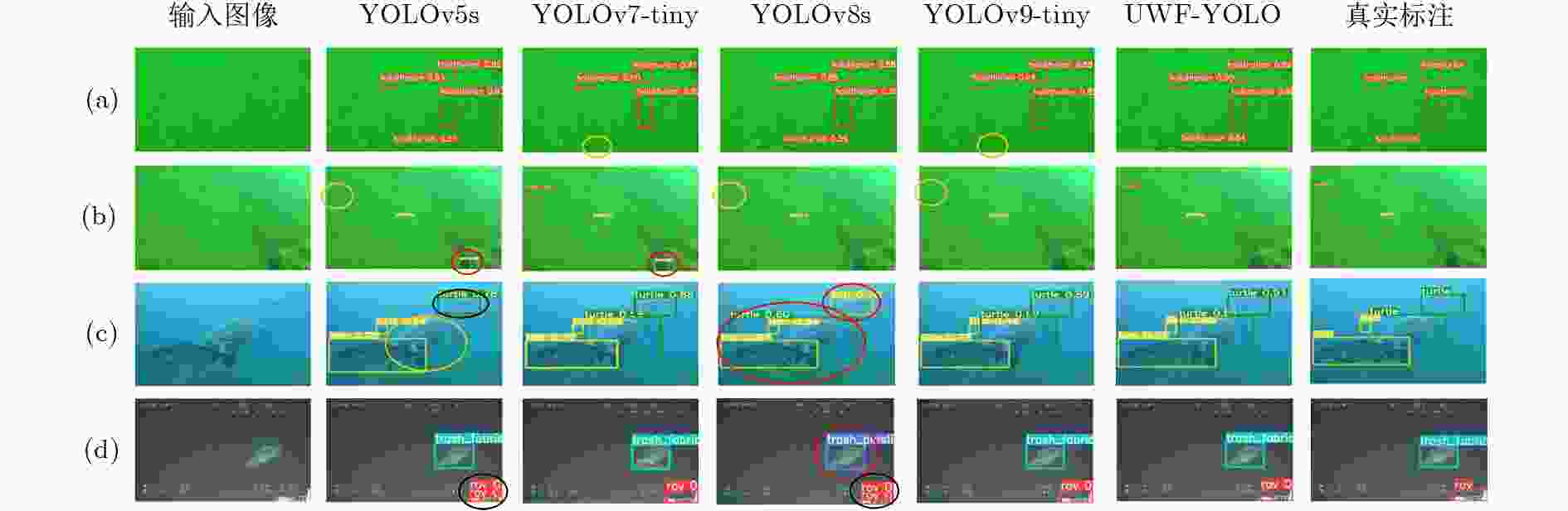 网络 mAP50_all (%) AP_j (%) AP_c (%) AP_f (%) AP_s (%) AP_d (%) AP_t (%) YOLOv5s 78.4 86.7 81.5 76.9 50.8 87.1 87.8 YOLOv7-tiny 65.3 56.6 70.2 74.0 52.6 72.6 65.6 YOLOv7 79.6 89.6 82.5 80.5 61.6 81.6 81.8 YOLOv8s 78.0 85.9 72 79.6 64.2 76.4 90 YOLOv9-tiny 65.1 76.5 63.1 64.9 45.6 65.9 74.4 UWF-YOLO 79.6 84.2 79.8 75.2 70.5 84.2 84.1 表 3 消融实验