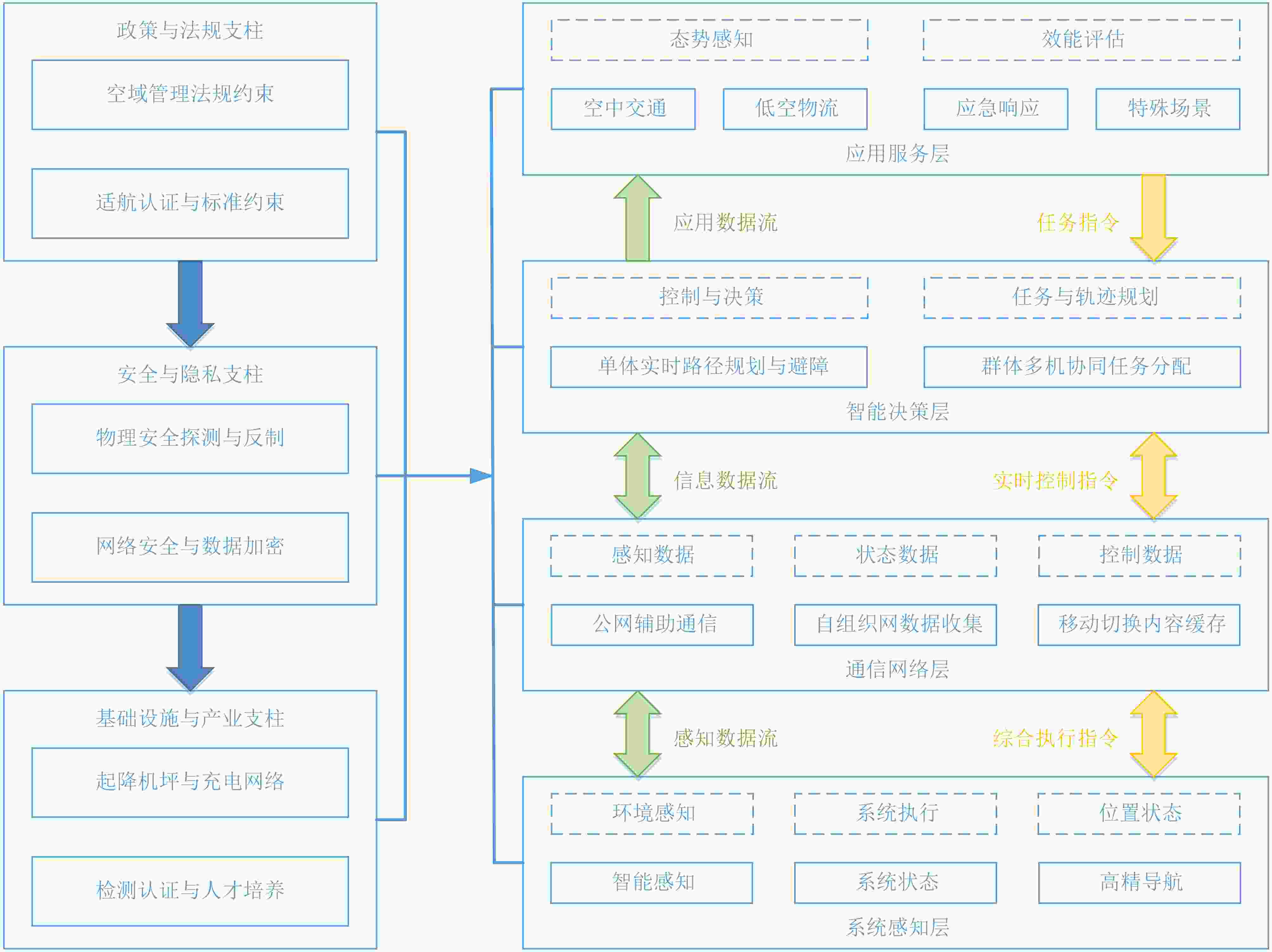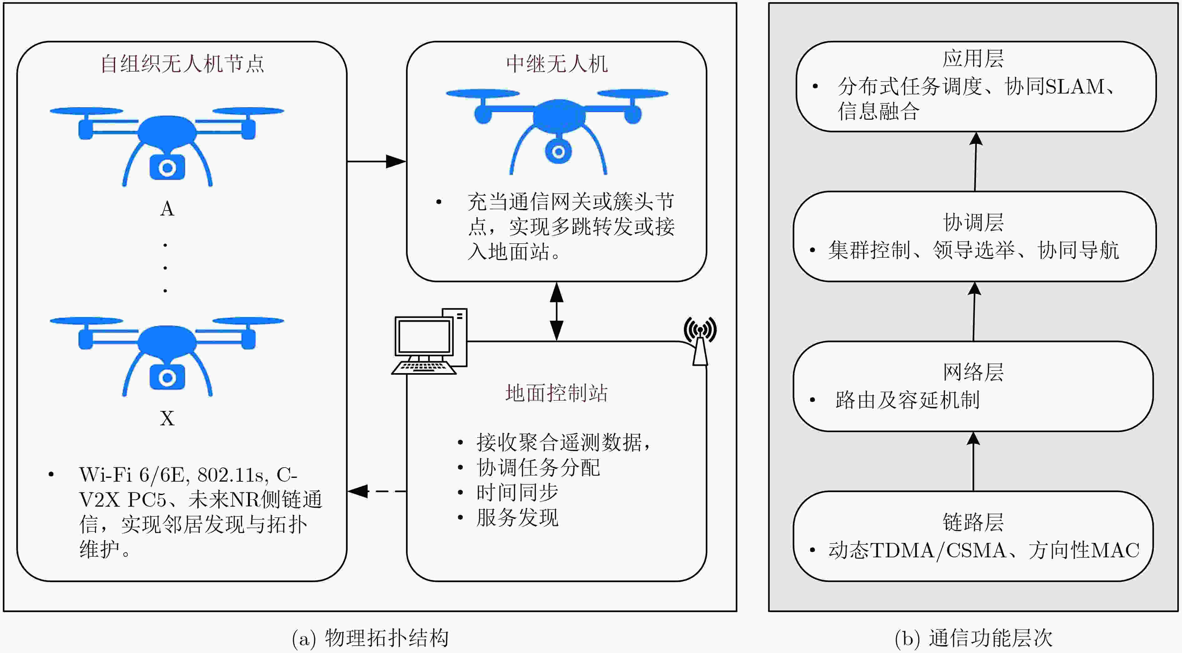 摘要: 随着新质生产力与数字经济的深度发展,低空经济作为融合通用航空、无人机物流和空中出行等形态的新型产业体系,正成为全球经济增长的新引擎。无人机凭借其高性价比、可扩展性与高度智能化,在其中扮演着核心赋能者角色。该文系统性梳理并构建了面向低空经济的智能无人机技术体系,该体系遵循从底层基础到顶层应用的逻辑,通过通信网络贯通“感知-决策-行动”闭环,总结了无人机在物流运输、城市空中交通、公共安全和工业巡检等典型场景中的应用模式。剖析了其在感知与定位、通信与组网、智能决策与控制及空域集成与安全4大领域的关键技术内涵;归纳低空无人机通信3大关键网络类型,即无人机与蜂窝网络深度融合网络、无人机自组织专用网络、无人机计算应用网络,并详细分析了智能反射面(IRS)辅助的非正交多址接入(NOMA)通信、自组网拓扑优化和移动边缘计算分别在3类网络中的核心作用。解析了无人机在可靠通信、智能感知、自主协同和能源动力等方面面临的技术挑战以及在空域管理、法规标准、商业模式与社会接受度方面的非技术挑战。展望智能全域通信、认知群体智能、高置信度自主安全及绿色可持续技术等未来融合发展趋势的同时,提出基于“挑战驱动-技术融合-体系构建-反馈迭代”的低空经济无人系统技术闭环演进范式,揭示了其发展内在逻辑是以应用为导向、具备自我优化能力的动态递归过程。Abstract: