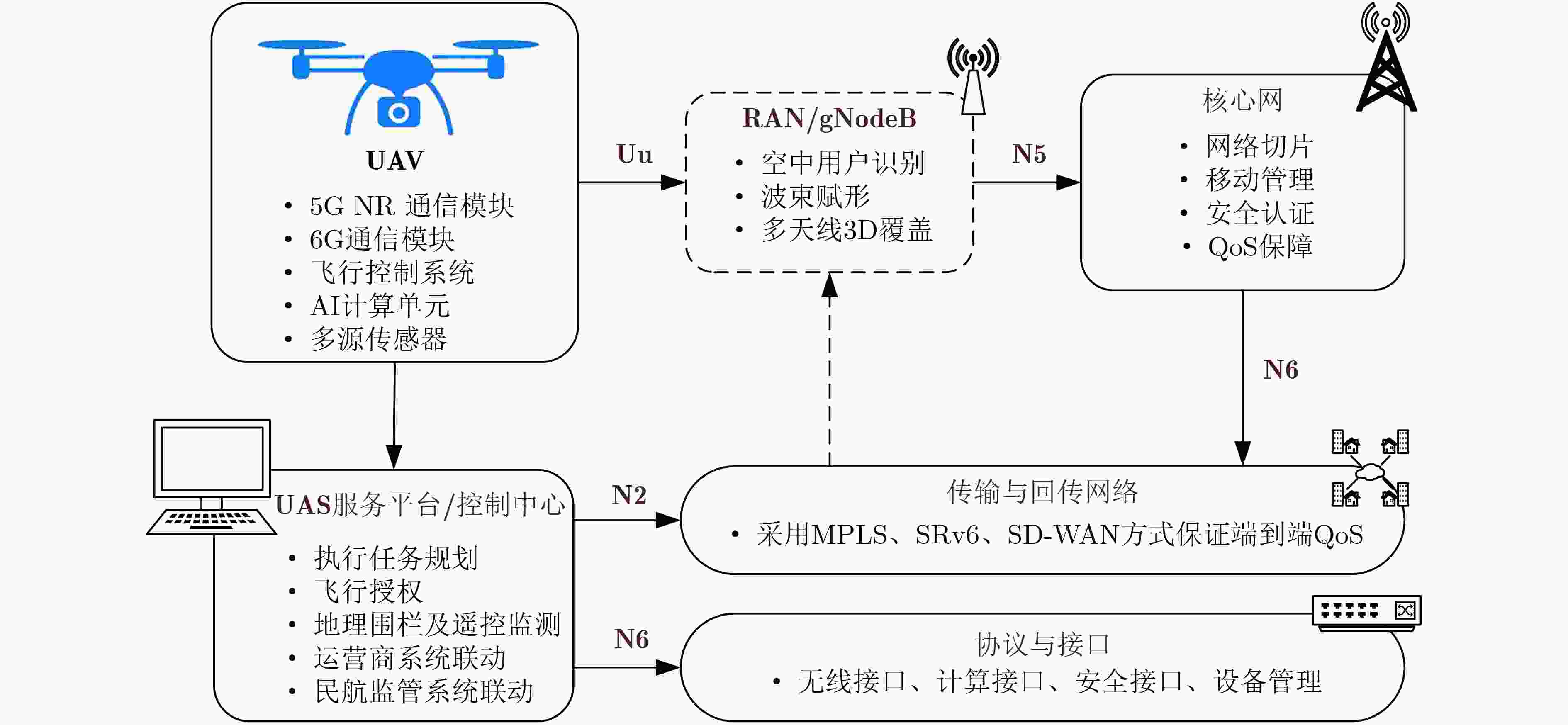 摘要: 随着新质生产力与数字经济的深度发展,低空经济作为融合通用航空、无人机物流、空中出行等形态的新型产业体系,正成为全球经济增长的新引擎。无人机凭借其高性价比、可扩展性与高度智能化,在其中扮演着核心赋能者角色。本文系统性梳理并构建了面向低空经济的智能无人机技术体系,该体系遵循从底层基础到顶层应用的逻辑,通过通信网络贯通“感知-决策-行动”闭环,总结了无人机在物流运输、城市空中交通、公共安全、工业巡检等典型场景中的应用模式。剖析了其在感知与定位、通信与组网、智能决策与控制及空域集成与安全四大领域的关键技术内涵;归纳低空无人机通信三大关键网络类型,即无人机与蜂窝网络深度融合网络、无人机自组织专用网络、无人机计算应用网络,并详细分析了IRS辅助的NOMA通信、自组网拓扑优化和移动边缘计算分别在三类网络中的核心作用。解析了无人机在可靠通信、智能感知、自主协同、能源动力等方面面临的技术挑战以及在空域管理、法规标准、商业模式与社会接受度方面的非技术挑战。展望智能全域通信、认知群体智能、高置信度自主安全及绿色可持续技术等未来融合发展趋势的同时,提出基于“挑战驱动-技术融合-体系构建-反馈迭代”的低空经济无人系统技术闭环演进范式,揭示了其发展内在逻辑是以应用为导向、具备自我优化能力的动态递归过程。Abstract: