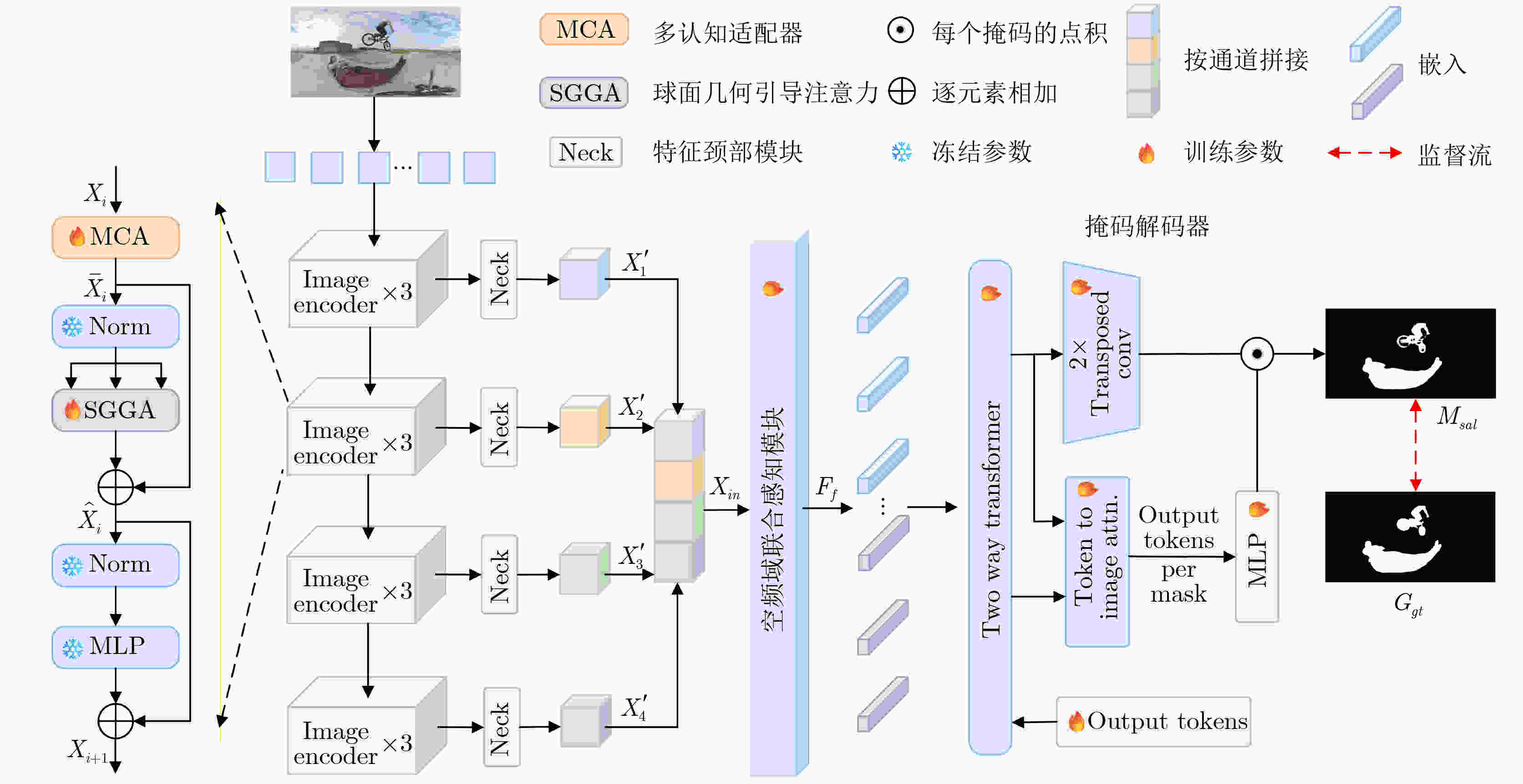 Objective With the rapid development of VR and AR technologies and the increasing demand for omnidirectional visual applications, accurate salient object detection in complex 360° scenes has become critical for system stability and intelligent decision-making. The Segment Anything Model (SAM) demonstrates strong transferability across 2D vision tasks; however, it is primarily designed for planar images and lacks explicit modeling of spherical geometry, which limits its direct applicability to 360° salient object detection (360° SOD). To address this challenge, this work explores integrating SAM’s generalization capability with spherical-aware multi-scale geometric modeling to advance 360° SOD. Specifically, a Multi-Cognitive Adapter (MCA), Spherical Geometry-Guided Attention (SGGA), and Spatial-Frequency Joint Perception Module (SFJPM) are introduced to enhance multi-scale structural representation, alleviate projection-induced geometric distortions and boundary discontinuities, and strengthen joint global–local feature modeling. Methods The proposed 360° SOD framework is built upon SAM and consists of an image encoder and a mask decoder. During encoding, spherical geometry modeling is incorporated into patch embedding by mapping image patches onto a unit sphere and explicitly modeling spatial relationships between patch centers, injecting geometric priors into the attention mechanism. This design enhances sensitivity to non-uniform geometric characteristics and mitigates information loss caused by omnidirectional projection distortions. The encoder adopts a partial freezing strategy and is organized into four stages, each containing three encoder blocks. Each block integrates MCA for multi-scale contextual fusion and SGGA to model long-range dependencies in spherical space. Multi-level features are concatenated along the channel dimension to form a unified representation, which is further enhanced by the SFJPM to jointly capture spatial structures and frequency-domain global information. The fused features are then fed into the SAM mask decoder, where saliency maps are optimized under ground-truth supervision to achieve accurate localization and boundary refinement. Results and Discussions Experiments are conducted using the PyTorch framework on an RTX 3090 GPU with an input resolution of 512×512. Evaluations on two public datasets (360-SOD and 360-SSOD) against 14 state-of-the-art methods demonstrate that the proposed approach consistently achieves superior performance across six evaluation metrics. On the 360-SOD dataset, the model attains an MAE of0.0152 and a maximum F-measure of0.8492 , outperforming representative methods such as MDSAM and DPNet. Qualitative results show that the proposed method produces saliency maps highly consistent with ground-truth annotations, effectively handling challenging scenarios including projection distortion, boundary discontinuity, multi-object scenes, and complex backgrounds. Ablation studies further confirm that MCA, SGGA, and SFJPM contribute independently while complementing each other to improve detection performance.Conclusions This paper proposes a novel SAM-based framework for 360° salient object detection that jointly addresses multi-scale representation, spherical distortion awareness, and spatial-frequency feature modeling. The MCA enables efficient multi-scale feature fusion, SGGA explicitly compensates for ERP-induced geometric distortions, and SFJPM enhances long-range dependency modeling. Extensive experiments validate the effectiveness and feasibility of introducing SAM into 360° SOD. Future work will extend this framework to omnidirectional video and multi-modal scenarios to further improve spatiotemporal modeling and scene understanding. -