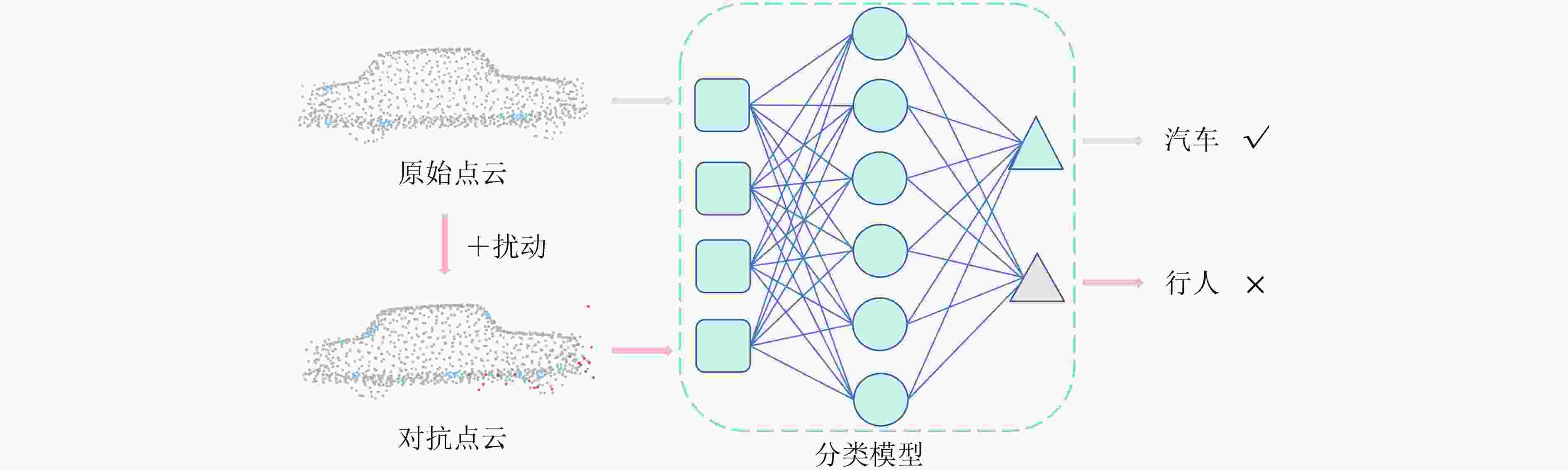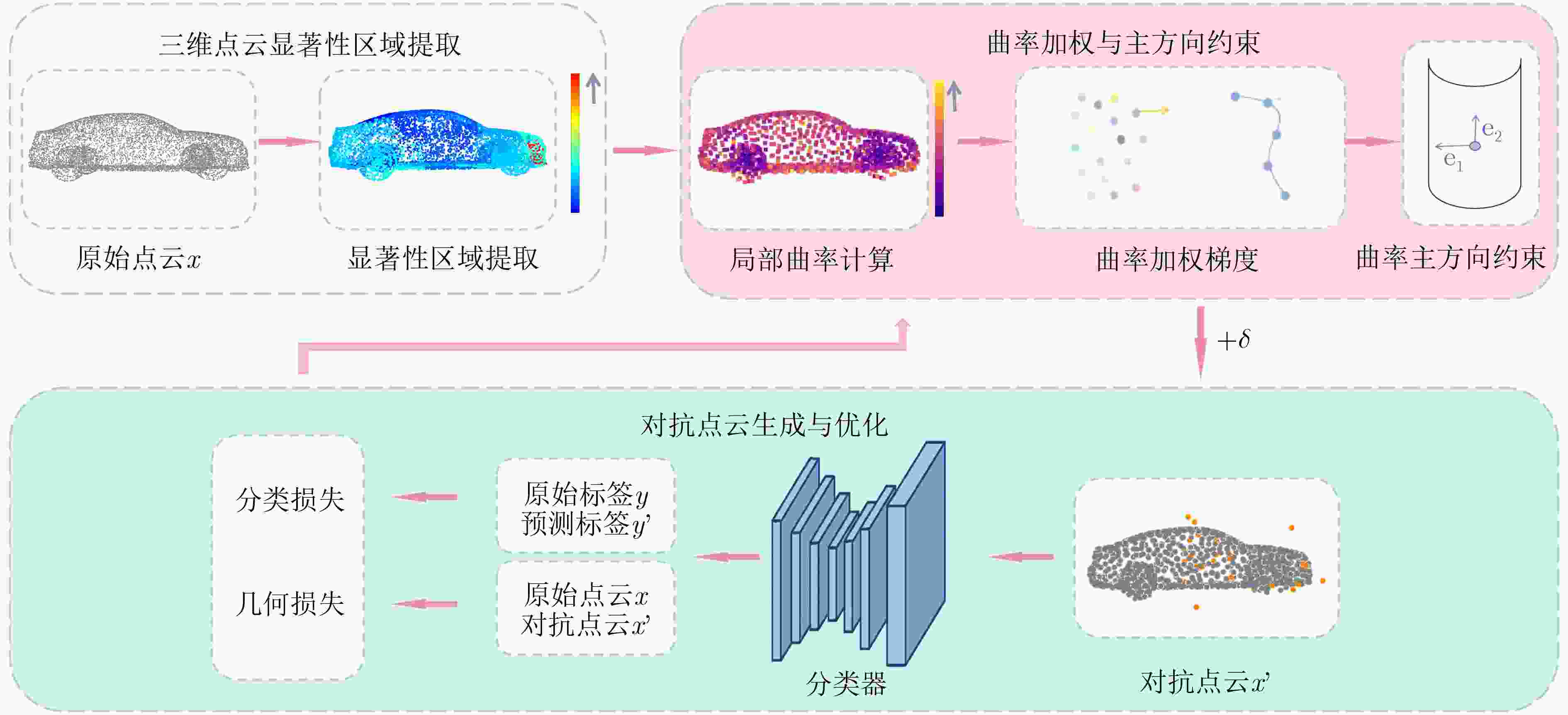摘要: 近年来,人工智能技术与光电感知系统深度融合,有力推动了智能驾驶技术的发展。激光雷达作为核心光电感知手段,能够获取高精度、高分辨的三维点云数据,已成为智能驾驶环境感知系统中不可或缺的新型信息来源。然而,基于深度学习的三维点云识别模型在面对对抗点云时表现出显著的脆弱性,极易受到精心设计的扰动攻击,导致识别性能急剧下降,对智能驾驶光电感知系统的安全构成了严峻挑战。因此,研究三维点云对抗攻击方法,不仅对提升光电信息处理模型的鲁棒性具有重要意义,更是保障智能驾驶系统安全可靠运行的关键一环。现有攻击方法虽在攻击有效性上有所提升,但生成扰动不够隐蔽,易产生离群点且不可感知性较差,限制了其在真实光电感知场景中的应用。为此,该文提出一种基于梯度自适应调整驱动的点云对抗攻击方法(GAA)。该方法首先分析三维点云分类网络的决策脆弱性,筛选对模型输出影响显著的关键点集;进而结合各点的局部曲率信息自适应调整梯度权重,并在主曲率方向的几何约束下优化扰动生成,从而在保证较高攻击成功率的同时,有效维持对抗点云的几何一致性与视觉自然性。在多个公开数据集上的实验结果表明,该方法在实现高攻击成功率的同时,显著降低了扰动强度,以ModelNet40数据集为例,在PointNet模型上平均仅扰动28个点便可达到97.69%的攻击成功率,显著优于现有对比方法,为评估和提升智能驾驶光电感知系统的安全性提供了有效工具。Abstract: In recent years, the deep integration of artificial intelligence and optoelectronic perception systems has significantly propelled the advancement of intelligent driving technologies, with LiDAR serving as a core sensing modality that acquires high-precision, high-resolution three-dimensional point cloud data, thereby establishing itself as an indispensable information source for environmental perception in intelligent driving systems. However, deep learning-based 3D point cloud recognition models exhibit marked vulnerability to meticulously crafted adversarial perturbations, leading to a sharp degradation in recognition performance and posing a serious security challenge to these optoelectronic perception systems. Research on adversarial attack methods for 3D point clouds is therefore crucial not only for enhancing model robustness but also for ensuring the safe and reliable operation of intelligent driving systems. While existing attack methods have improved in effectiveness, their generated perturbations often lack concealment, produce outliers, and demonstrate poor imperceptibility, limiting their practical application in real-world scenarios. To address these issues, this paper proposes a Gradient Adaptive Adjustment (GAA) driven point cloud adversarial attack method. This approach begins by analyzing the decision-level vulnerabilities of 3D point cloud classifiers to identify key points significantly influencing the model’s output. It then adaptively adjusts gradient weights by incorporating local curvature information and optimizes perturbation generation under geometric constraints aligned with principal curvature directions, thereby ensuring a high attack success rate while maintaining the geometric consistency and visual naturalness of the adversarial point cloud. Experimental results on multiple public datasets demonstrate that the proposed method achieves a high attack success rate while significantly reducing perturbation intensity; for instance, on the ModelNet40 dataset against the PointNet model, it attains a 97.69% attack success rate by perturbing only 28 points on average, substantially outperforming existing comparative methods and providing an effective tool for evaluating and enhancing the security of intelligent driving optoelectronic perception systems.