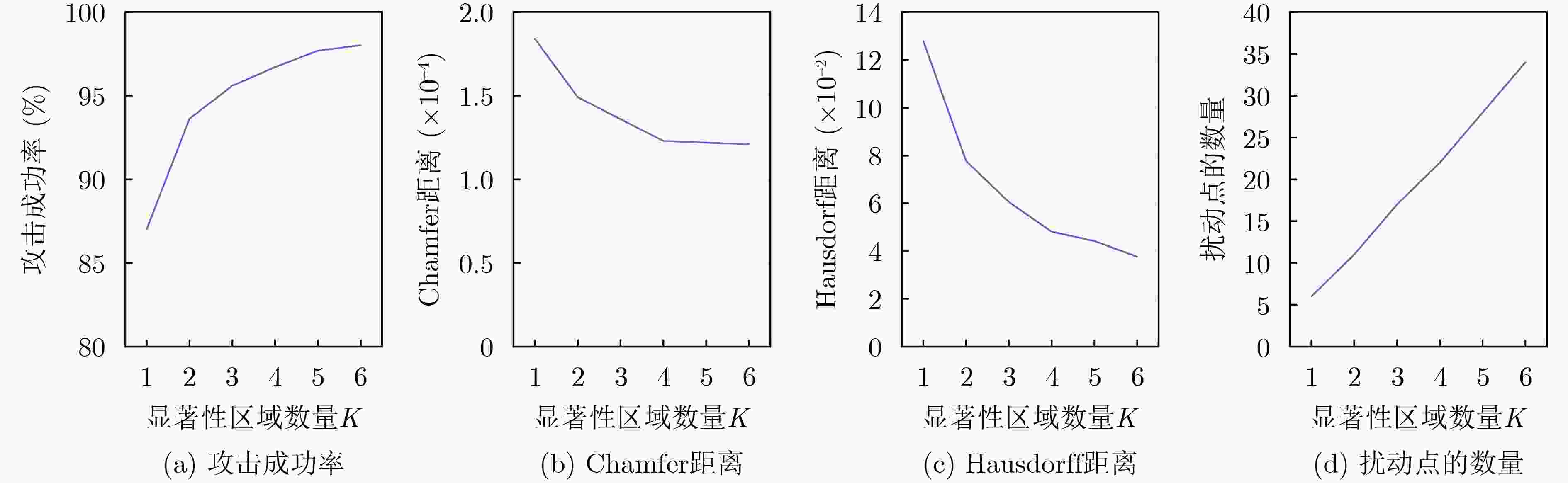 K 攻击成功率 Chamfer距离 Hausdorff距离 扰动点数 1 87.03% 1.84×10–4 1.28×10–1 6 2 93.63% 1.49×10–4 7.77×10–2 11 3 95.60% 1.36×10–4 6.06×10–2 17 4 96.70% 1.23×10–4 4.81×10–2 22 5 97.69% 1.22×10–4 4.42×10–2 28 6 98.02% 1.21×10–4 3.76×10–2 34 表 5 在Kitti[21]数据集上攻击不同的三维网络模型