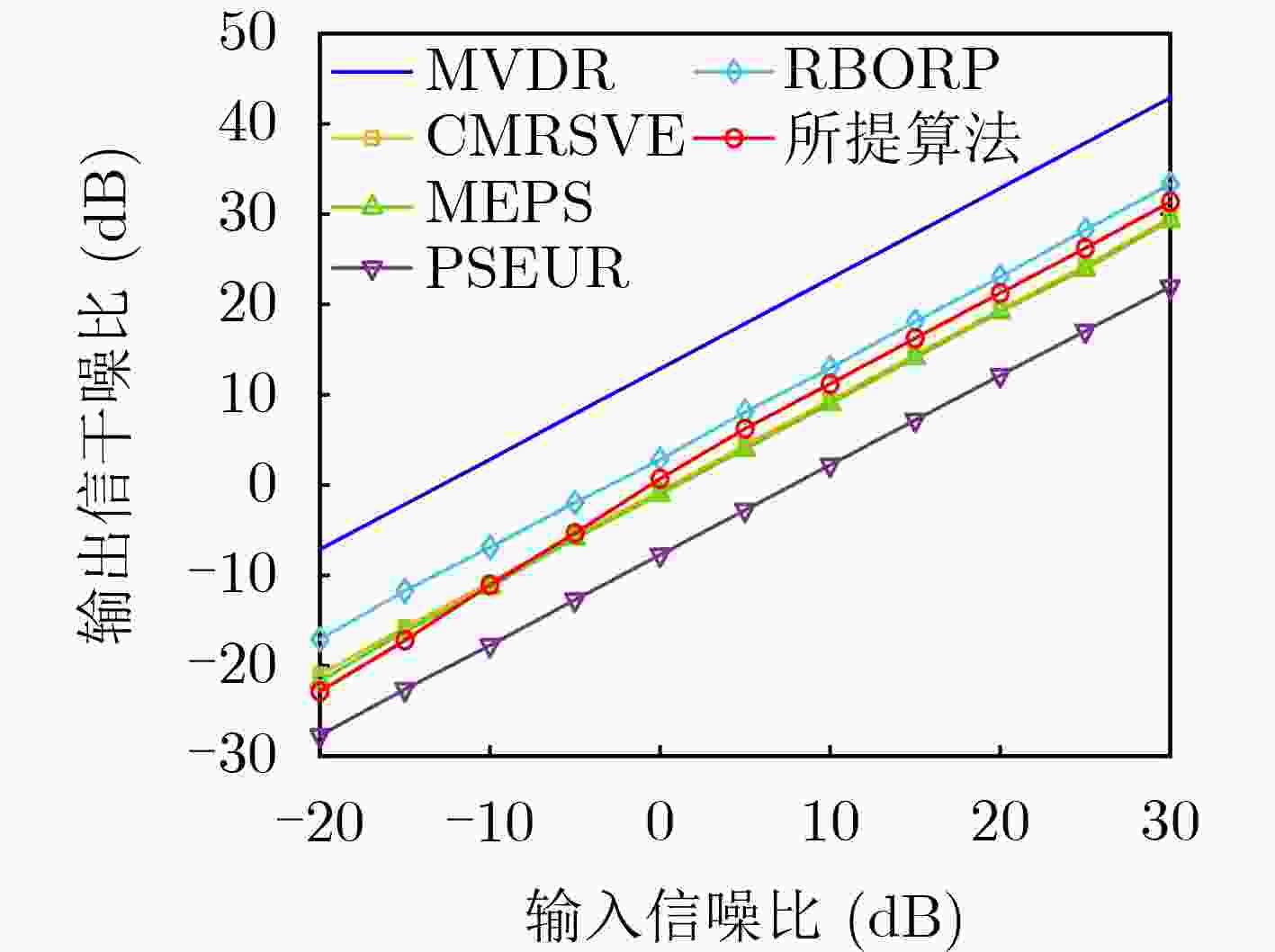 摘要: 该文针对传统自适应波束成形算法对信号到达角(DOA)失配敏感的问题,提出一种能有效抑制功率压制型干扰的稳健自适应波束成形算法。首先分析了DOA失配情况下的接收端波束成形输出信干噪比,基于正交投影理论提出一种能实现方向图精确控制的理想波束成形器。然后,通过干扰信号到达角扇区的功率谱积分构造协方差矩阵,分析了矩阵主空间与实际干扰导向矢量列空间的等价性,提出一种正交投影矩阵生成方法,能够提升波束成形器对干扰信号DOA失配的鲁棒性。同理,在期望信号到达角扇区进行功率谱积分,利用所得矩阵的主空间与实际期望信号导向矢量列空间的等价性来估计期望信号导向矢量。最后,基于生成的正交投影矩阵和估计的期望信号导向矢量提出一种能有效抑制干扰的稳健自适应波束成形器。仿真结果表明,所提算法在不存在失配、DOA失配、导向矢量失配等情况下都展现出比传统算法更优的空域抗干扰性能和鲁棒性。Abstract: