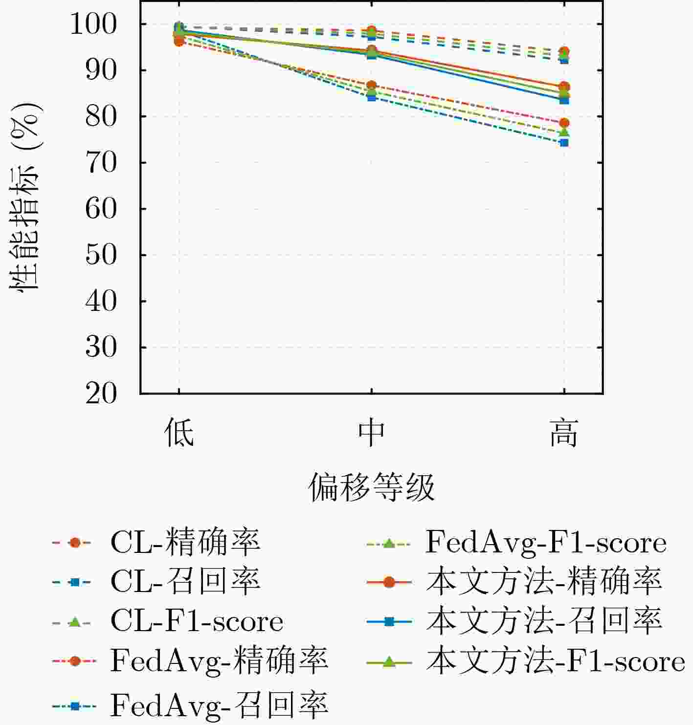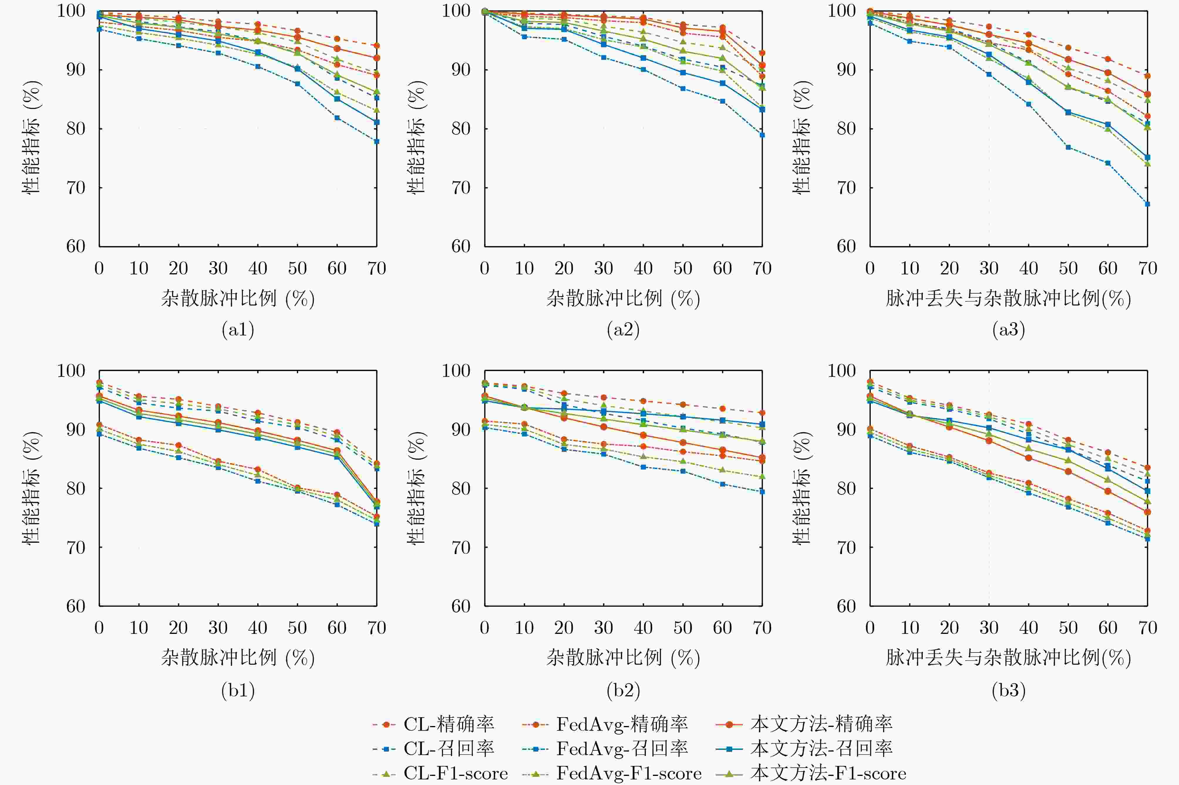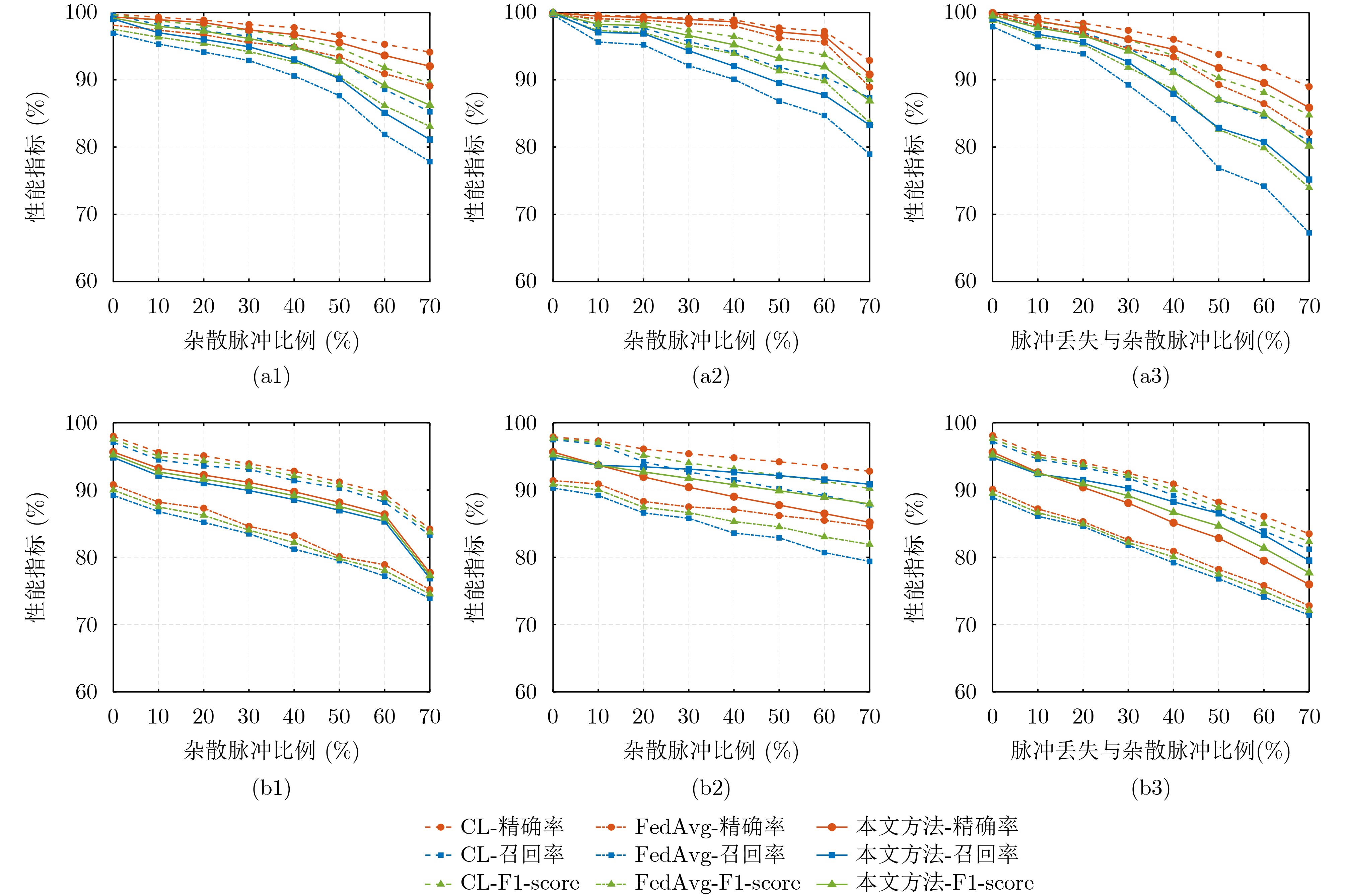 数据集 模型对照 精确率/% 召回率/% F1-Score/% 核心集 CL 97.39 97.21 97.29 FedAvg 95.60 95.94 95.75 本文方法 96.51 96.35 96.42 相对CL -0.88 -0.86 -0.87 相对FedAvg +0.91 +0.41 +0.67 扩展集 CL 90.92 90.98 90.95 FedAvg 81.24 80.38 79.89 本文方法 83.69 83.81 83.75 相对CL -7.23 -7.17 -7.20 相对FedAvg +2.45 +3.43 +3.86 -