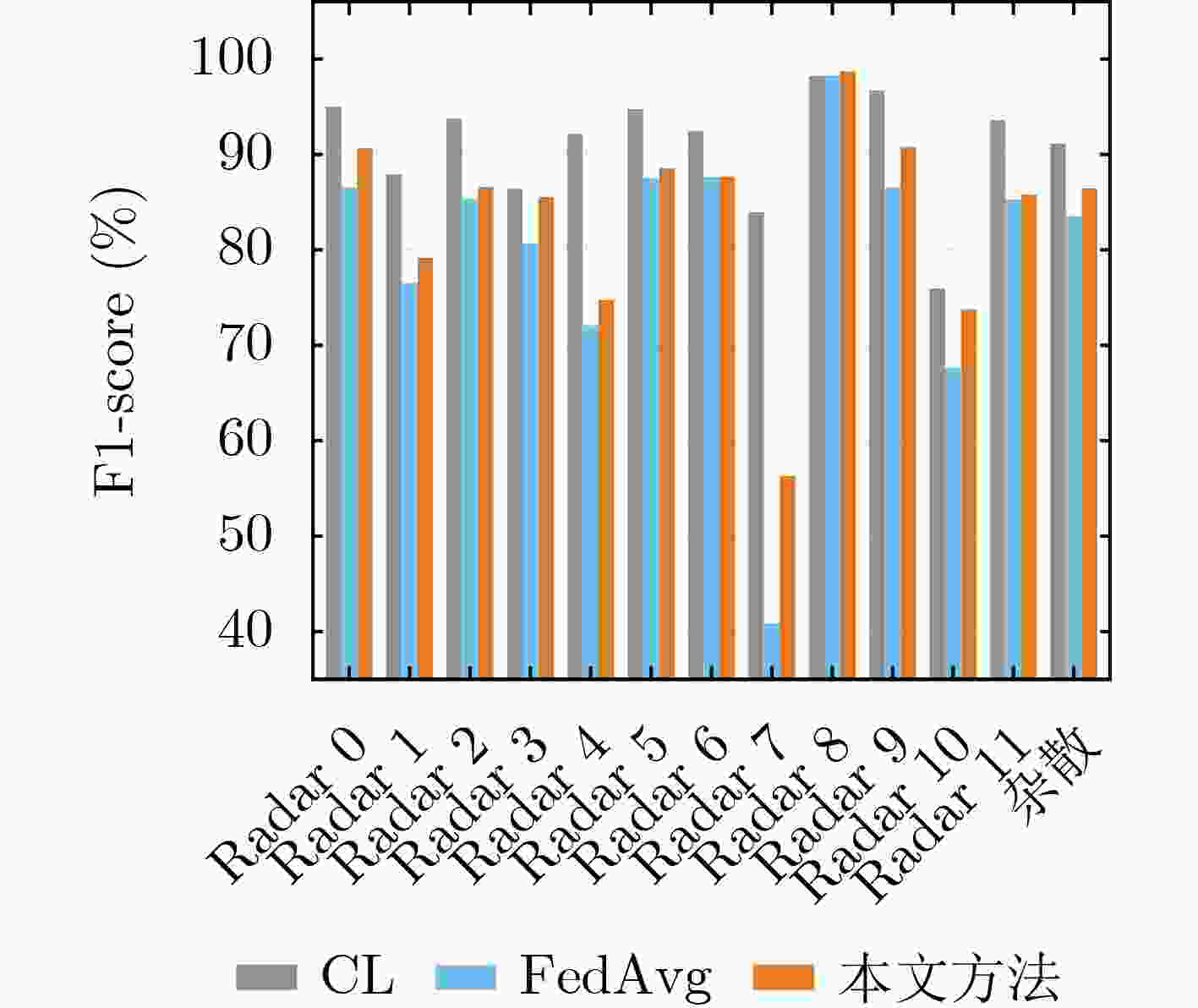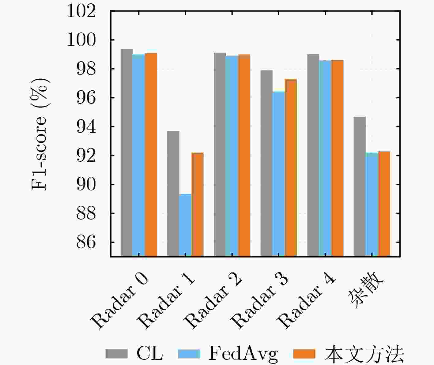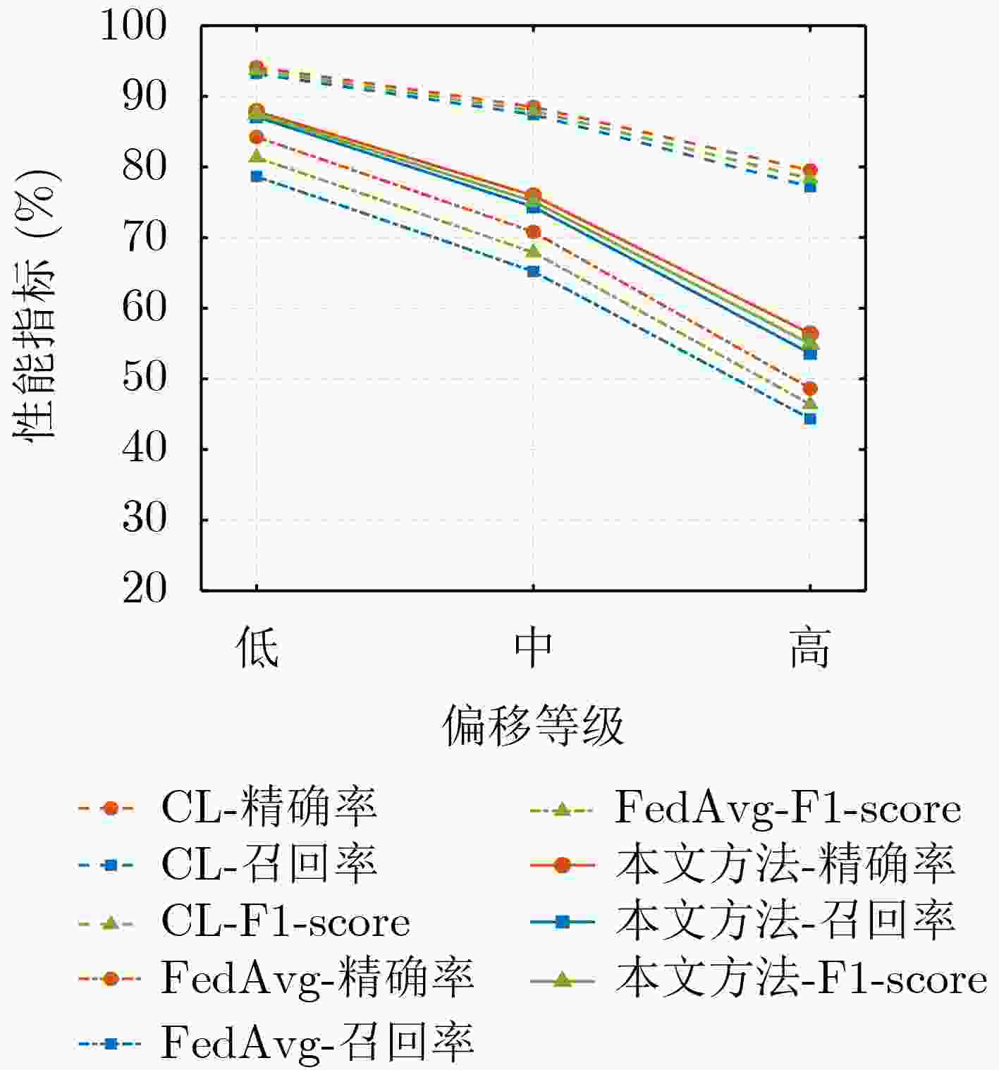 数据集 模型对照 精确率/% 召回率/% F1-Score/% 核心集 CL 97.39 97.21 97.29 FedAvg 95.60 95.94 95.75 本文方法 96.51 96.35 96.42 相对CL -0.88 -0.86 -0.87 相对FedAvg +0.91 +0.41 +0.67 扩展集 CL 90.92 90.98 90.95 FedAvg 81.24 80.38 79.89 本文方法 83.69 83.81 83.75 相对CL -7.23 -7.17 -7.20 相对FedAvg +2.45 +3.43 +3.86 -