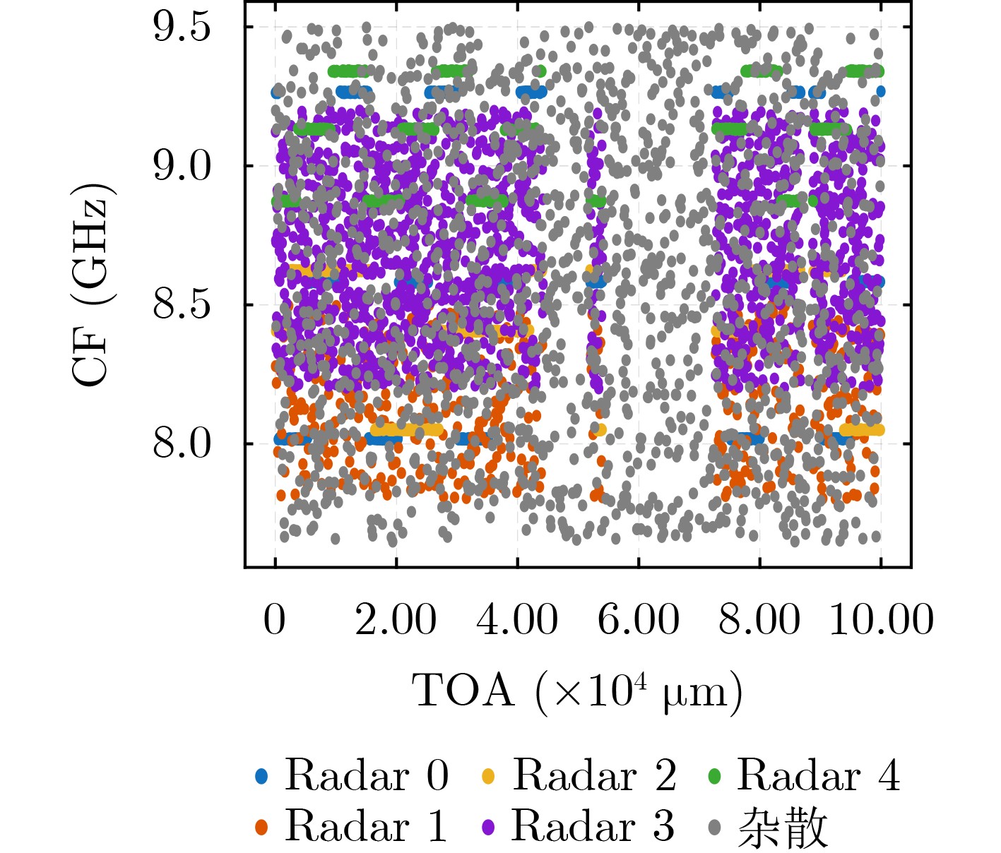 编号 TOA/ns CF/MHz 编号 TOA/ns CF/MHz S0 5.0 1.0 S0 2.0 1.0 S1 10.0 0.5 S1 12.0 0.5 S2 50.0 5.0 S2 17.0 5.0 S3 23.0 2.0 S4 28.0 3.0 S5 10.0 0.8 S6 5.0 0.6 S7 3.0 0.4 S8 50.0 4.0 表 4 分选性能指标对比