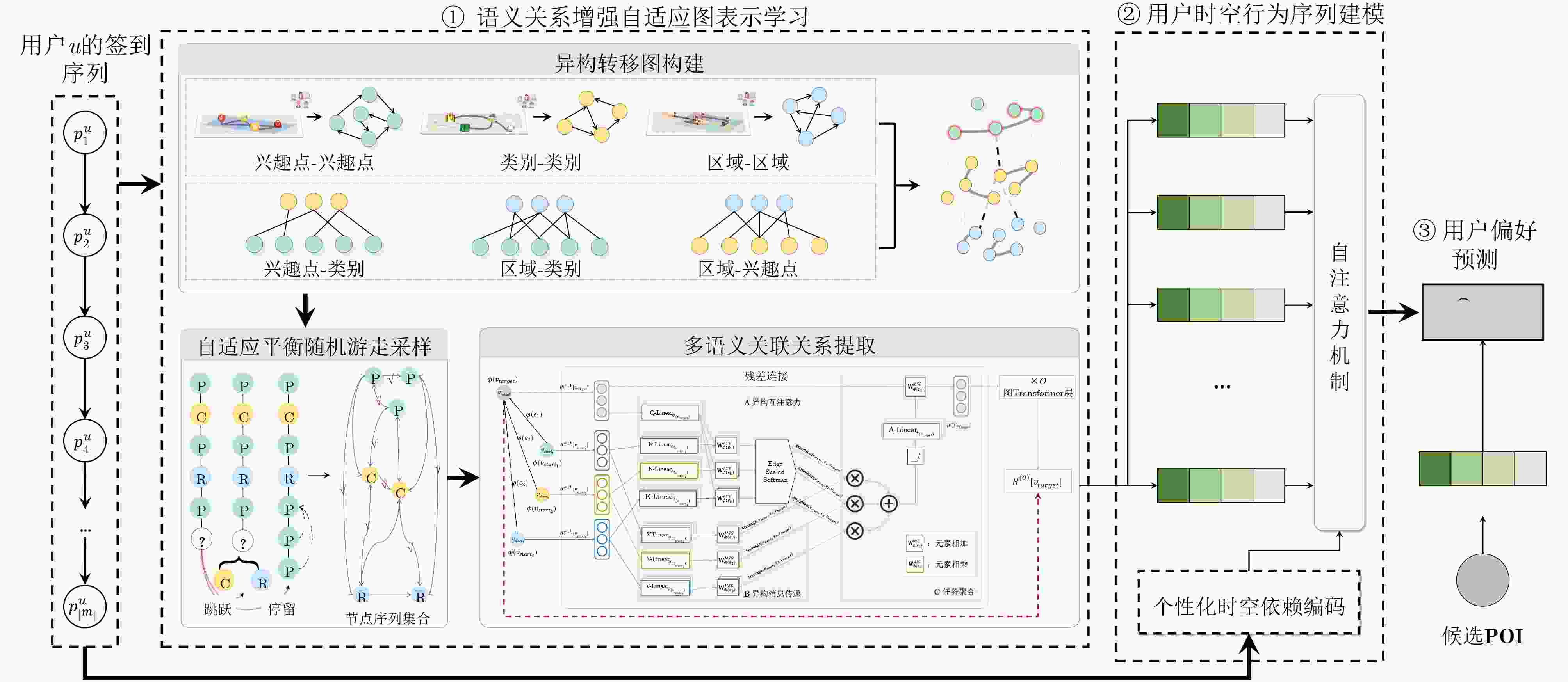 Objective In recent years, next point of interest (POI) recommendation has played an increasingly significant role in location-based social networks (LBSNs). However, existing graph representation learning–based recommendation methods struggle to effectively balance node distributions across different domains (i.e., node types) and often overlook the feature discrepancies among heterogeneous relations. As a result, they fail to fully exploit the complex semantic dependencies among contextual information when capturing users’ temporal preference patterns. Methods To address the above issues, we propose a next POI recommendation method based on semantic relation–enhanced adaptive graph representation learning (SR-GRL). A heterogeneous transition graph is constructed to integrate three entity types—POIs, POI categories, and regions—and their complex interrelationships. An adaptive balanced random walk sampling strategy is designed to dynamically balance node distributions across different domains and alleviate information redundancy. A type-aware attention mechanism is then employed to construct a relation transition matrix from the sampled node sequences, enabling the model to capture semantic associations among nodes and effectively distinguish feature discrepancies across diverse node types. The obtained disentangled POI representations are used to perform spatiotemporal encoding of user check-in sequences, and a self-attention mechanism aggregates users’ temporal preference features. Finally, the next POI recommendation is produced via a Softmax function. Results and Discussions Experiments on the Foursquare datasets (Tokyo and New York) and the Sina Weibo dataset (Shanghai) show that, compared with state-of-the-art baselines, SR-GRL method achieves Recall@10 improvements of 2.22%~24.16%, F1@10 improvements of 1.16%~10.48%, and NDCG@10 improvements of 3.01%~17.37%, demonstrating superior recommendation performance. Conclusions Overall, the semantic relation–enhanced adaptive graph representation learning approach can dynamically balance the distributions of different node types and substantially strengthens the modeling of complex semantic dependencies among heterogeneous contextual information. -