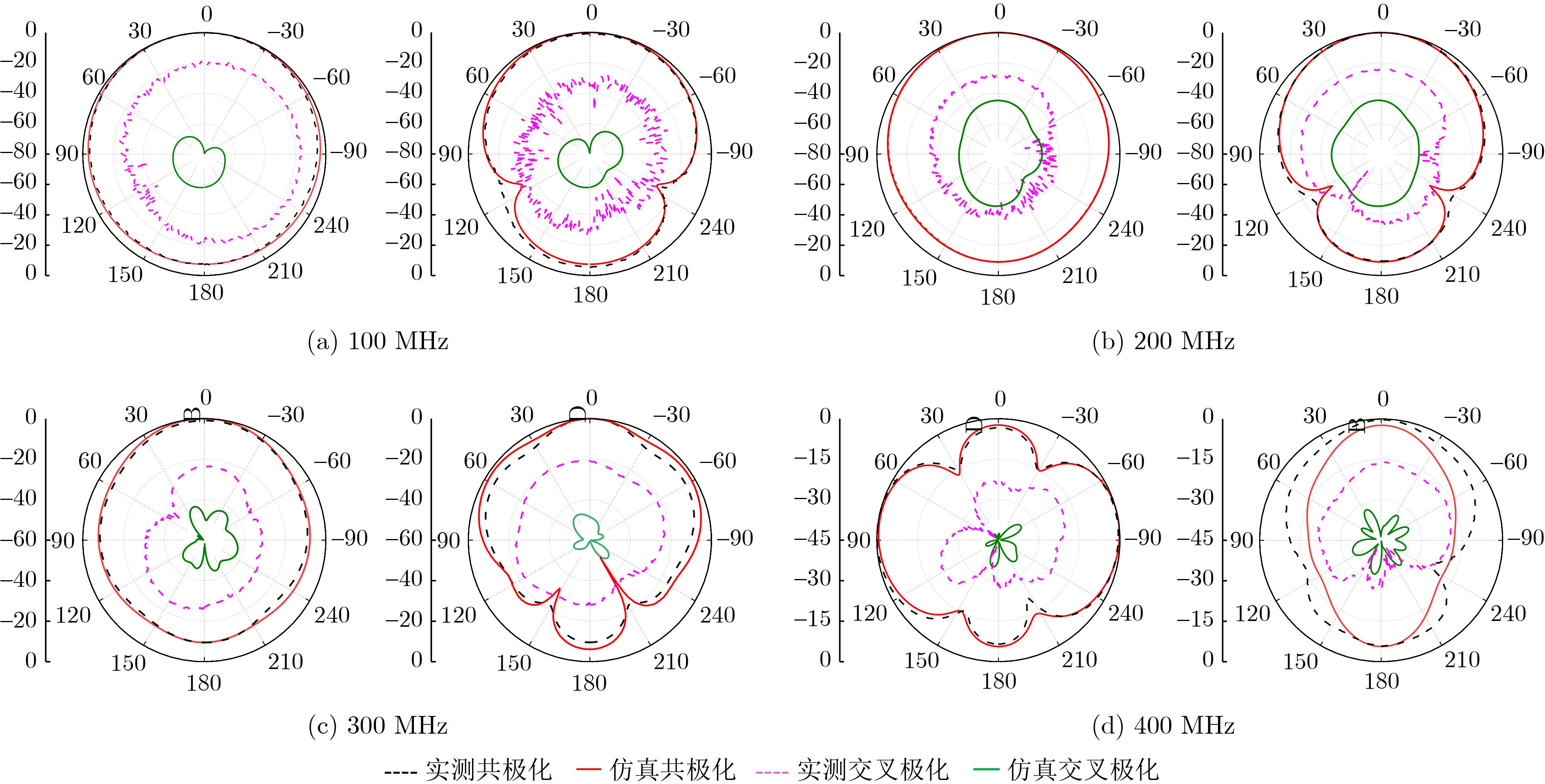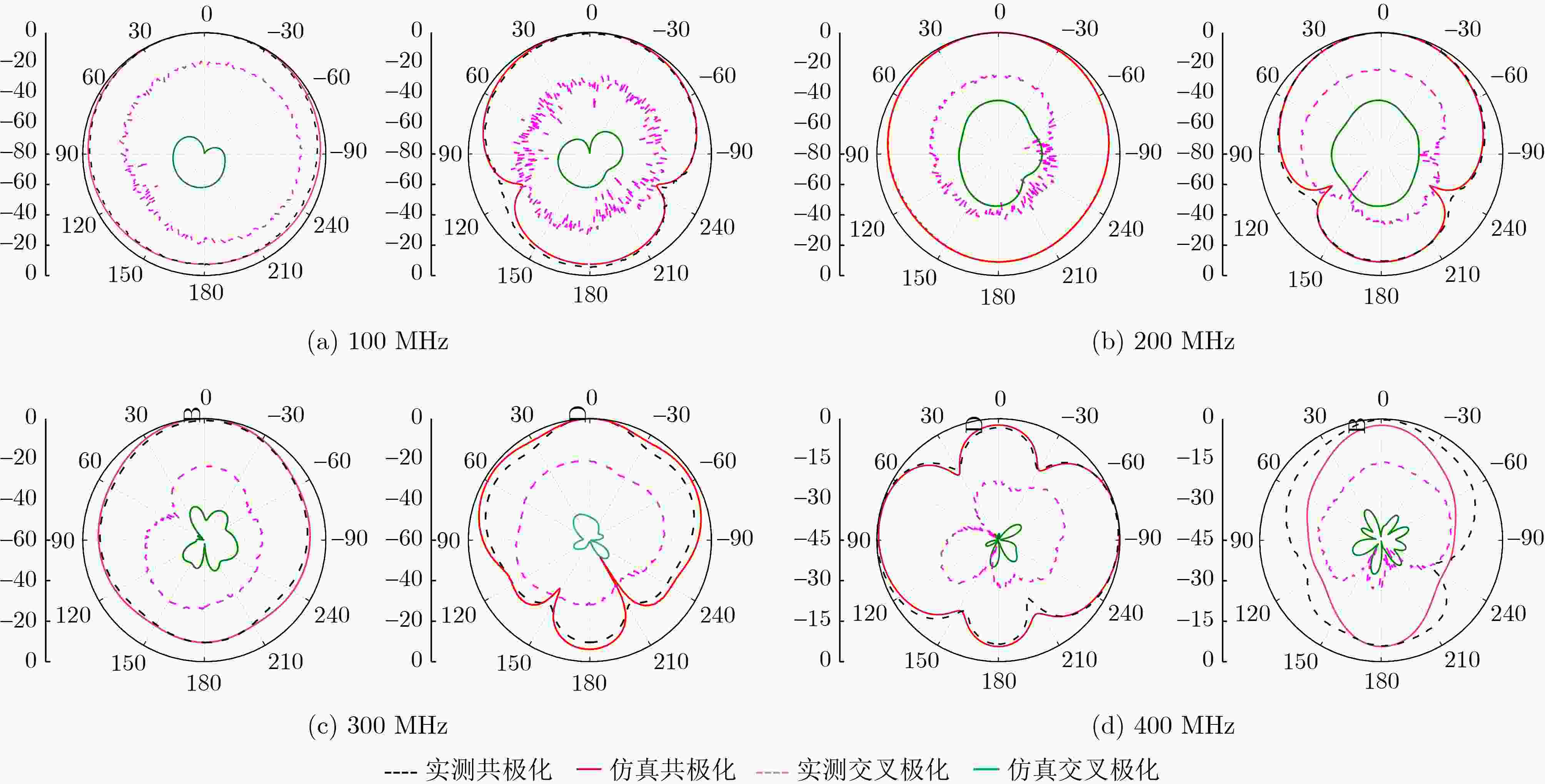 Objective In radar systems, the limitations of traditional narrowband antennas in terms of data transmission rate and resolution have become increasingly apparent. Consequently, a wide variety of ultra-wideband (UWB) antennas have been proposed, exhibiting excellent range resolution and strong anti-interference capability. However, at low-frequency bands, existing UWB antennas often suffer from excessively large physical dimensions, which makes antennas bulky while ensuring mechanical strength and posing significant challenges for airborne or vehicle-mounted radar assembly. However, compact antennas that are easy to install suffer from low gain, which fails to meet the penetration depth requirements for deep subsurface detection. Balancing antenna size and radiation gain over an ultra-wideband range to fulfill the needs of VHF wideband probing radars remains a critical challenge. To jointly optimize bandwidth, size, and gain, this paper presents a planar dipole antenna loaded with an artificial magnetic conductor (AMC) structure and metallic shorting walls. The proposed antenna achieves stable radiation performance over a wide frequency range while maintaining a low-profile configuration and a structurally simple design. As a result, it provides an effective solution for VHF-band detection radar antennas. Methods By comparing the reflection phase characteristics of AMC unit cells with different geometrical shapes, square-shaped unit cells were selected to form a 9×7 AMC reflective layer. Owing to its in-phase reflection property, the AMC structure overcomes the conventional limitation that requires a quarter-wavelength separation between the antenna and a metallic ground plane, thereby significantly reducing the antenna profile height. The dipole patch employs an optimized meandered current-bending technique, which effectively reduces the horizontal size of the antenna. Meanwhile, metallic shorting walls are vertically loaded at both ends of the antenna. According to the image theory, equivalent currents will be generated on the outer surface of the metal walls when the antenna operates, thereby effectively extending the equivalent electrical length, leading to improved low-frequency performance without increasing the physical size. In addition, two vertical metallic walls are connected to the ground plane on both sides of the antenna, jointly forming a reflective back cavity. This structure enhances the unidirectional radiation characteristic and improves the antenna gain. As a systematic co-design to break the physical constraints, four 125-Ω resistors are bridged between the antenna feed point and the metallic sidewalls. This resistive loading effectively suppresses low-frequency strong resonances and broadens the impedance bandwidth at the cost of acceptable Ohmic losses. Results and Discussions A prototype antenna with favorable simulated performance was fabricated and measured in a microwave anechoic chamber. The measured impedance bandwidth (VSWR < 2) ranges from 50 MHz to 400 MHz, which agrees well with the simulated bandwidth of 84 MHz to 366MHz. The measured impedance matching performance is slightly better than the simulated result, mainly due to the reduced reflections caused by cable losses and power divider losses in the feeding network. The measured antenna gain follows the same trend as the simulated gain, with deviations within an acceptable range of 1dBi. Radiation pattern measurements demonstrate that at 100 MHz, 200 MHz, and 300 MHz, the measured co-polarization patterns agree well with the simulated results, and the maximum radiation direction is consistently normal to the antenna plane, validating the effectiveness of the proposed antenna design. As shown in figure 5, on the radiating patch layer, the current mainly flows along the +x direction, thereby generating a radiating electric field along the +z direction. The current distribution on the AMC unit can be equivalent to a current loop oriented along the +z direction. At this frequency, the x-direction current and the parasitic current loop of the AMC jointly enhance the radiation gain of the antenna. This proves the mechanism by which the AMC structure improves antenna gain. However, when the operating frequency increases to 400 MHz, the electrical size of the antenna reaches approximately $ 1.6\lambda $, resulting in main lobe splitting and a shift of the maximum radiation direction toward 90°. Although high-frequency beam splitting introduces spatial clutter, it is a reasonable physical trade-off for achieving the 0.07 λL ultra-low profile, and the overall UWB characteristics still provide high time-domain resolution for detection radar systems. At 400 MHz, the measured H-plane co-polarization level is slightly higher than the simulated result, which may be attributed to the coupling effect between the feeding cable and the vertically mounted antenna. Conclusions This paper proposes a low-profile ultra-wideband planar dipole antenna. By introducing an AMC layer and resistive loading, the impedance matching performance is significantly improved while maintaining a compact antenna size. In addition, a reflective back cavity is incorporated to enhance backward reflection, thereby increasing the realized antenna gain. A prototype of the proposed antenna was fabricated and experimentally characterized, and the measured results show good agreement with the simulations. The antenna achieves a measured impedance bandwidth of 100 MHz–366 MHz under the condition of VSWR < 2, while maintaining a compact size of 0.38λL × 0.18λL × 0.07λL. The maximum measured gain within the operating band reaches 6 dBi. This co-design demonstrates a comprehensive advantage in balancing key performance indicators such as wide bandwidth, low profile and relatively high gain, providing a practical and valuable implementation approach for the engineering design of low-frequency band detection radar antennas. -