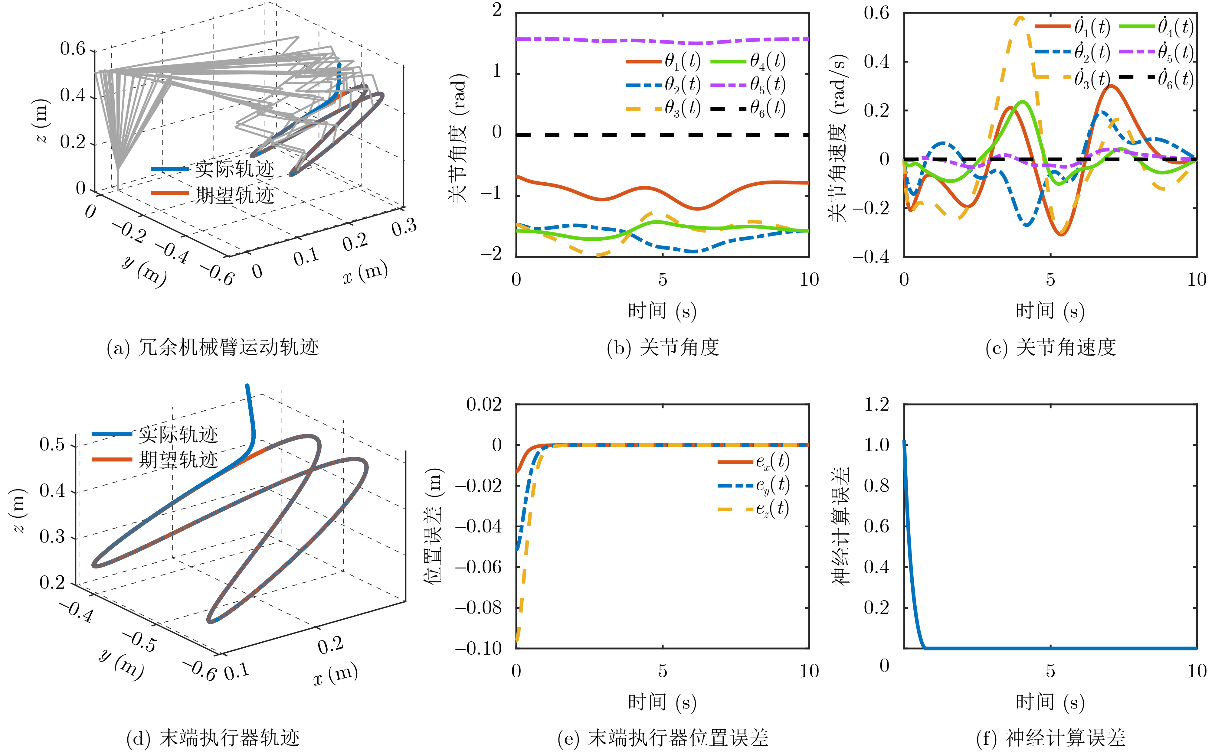 Objective  The computational performance of Zeroing Neural Networks (ZNNs) is enhanced by introducing additional power terms into the activation function. However, this strategy complicates the derivation of explicit settling time expressions. To address this issue, a triple power-rate activation function is designed, and a power-rate speeding-up noise-tolerant terminal ZNN is constructed, through which an exact expression for the settling time is derived. In previous studies, the optimization criterion parameter for repetitive motion planning was typically constant, which may reduce the operational efficiency of robotic manipulators. To overcome this limitation, a time-varying parameter optimization criterion is developed to satisfy task requirements at different stages of repetitive motion planning, thereby improving the operational efficiency of redundant robotic manipulators during task execution.  Methods  A triple power-rate activation function is proposed, extending the conventional bi-power activation function, and a power-rate speeding-up noise-tolerant terminal ZNN is constructed. The convergence process under different parameter settings is analyzed, and explicit settling time expressions are derived. Theoretical analysis confirms that the proposed neural network can effectively suppress vanishing noise. For the repetitive motion planning problem of redundant manipulators, the power-rate speeding-up noise-tolerant terminal ZNN is employed as a solver to ensure acquisition of the desired end-effector trajectory within fixed time. To address the limitations of constant-parameter optimization criteria in repetitive motion planning, a time-varying parameter optimization criterion is designed, which demonstrably improves the operational efficiency of redundant manipulators.  Results and Discussions  In this study, the power-rate speeding-up noise-tolerant terminal ZNN is employed together with bi-power-rate terminal ZNNs to solve time-varying quadratic programming problems. Simulation results show that the proposed power-rate speeding-up noise-tolerant terminal ZNN achieves a faster convergence rate (Fig.2(a), Fig.2(b)) and demonstrates improved capability in suppressing vanishing noise (Fig.2(c)). The convergence process of neural computational error under different parameter conditions is analyzed without noise (Fig 3). Furthermore, the power-rate speeding-up noise-tolerant terminal ZNN is applied to the repetitive motion planning problem of redundant manipulators. Its effectiveness in solving repetitive motion planning is validated (Fig. 4), and the integration of a time-varying parameter optimization criterion further enhances the operational efficiency of redundant manipulators (Fig. 5).  Conclusions  A power-rate speeding-up noise-tolerant terminal ZNN is proposed for solving time-varying quadratic programming problem with time-varying equality constraints, ensuring fixed time convergence of neural computing errors. Compared with conventional bi-power-rate terminal ZNNs, the proposed network achieves faster convergence and stronger noise-tolerance performance. To address the limitations of constant-parameter optimization criteria in repetitive motion planning, a time-varying parameter optimization criterion is designed and shown to improve the operational efficiency of redundant manipulators.