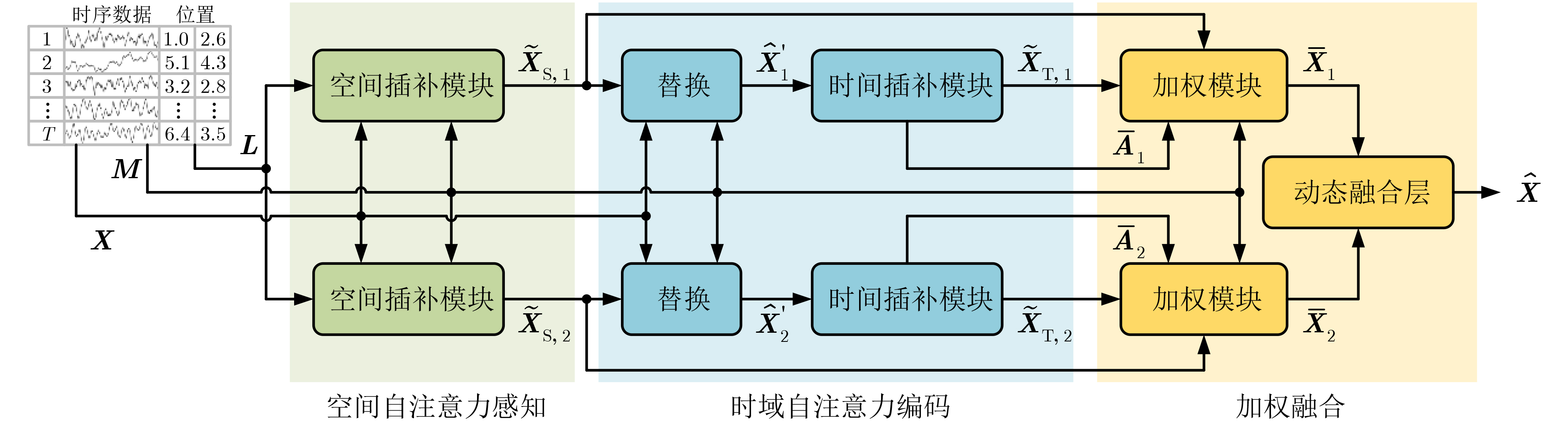 Objective  Multivariate time series data, characterized by their high dimensionality and temporal dynamics, are widely generated across diverse application domains, including healthcare monitoring, industrial sensor networks, and autonomous systems. However, these data are often subject to severe missingness caused by sensor malfunctions, transmission errors, or environmental disturbances, which obscures critical spatiotemporal patterns and hinders downstream analytical tasks such as anomaly detection, predictive maintenance, and decision support. Existing imputation methods, ranging from statistical approaches to machine learning models, are primarily tailored to low missing-rate scenarios. When applied to high missing-rate conditions, they face challenges such as gradient vanishing during model training, insufficient capture of spatiotemporal dependencies, and limited ability to represent complex nonlinear features, with performance deteriorating sharply as the missing rate increases. To address these limitations, this study proposes the Spatial Self-Attention Incorporated Imputation algorithm (SSAImpute), designed to enhance imputation performance specifically under severely missing conditions.  Methods  The proposed SSAImpute algorithm adopts a dual-branch Siamese architecture with adversarial fusion. Each branch comprises two core modules: a spatial self-attention-aware module and a subsequent temporal self-attention encoding module. The spatial self-attention-aware module constructs a dynamic adjacency matrix from the geolocations of data sources to explicitly quantify inter-variable spatial relationships. These spatial dependencies are then integrated with temporal features to strengthen sequence correlation modeling and enrich feature representations with embedded spatial information. The temporal self-attention encoding module employs a multi-dimensional residual attention mechanism with bidirectional temporal dependency learning. A missing-aware positional encoding scheme and a mask-adaptive self-attention mechanism are incorporated to effectively capture temporal dependencies and feature correlations, thereby mitigating severe missingness and alleviating the vanishing gradient problem. The two Siamese branches are fused through adversarial learning and dynamic weighting, which jointly refine the final imputation results. To evaluate the performance of SSAImpute against competing methods, three conventional metrics are used: Mean Absolute Error (MAE), Root Mean Square Error (RMSE), and Mean Relative Error (MRE).  Results and Discussions  Extensive experiments are conducted on four public datasets—Inter-Sensor, PeMS04, PeMS07, and PeMS11, in comparison with seven state-of-the-art time series imputation models: Mean, Median, K-Nearest Neighbor (KNN), Multi-directional Recurrent Neural Network (M-RNN), Bidirectional Recurrent Imputation for Time Series (BRITS), Transformer, and Self-Attention-based Imputation for Time Series (SAITS). The results show that the proposed method consistently improves imputation accuracy across all datasets, even under severe missingness. On the Inter-Sensor dataset, SSAImpute demonstrates superior performance compared with all competing methods. For all four time series, SSAImpute outperforms the others across all evaluation metrics, with improvements over the best-performing baseline (SAITS) of 15.9% in MAE, 0.19% in RMSE, and 16.6% in MRE for temperature; 11.1% in MAE, 1.04% in RMSE, and 13.2% in MRE for humidity; 9.8% in MAE, 10.2% in RMSE, and 24.3% in MRE for light; and 8.8% in MAE, 0.4% in RMSE, and 8.8% in MRE for voltage. On the PeMS datasets, SSAImpute also exceeds all competing methods across PeMS04, PeMS07, and PeMS11. The achieved MAE, RMSE, and MRE are 0.203, 0.328, and 22.4% for PeMS04; 0.153, 0.274, and 17.5% for PeMS07; and 0.180, 0.282, and 19.3% for PeMS11, respectively. The performance under different missing-ratio scenarios is further investigated. Although accuracy decreases exponentially with higher missingness, SSAImpute consistently outperforms the three strongest baselines (Fig. 6). Visualization of the imputed time series further verifies its effectiveness, with reconstructed values closely aligned with the ground truth (Fig. 7). These findings confirm the contributions of the spatial self-attention-aware module, the temporal self-attention encoding module, and the adversarial learning with dynamic weighting mechanism.  Conclusions  This study proposes a spatial self-attention-incorporated imputation method for severely missing multivariate time series data, built on a dual-branch Siamese framework. Each branch integrates a spatial self-attention-aware module, which incorporates geolocation information of the data source, followed by a temporal self-attention encoding mechanism to capture contextual dependencies. These modules jointly strengthen feature extraction of spatiotemporal dependencies, enabling more accurate reconstruction under high missingness. The proposed method provides a robust data foundation for downstream data-driven analysis and decision-making tasks in real-world applications.