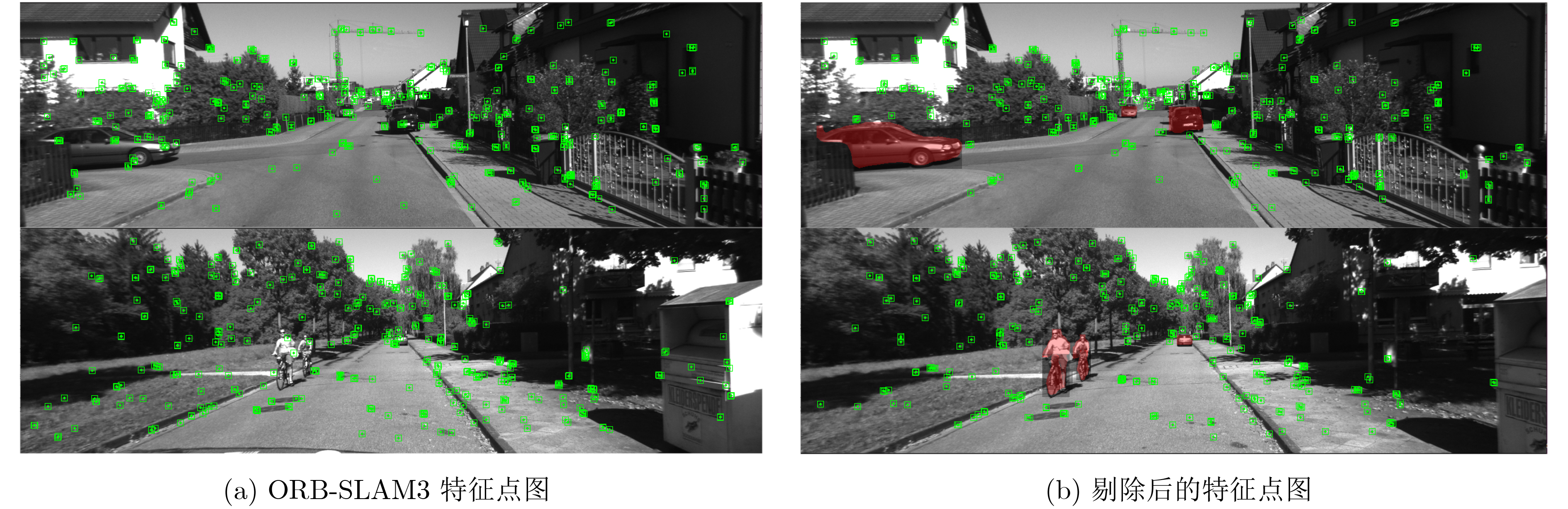 Objective  In complex dynamic environments such as industrial parks and urban roads, inspection robots depend heavily on visual Simultaneous Localization And Mapping (SLAM) systems. However, the presence of moving objects often causes feature drift and map degradation, reducing SLAM performance. Furthermore, conventional semantic segmentation models typically require extensive computational resources, rendering them unsuitable for embedded platforms with limited processing capabilities, thereby constraining SLAM deployment in autonomous inspection tasks. To address these challenges, this study proposes a lightweight semantic visual SLAM framework designed for inspection robots operating in dynamic environments. The framework incorporates a semantic segmentation-based dynamic feature rejection method to achieve real-time identification of dynamic regions at low computational cost, thereby improving SLAM robustness and mapping accuracy.  Methods  Building upon the 11th generation lightweight YOLO segmentation model (YOLOv11n-seg), a systematic lightweight redesign is implemented. to enhance performance under constrained computational resources. First, the original neck is replaced with DyCANet, a lightweight multi-scale feature fusion module that integrates dynamic point sampling and channel attention to improve semantic representation and boundary segmentation. DyCANet combines DySample, a dynamic upsampling operator that performs content-aware spatial sampling with minimal overhead, and ChannelAttention_HSFPN, a hierarchical attention structure that strengthens multi-scale integration and highlights critical semantic cues, particularly for small or occluded objects in complex scenes. Second, a Dynamic Convolution module (DynamicConv) is embedded into all C3k2 modules to enhance the adaptability and efficiency of feature extraction. Inspired by the Mixture-of-Experts framework, DynamicConv applies a conditional computation mechanism that dynamically adjusts kernel weights based on the input feature characteristics. This design allows the network to extract features more effectively across varying object scales and motion patterns, improving robustness against dynamic disturbances with low computational cost. Third, the original segmentation head is replaced by the Reused and Shared Convolutional Segmentation Head (RSCS Head), which enables decoder structure sharing across multi-scale branches. RSCS reduces redundant computation by reusing convolutional layers and optimizing feature decoding paths, further improving overall model efficiency while maintaining segmentation accuracy. These architectural modifications result in DHSR-YOLOSeg, a lightweight semantic segmentation model that significantly reduces parameter count and computational cost while preserving performance. DHSR-YOLOSeg is integrated into the tracking thread of ORB-SLAM3. to provide real-time semantic information. This enables dynamic object detection and the removal of unstable feature points during localization, thereby enhancing the robustness and trajectory consistency of SLAM in complex dynamic environments.  Results and Discussions  Ablation experiments on the COCO dataset demonstrate that, compared with the baseline YOLOv11n-seg, the proposed DHSR-YOLOSeg achieves a 13.8% reduction in parameter count, a 23.1% decrease in Giga Floating Point Operations (GFLOPs), and its Average Precision at IoU 0.5 (mAP50) is the sameas the baseline YOLOv11n-seg’s (Table 1). On the KITTI dataset, DHSR-YOLOSeg reaches an inference speed of 60.19 frame/s, which is 2.14% faster than YOLOv11n-seg and 275% faster than the widely used Mask R-CNN (Table 2). For trajectory accuracy evaluation on KITTI sequences 00~10, DHSR-YOLOSeg outperforms ORB-SLAM3 in 8 out of 10 sequences, achieving a maximum Root Mean Square Error (RMSE) reduction of 16.76% and an average reduction of 8.78% (Table 3). Compared with DynaSLAM and DS-SLAM, the proposed framework exhibits more consistent error suppression across sequences, improving both trajectory accuracy and stability. In terms of runtime efficiency, DHSR-YOLOSeg achieves an average per-frame processing time of 48.86 ms on the KITTI dataset, 18.55% and 41.38% lower than DS-SLAM and DynaSLAM, respectively (Table 4). The per-sequence processing time ranges from 41 to 55 ms, which is comparable to the 35.64 ms of ORB-SLAM3, indicating that the integration of semantic segmentation introduces only a modest computational overhead.  Conclusions  This study addresses the challenge of achieving robust localization for inspection robots operating in dynamic environments, particularly in urban road settings characterized by frequent interference from pedestrians, vehicles, and other moving objects. To this end, a semantic-enhanced visual SLAM framework is proposed, in which a lightweight semantic segmentation model, DHSR-YOLOSeg, is integrated into the stereo-based ORB-SLAM3 pipeline. This integration enables real-time identification of dynamic objects and removal of their associated feature points, thereby improving localization robustness and trajectory consistency. The DHSR-YOLOSeg model incorporates three key architectural components—DyCANet for feature fusion, DynamicConv for adaptive convolution, and the RSCS Head for efficient multi-scale decoding. Together, these components reduce the model’s size and computational cost while preserving segmentation performance, providing an efficient and deployable perception solution for resource-constrained platforms. Experimental findings show that: (1) ablation tests on the COCO dataset confirm substantial reductions in complexity with preserved accuracy, supporting embedded deployment; (2) frame rate comparisons on the KITTI dataset demonstrate superior performance over both lightweight and standard semantic segmentation methods, meeting real-time SLAM requirements; (3) trajectory evaluations indicate that the dynamic feature rejection strategy effe
