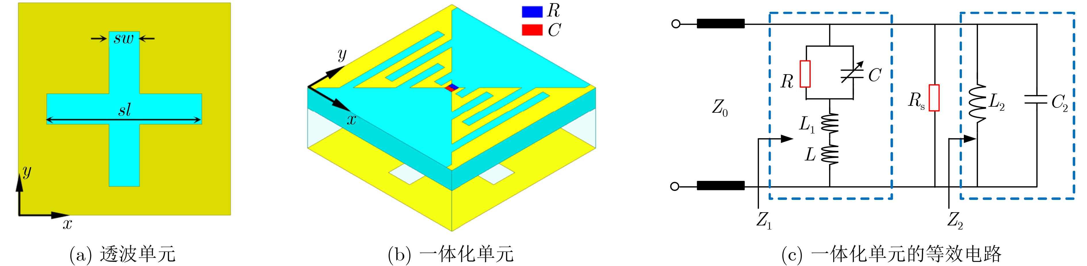 Objective  Frequency Selective Surfaces (FSS), as artificial ElectroMagnetic (EM) periodic structures, regulate the transmission and reflection of EM waves. Radomes integrating FSS can protect antennas, preserve the aerodynamic profile of radio-frequency systems, shape spatial scattering field distributions, and suppress backward Radar Cross Section (RCS). However, when illuminated by multiple radars, such radomes often fail to maintain low detectability due to their inability to achieve bistatic low RCS. Recent efforts have focused on developing absorptive structures based on FSS, where active FSS-based absorbers offer adaptive tunability across frequency and time domains. Nonetheless, achieving absorption in the P-band remains challenging due to the inherent limitations of existing dielectric materials. While FSS bandpass properties are frequently employed in radomes and the tunability of active FSS supports the design of reconfigurable absorbers, the two functionalities have largely been pursued independently, resulting in limited multifunctional surface designs. This study proposes a P-band ultra-thin absorber using FSS composed of cascaded unit cells with gradually curved meander lines. By exploiting the distinct equivalent circuit characteristics of absorbing and transmitting FSS structures, an integrated system is developed that enables both EM wave transmission and tunable wideband absorption in the P-band.  Methods  This paper proposes a novel design method for a dual-polarized, ultra-thin absorptive-transmissive EM surface element operating in the P-band, based on the FSS technique. The method uses cascaded elements with a gradient-bending structure to increase the effective current path length and incorporates lumped components to achieve wideband tunable absorption at low frequencies. By analyzing the equivalent circuit characteristics of both absorptive and transmissive FSS-based elements, an integrated absorptive-transmissive structure is developed. The difference in their equivalent circuits effectively suppresses mutual coupling, enabling the relatively independent design of absorptive and transmissive functions. To demonstrate this approach, a dual-polarized ultra-thin EM surface element is designed that simultaneously exhibits high transmittance and tunable wideband absorptivity. The step-by-step design process is presented, and the operating mechanism of the proposed element is thoroughly analyzed.  Results and Discussions  Both simulation and experimental results confirm that the proposed integrated element achieves dual-polarized absorptive performance in the P-band and dual-polarized transmissive performance in the C-band. The element features an ultra-thin profile, requires few lumped components, and exhibits a broad operational bandwidth. Notably, the proposed method combines equivalent circuit modeling with field-based analysis to facilitate the design of multifunctional EM surfaces, thereby streamlining the integration of absorptive and transmissive functionalities within a single structure.  Conclusions  Structural absorbers face a fundamental trade-off between achieving efficient low-frequency absorption and maintaining a low profile or lightweight design, making the development of P-band absorbing surfaces particularly challenging. FSS, commonly used in radomes, also offer potential for tunable absorber design. This study integrates both functionalities to develop a multifunctional EM surface capable of simultaneous wave absorption and transmission, based on an FSS architecture. When irradiated from one direction, the surface achieves absorptivity above 0.9 across 0.34~1.1 GHz. When irradiated from the opposite direction, it exhibits transmittivity exceeding 0.8 over 4.26~4.48 GHz. These two functions operate with relative independence. The proposed structure features a wide operational bandwidth, ultra-thin profile, and minimal reliance on electronic components. The method enables not only effective P-band absorption but also the integrated design of multifunctional EM surfaces. It offers strong scalability and holds significant potential for future applications.