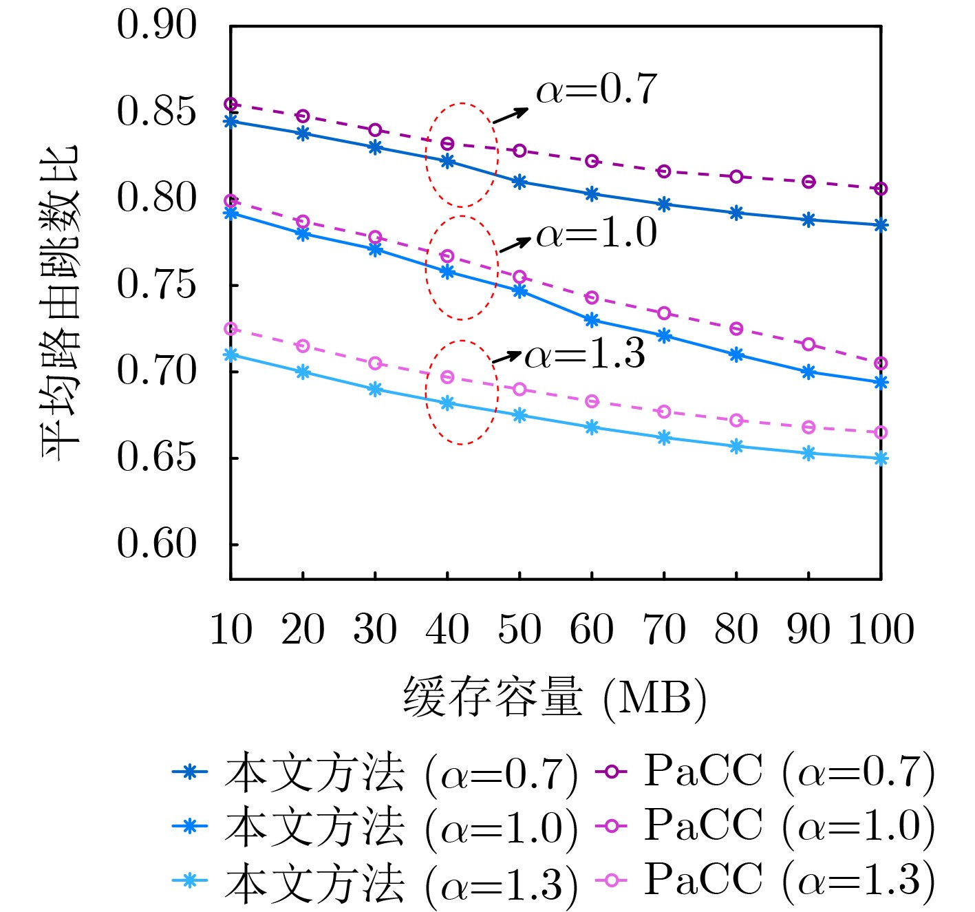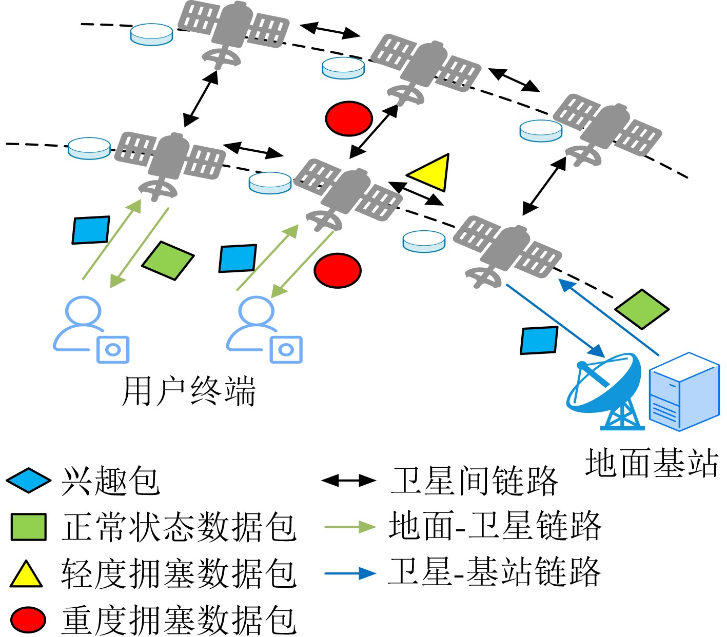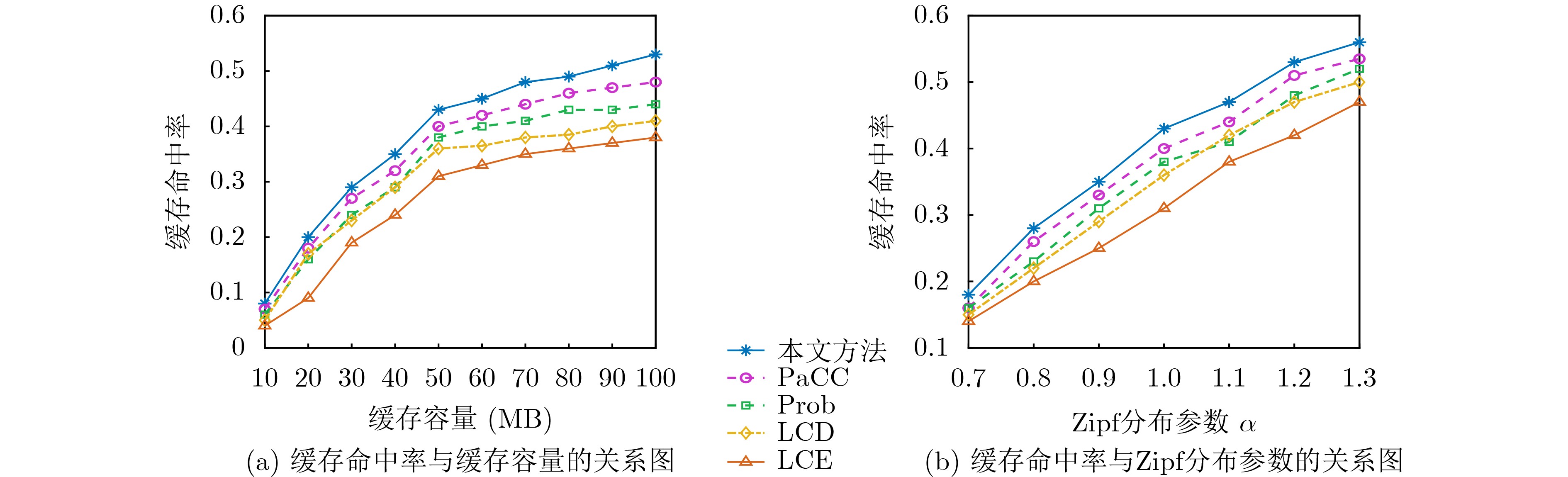 Objective Low Earth Orbit (LEO) satellite networks are central to future space-air-ground integrated systems, offering global coverage and low-latency communication. However, their high-speed mobility leads to rapidly changing topologies, and strict onboard cache constraints hinder efficient content delivery. Existing caching strategies often overlook real-time network congestion and content attributes (e.g., freshness), which leads to inefficient resource use and degraded Quality of Service (QoS). To address these limitations, we propose an adaptive cache placement strategy based on congestion awareness. The strategy dynamically couples real-time network conditions, including link congestion and latency, with a content value assessment model that incorporates both popularity and freshness.This integrated approach enhances cache hit rates, reduces backhaul load, and improves user QoS in highly dynamic LEO satellite environments, enabling efficient content delivery even under fluctuating traffic demands and resource constraints. Methods The proposed strategy combines a dual-threshold congestion detection mechanism with a multi-dimensional content valuation model. It proceeds in three steps. First, satellite nodes monitor link congestion in real time using dual latency thresholds and relay congestion status to downstream nodes through data packets. Second, a two-dimensional content value model is constructed that integrates popularity and freshness. Popularity is updated dynamically using an Exponential Weighted Moving Average (EWMA), which balances historical and recent request patterns to capture temporal variations in demand. Freshness is evaluated according to the remaining data lifetime, ensuring that expired or near-expired content is deprioritized to maintain cache efficiency and relevance. Third, caching thresholds are adaptively adjusted according to congestion level, and a hop count control factor is introduced to guide caching decisions. This coordinated mechanism enables the system to prioritize high-value content while mitigating congestion, thereby improving overall responsiveness and user QoS. Results and Discussions Simulations conducted on ndnSIM demonstrate the superiority of the proposed strategy over PaCC (Popularity-Aware Closeness-based Caching), LCE (Leave Copy Everywhere), LCD (Leave Copy Down), and Prob (probability-based caching with probability = 0.5). The key findings are as follows. (1) Cache hit rate. The proposed strategy consistently outperforms conventional methods. As shown in Fig. 8, the cache hit rate rises markedly with increasing cache capacity and Zipf parameter, exceeding those of LCE, LCD, and Prob. Specifically, the proposed strategy achieves improvements of 43.7% over LCE, 25.3% over LCD, 17.6% over Prob, and 9.5% over PaCC. Under high content concentration (i.e., larger Zipf parameters), the improvement reaches 29.1% compared with LCE, highlighting the strong capability of the strategy in promoting high-value content distribution. (2) Average routing hop ratio. The proposed strategy also reduces routing hops compared with the baselines. As shown in Fig. 9, the average hop ratio decreases as cache capacity and Zipf parameter increase. Relative to PaCC, the proposed strategy lowers the average hop ratio by 2.24%, indicating that content is cached closer to users, thereby shortening request paths and improving routing efficiency. (3) Average request latency. The proposed strategy achieves consistently lower latency than all baseline methods. As summarized in Table 2 and Fig. 10, the reduction is more pronounced under larger cache capacities and higher Zipf parameters. For instance, with a cache capacity of 100 MB, latency decreases by approximately 2.9%, 5.8%, 9.0%, and 10.3% compared with PaCC, Prob, LCD, and LCE, respectively. When the Zipf parameter is 1.0, latency reductions reach 2.7%, 5.7%, 7.2%, and 8.8% relative to PaCC, Prob, LCD, and LCE, respectively. Concretely, under a cache capacity of 100 MB and Zipf parameter of 1.0, the average request latency of the proposed strategy is 212.37 ms, compared with 236.67 ms (LCE), 233.45 ms (LCD), 225.42 ms (Prob), and 218.62 ms (PaCC). Conclusions This paper presents a congestion-aware adaptive caching placement strategy for LEO satellite networks. By combining real-time congestion monitoring with multi-dimensional content valuation that considers both dynamic popularity and freshness, the strategy achieves balanced improvements in caching efficiency and network stability. Simulation results show that the proposed method markedly enhances cache hit rates, reduces average routing hops, and lowers request latency compared with existing schemes such as PaCC, Prob, LCD, and LCE. These benefits hold across different cache sizes and request distributions, particularly under resource-constrained or highly dynamic conditions, confirming the strategy’s adaptability to LEO environments. The main innovations include a closed-loop feedback mechanism for congestion status, dynamic adjustment of caching thresholds, and hop-aware content placement, which together improve resource utilization and user QoS. This work provides a lightweight and robust foundation for high-performance content delivery in satellite-terrestrial integrated networks. Future extensions will incorporate service-type differentiation (e.g., delay-sensitive vs. bandwidth-intensive services), and orbital prediction to proactively optimize cache migration and updates, further enhancing efficiency and adaptability in 6G-enabled LEO networks.