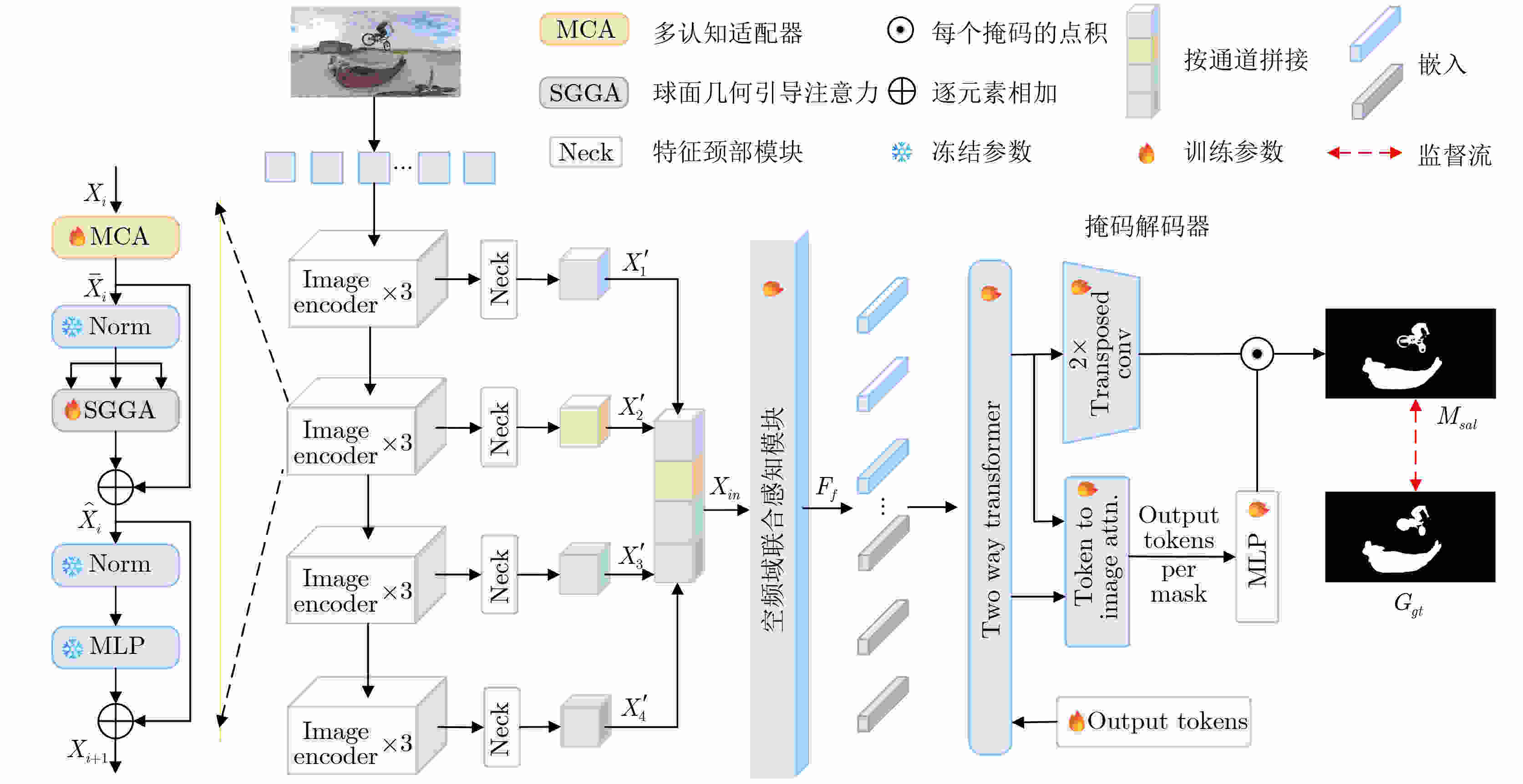 分割一切模型(Segment Anything Model, SAM)作为通用分割大模型,在多类二维视觉任务中展现出强大迁移能力,但原生SAM主要针对2D平面图像设计,缺乏对360°全景图像球面几何特性的建模能力,难以直接应用于360°全景图像显著目标检测(360° SOD)。为了将SAM应用于360° SOD并解决其不足,本文提出一种采用球面几何引导和频率增强SAM的360° SOD网络,具体包括多认知适配器(Multi-Cognitive Adapter, MCA),受人类视觉感知机制的启发,通过引入多尺度、多路径特征建模提升全景图像的上下文感知能力;球面几何引导注意力(Spherical Geometry-Guided Attention, SGGA),利用球面几何先验缓解等矩形投影中的畸变与边界不连续性;以及空频域联合感知模块(Spatial-Frequency Joint Perception Module, SFJPM),结合多尺度空洞卷积与频域注意力,增强全局与局部信息的协同建模,提升360° SOD性能。本文在现有的两个公开360° SOD数据集(360-SOD,360-SSOD)上进行了大量实验,结果表明,本文方法在客观指标和主观结果上的表现均优于现有的7种代表性2D SOD方法和7种360° SOD方法。