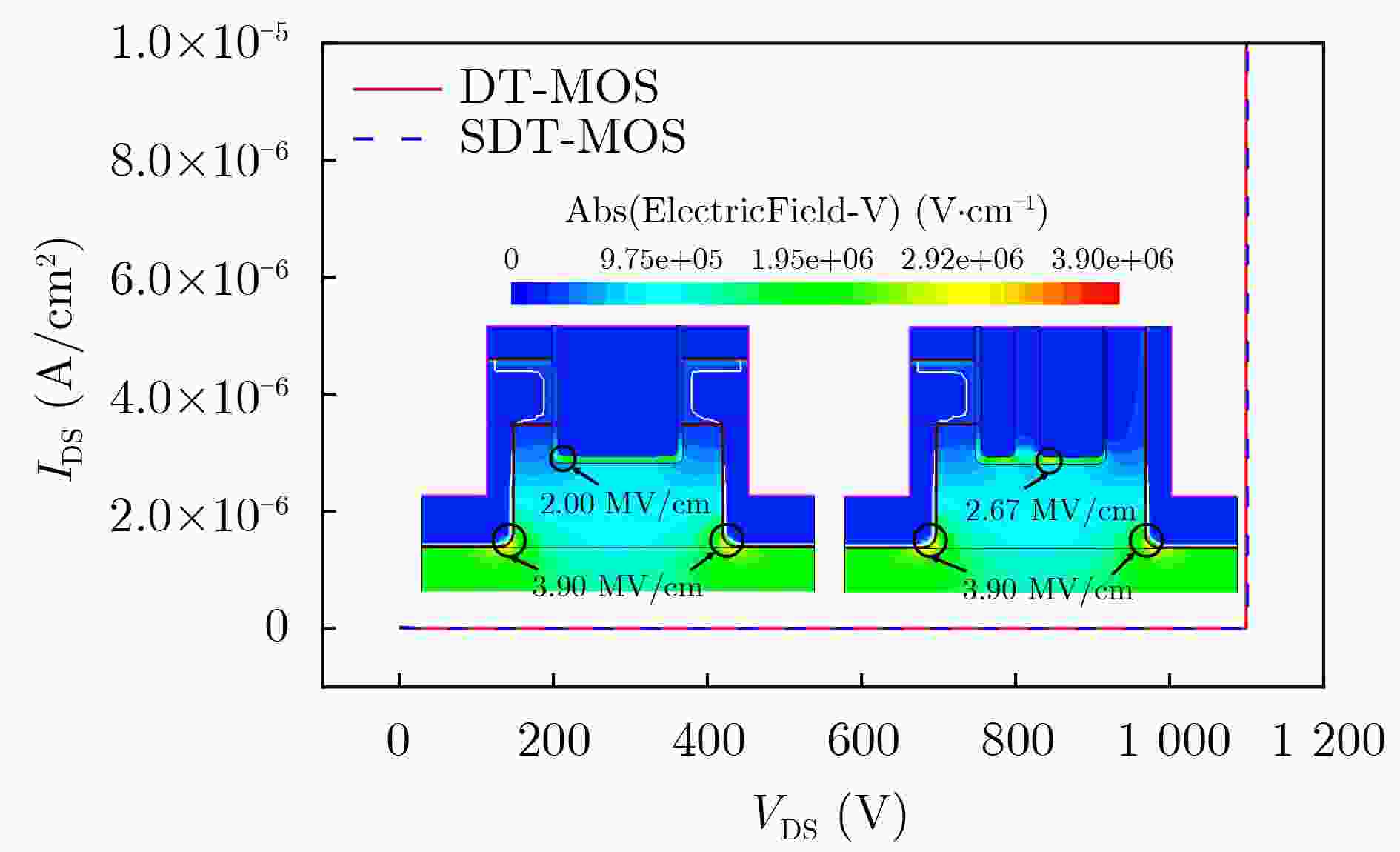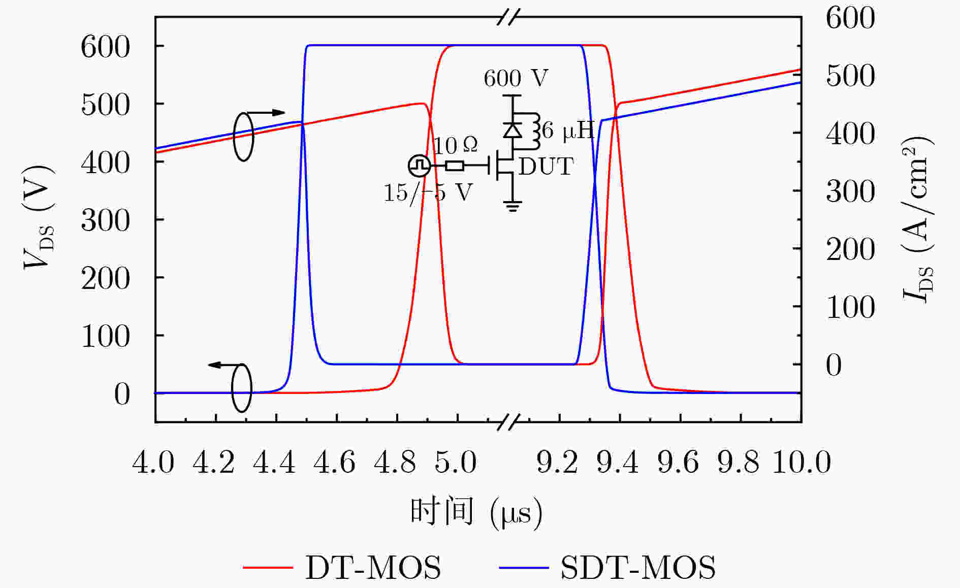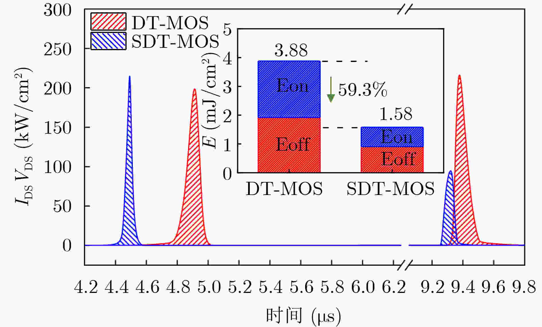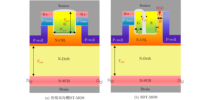 参数 DT-MOS SDT-MOS Vcut-in 2.8 V 1.5 V Ron,sp 1.36 mΩ·cm2 1.41 mΩ·cm2 BV 1 099 V 1 101 V QGD 303 nC/cm2 106.5 nC/cm2 Eon/Eoff 1.96/1.92 mJ/cm2 0.67/0.91 mJ/cm2 QRR 3.02 μC/cm2 1.39 μC/cm2 Ron,sp×CGD 107.4 mΩ·pF 41.2 mΩ·pF Ron,sp×QGD 412.1 mΩ·nC 151.2 mΩ·nC -