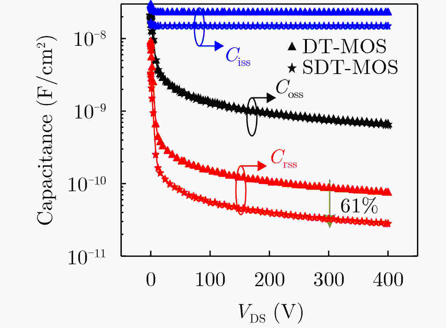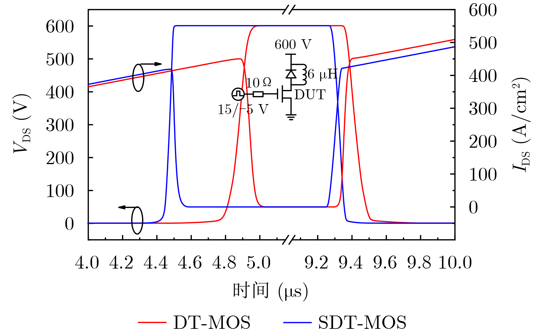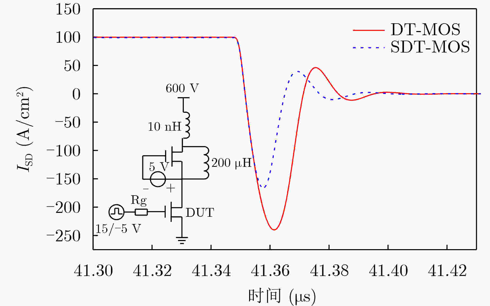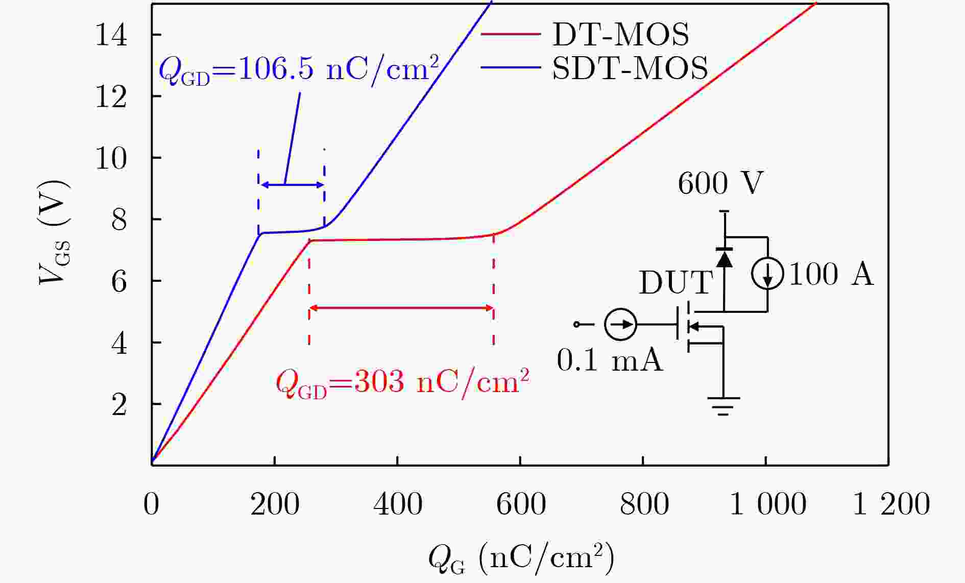 参数 DT-MOS SDT-MOS Vcut-in 2.8 V 1.5 V Ron,sp 1.36 mΩ·cm2 1.41 mΩ·cm2 BV 1 099 V 1 101 V QGD 303 nC/cm2 106.5 nC/cm2 Eon/Eoff 1.96/1.92 mJ/cm2 0.67/0.91 mJ/cm2 QRR 3.02 μC/cm2 1.39 μC/cm2 Ron,sp×CGD 107.4 mΩ·pF 41.2 mΩ·pF Ron,sp×QGD 412.1 mΩ·nC 151.2 mΩ·nC -