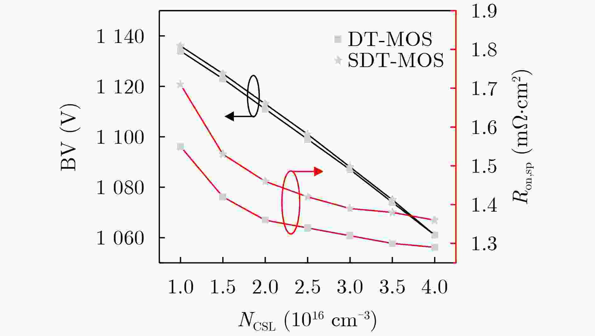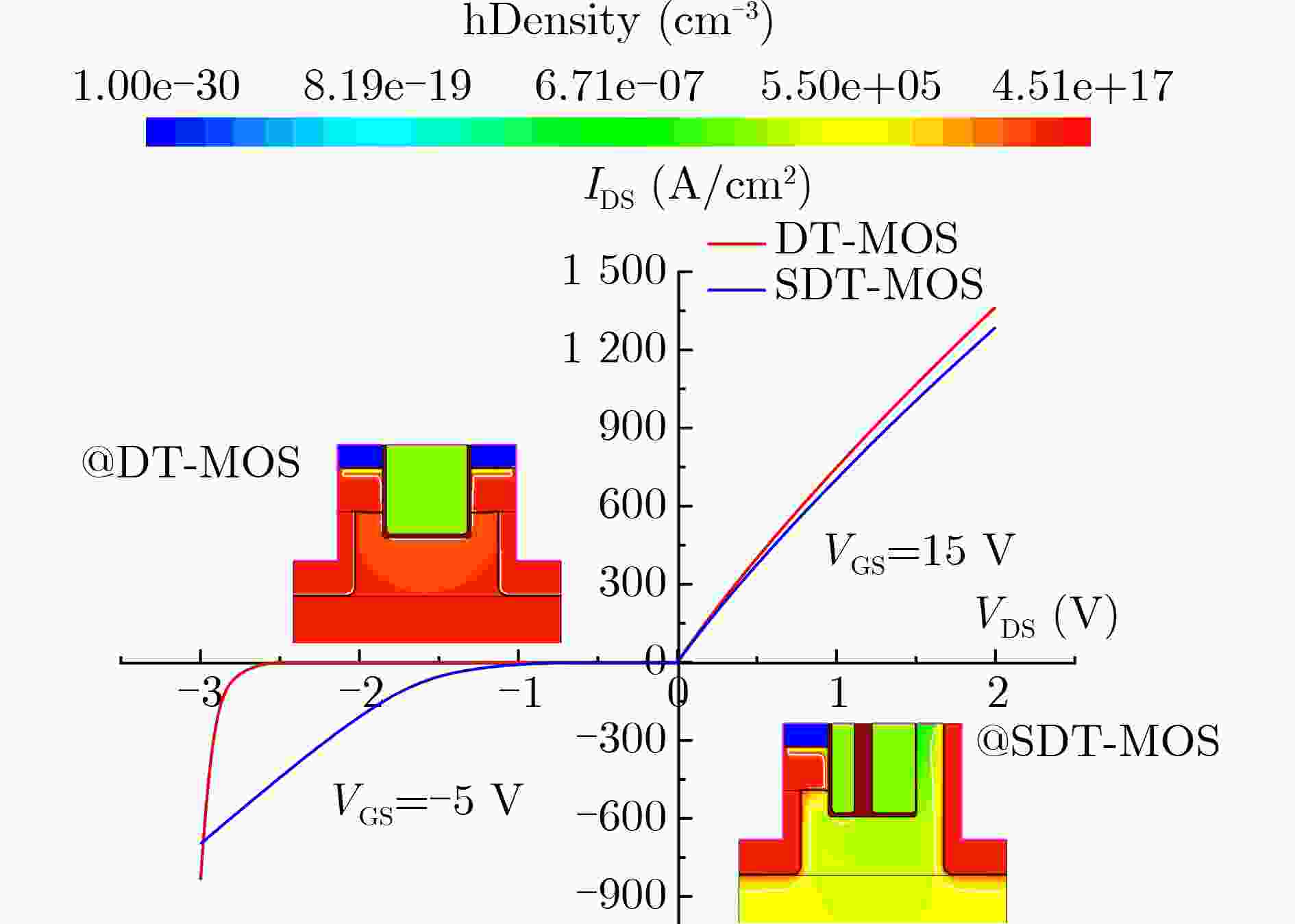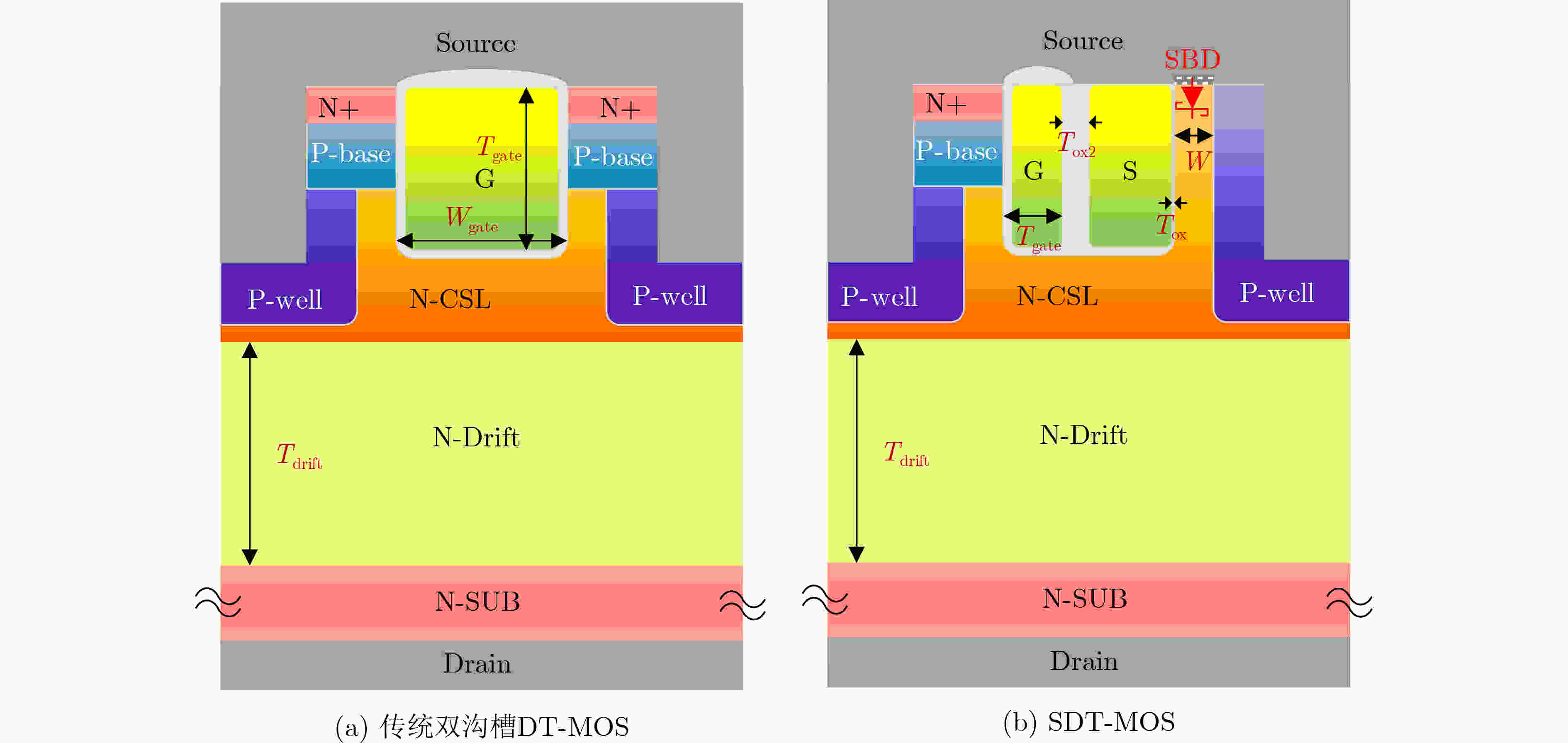 参数 DT-MOS SDT-MOS Cell pitch 3 μm 3 μm TDrift 11 μm 11 μm Wgate 0.9 μm 0.25 μm Tgate 1 μm 1 μm Tox 50 nm 20 nm NDrift 7×1015 cm–3 7×1015 cm–3 NP-base 2.5×1017 cm–3 2.5×1017 cm–3 NCSL 2.5×1016 cm–3 2.5×1016 cm–3 W - 0.3 μm Tox2 - 0.2 μm 表 2 两种器件的关键性能对比