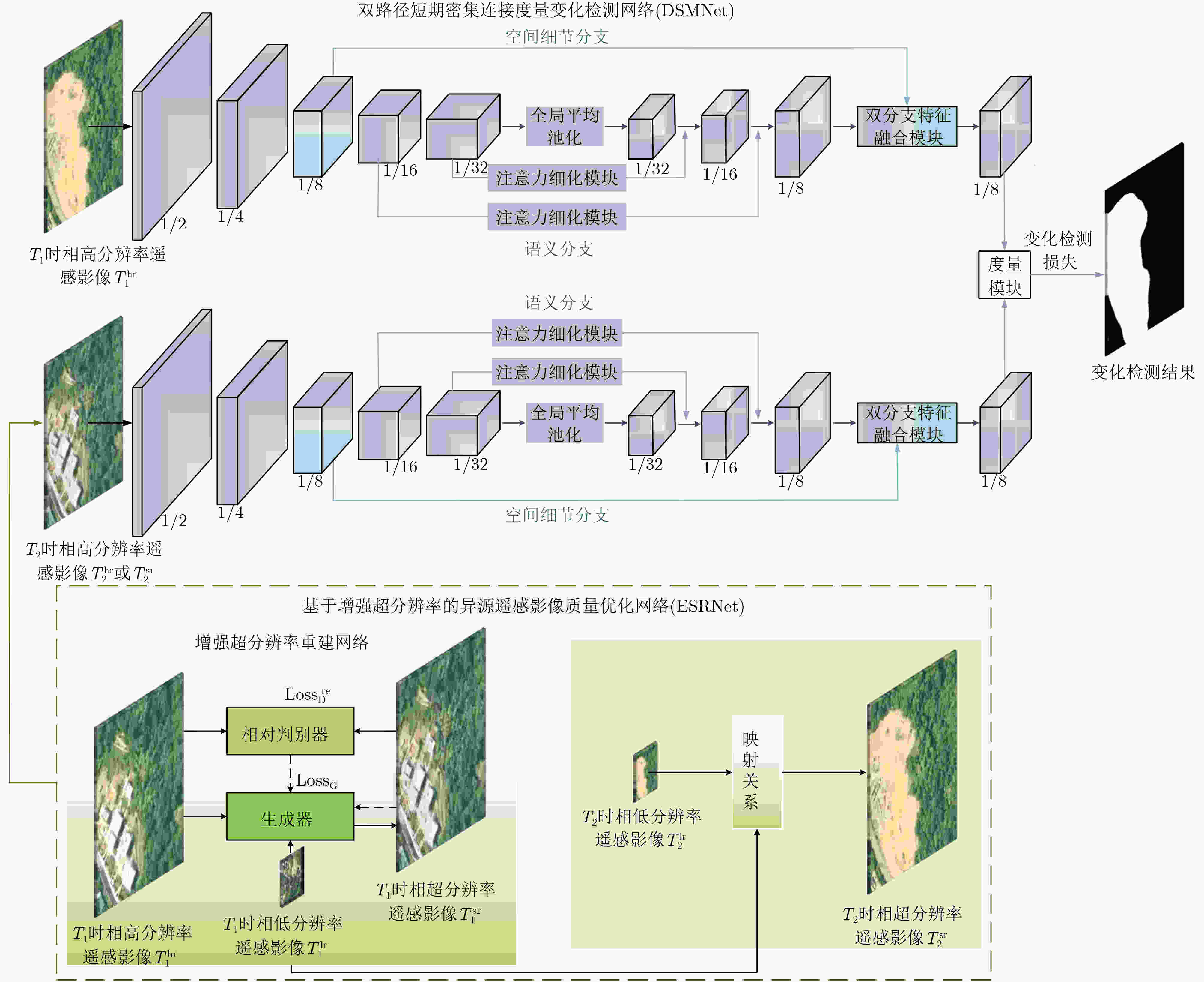 摘要: 光学异源高分辨率遥感影像变化检测中存在着空间分辨率差异、光谱差异以及变化类型复杂多样的问题,使得准确高效的检测异源高分辨率遥感影像中的变化更加困难。针对上述问题,该文提出一种基于增强超分辨率的异源遥感影像双路径短期密集连接度量变化检测网络(ESR-DSMNet),探讨光学异源高分辨率遥感影像高精度和高效率变化检测新路径。提出一种基于增强超分辨率的异源遥感影像质量优化网络(ESRNet),增强边缘信息和细节信息的同时,在影像级解决异源遥感影像空间分辨率差异;提出一种双路径短期密集连接度量变化检测网络(DSMNet),从特征级解决异源遥感影像的光谱差异,并实现高精度和高效率变化检测;在4组同源和异源遥感影像数据集进行对比分析表明,提出的方法领先于其他12种主流的变化检测方法,F1分别为79.69%, 71.01%, 95.87%和90.55%,所提的方法具有更高的精度和效率,泛化性能最好,在检测大面积地物和微小地物时,检测结果内部更具一致性、边缘更加精细。Abstract: