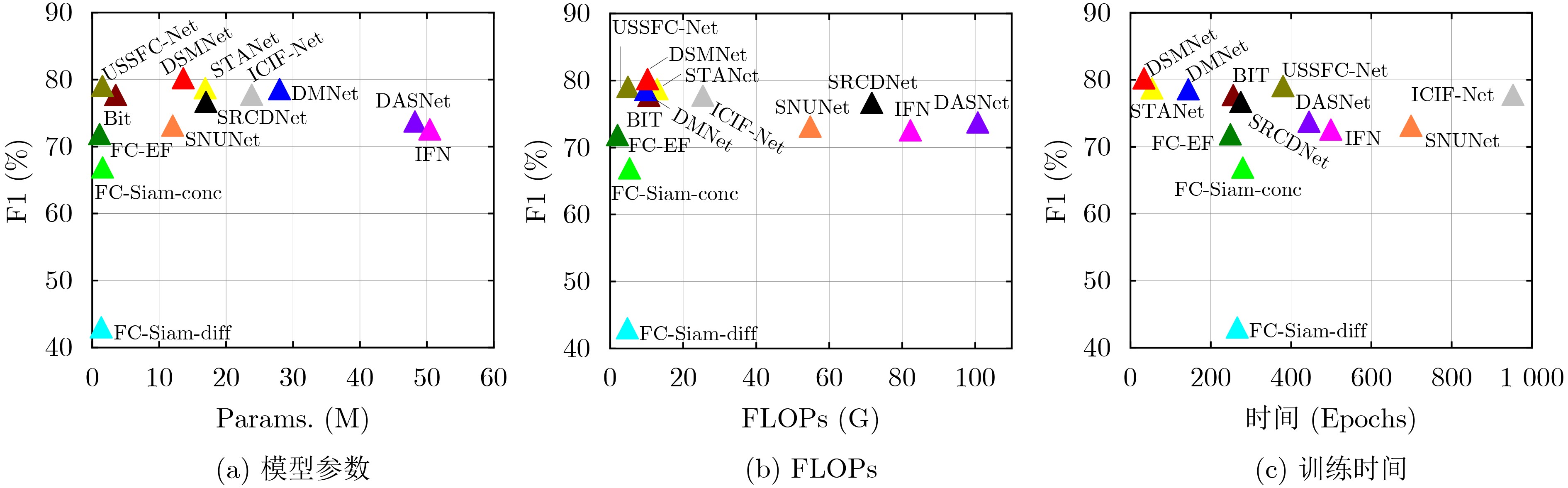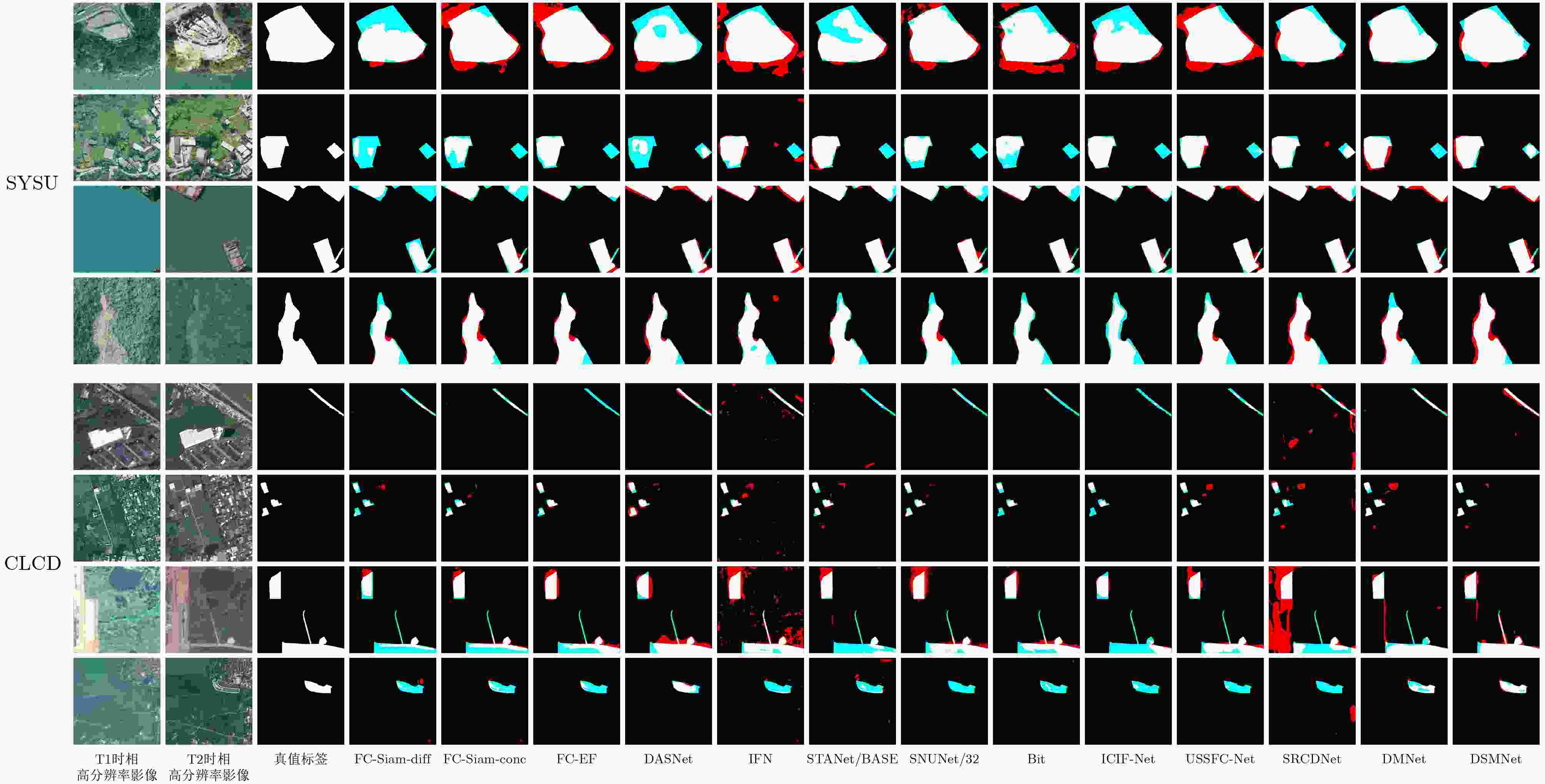 变化检测方法 Params.(M) FLOPs(G) 训练时间(Epoch/s) SYSU F1(%) SYSU F1(%) CLCD F1(%) WXCD F1(%) SACD FC-Sima-diff 1.35 4.73 266 42.51 43.15 63.18 51.80 FC-Sima-conc 1.55 5.33 280 66.37 49.34 64.56 53.37 FC-EF 1.10 2.02 249 71.34 55.10 95.07 87.30 DASNet 48.22 100.72 445 73.22 69.11 80.58 89.80 IFN 50.44 82.26 499 72.05 44.64 83.99 80.91 STANet/BASE 16.89 12.86 54 78.19 57.86 84.16 86.34 SNUNet/32 12.03 54.83 699 72.61 51.19 95.39 81.22 BIT 3.50 10.63 256 77.18 59.69 85.04 80.42 ICIF-Net 23.84 25.41 953 77.22 59.24 94.80 89.90 USSFC-Net 1.52 4.86 380 78.52 64.16 90.73 89.44 SRCDNet 16.98 71.68 275 76.13 48.13 94.79 87.24 DMNet 27.99 9.72 144 78.05 67.05 95.13 88.91 DSMNet 13.60 10.23 34 79.69 71.01 95.87 90.55 -