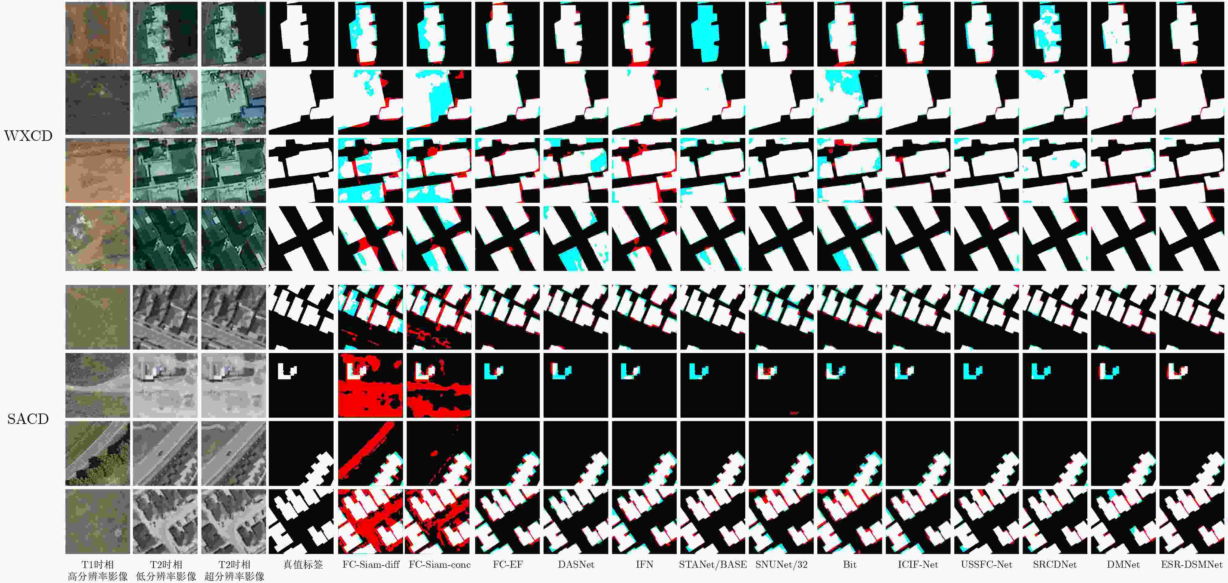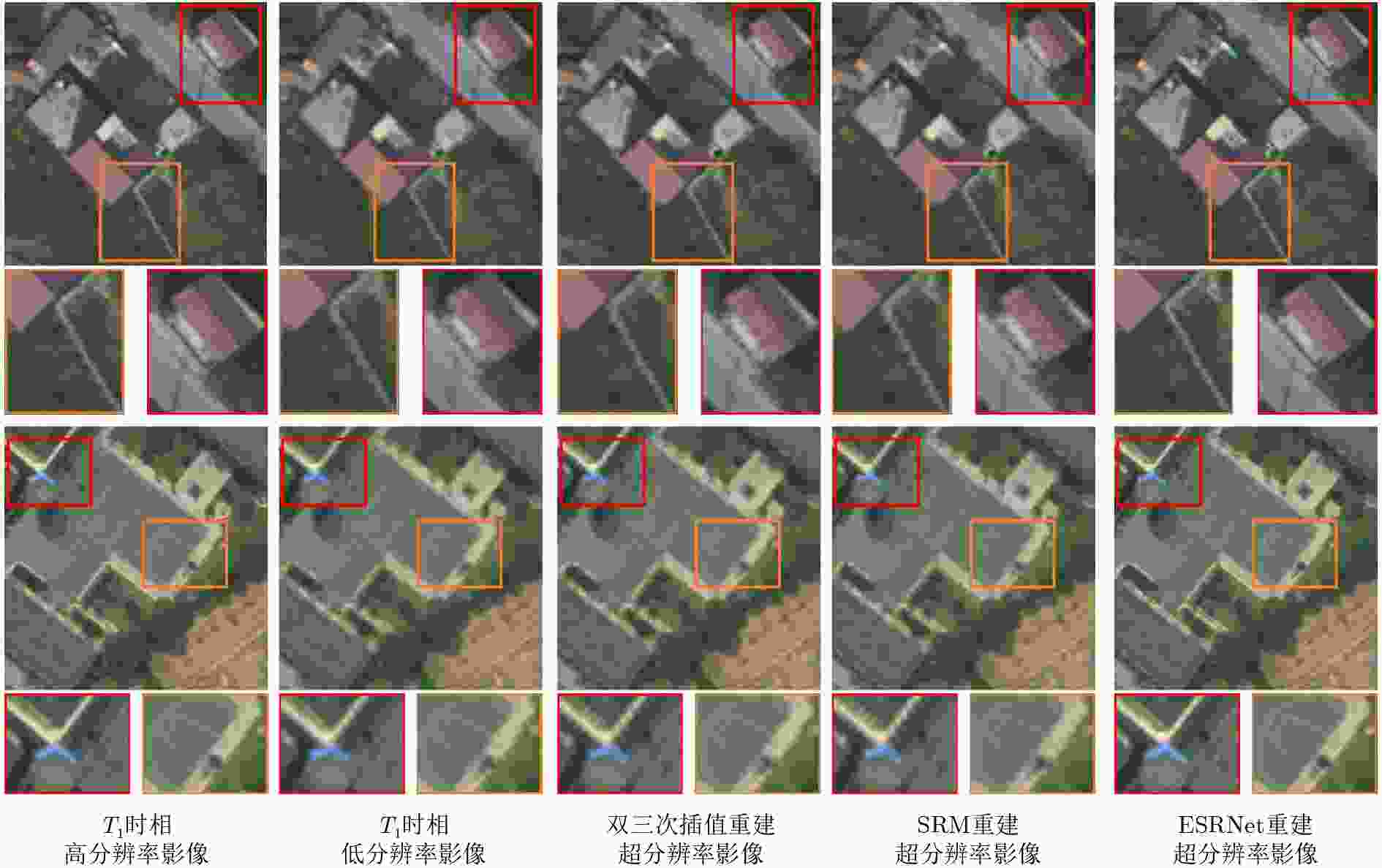 变化检测方法 WXCD SACD Precision Recall F1 Precision Recall F1 FC-Sima-diff 66.82 60.75 63.18 38.55 81.62 51.80 FC-Sima-conc 70.82 60.78 64.56 39.49 84.87 53.37 FC-EF 95.42 94.74 95.07 88.80 85.99 87.30 DASNet 95.46 69.70 80.58 87.68 92.02 89.80 IFN 82.89 85.56 83.99 82.48 80.35 80.91 STANet/BASE 97.76 73.88 84.16 81.75 91.48 86.34 SNUNet/32 96.64 94.21 95.39 78.75 84.23 81.22 BIT 92.00 79.05 85.04 76.54 84.71 80.42 ICIF-Net 96.89 92.81 94.80 89.72 90.08 89.90 USSFC-Net 93.56 96.04 94.79 88.03 90.91 89.44 SRCDNet 96.43 85.67 90.73 88.13 86.37 87.24 DMNet 95.30 94.97 95.13 86.05 91.96 88.91 DSMNet 96.67 95.08 95.87 88.56 92.63 90.55 表 4 异源遥感影像上不同超分辨率方法重建影像质量对比