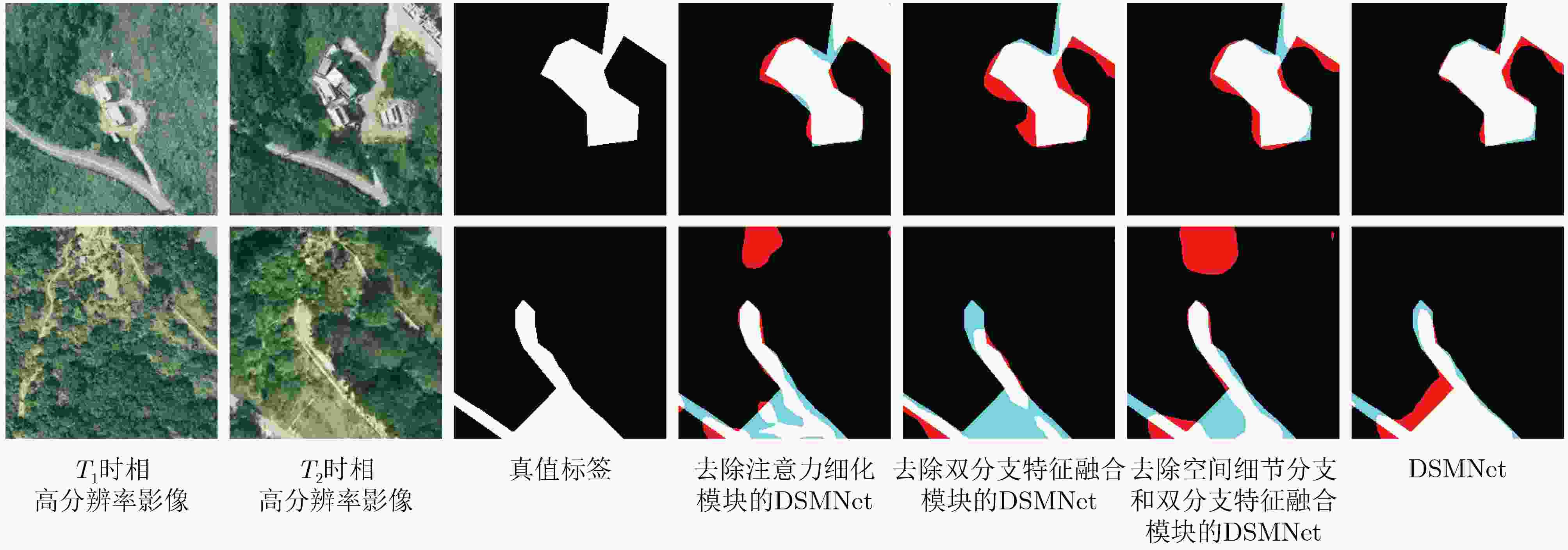 模块 Precision Recall F1 空间细节分支 注意力细化模块 双分支特征融合模块 √ × √ 76.60 81.94 79.18 √ √ × 73.94 80.48 77.07 × √ × 73.75 82.92 78.06 √ √ √ 76.66 82.98 79.69 表 6 13种变化检测网络性能对比