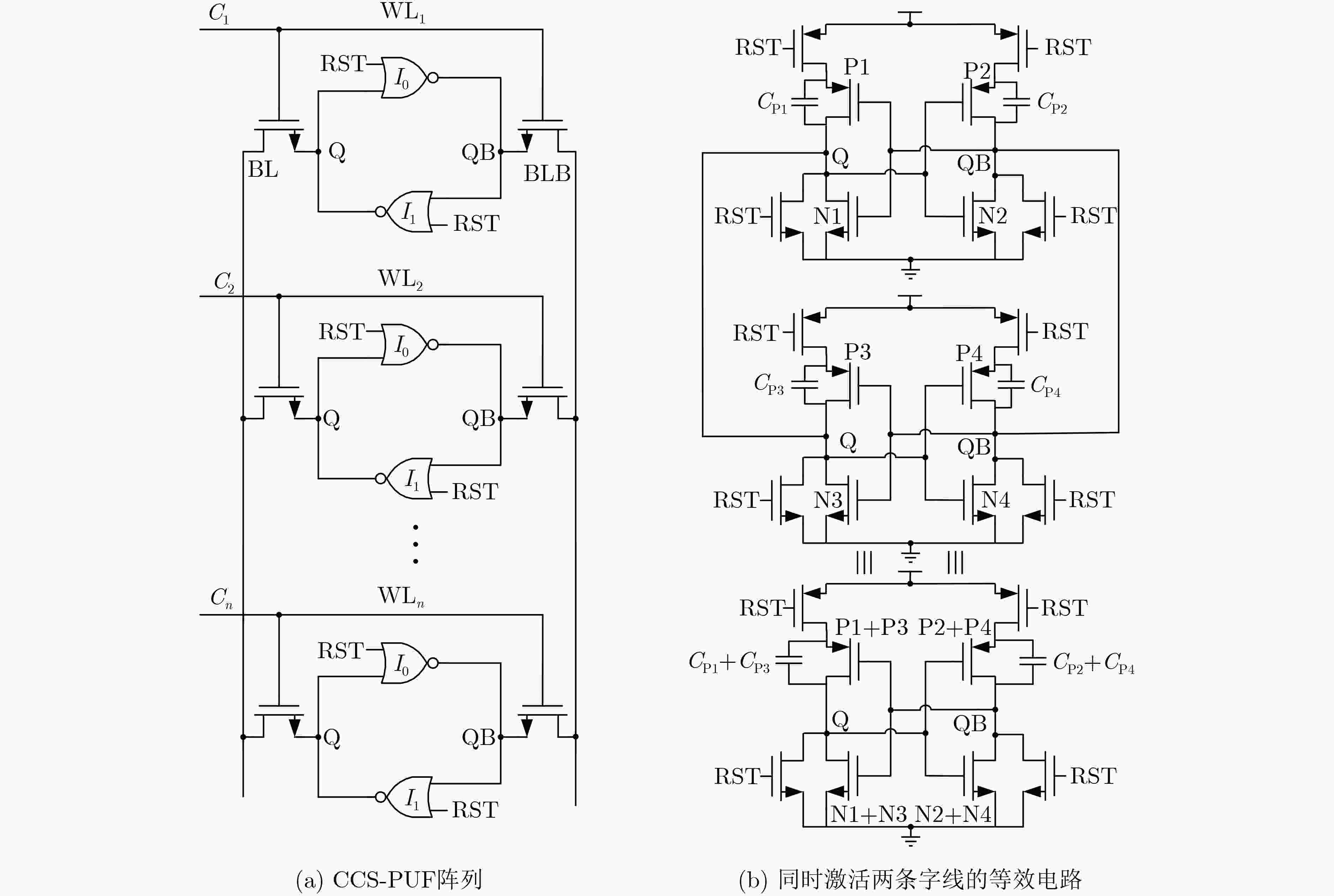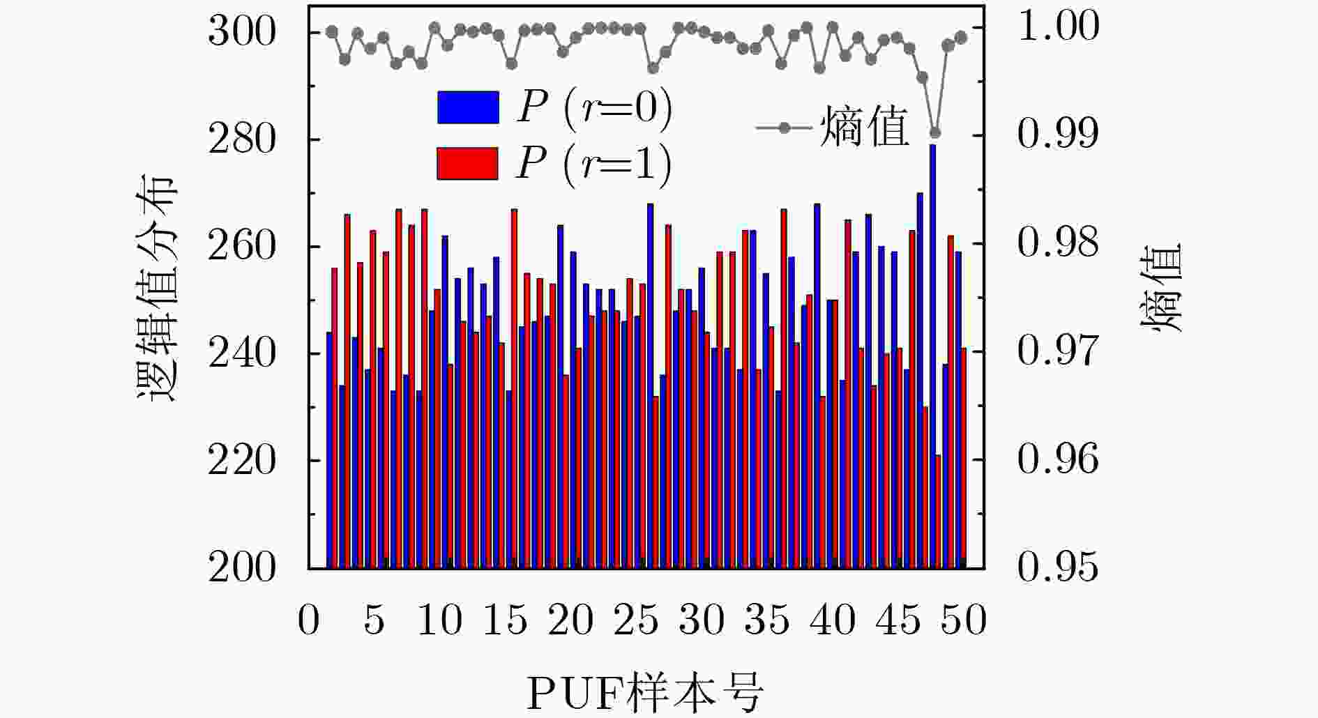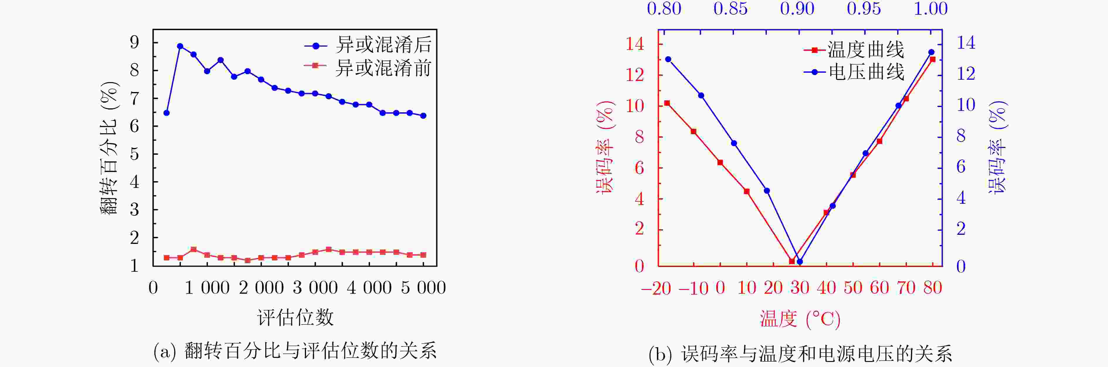 文献[13] 文献[11] 文献[15] 本文 工艺(nm) 28 65 65 28 PUF类型 放大器链 亚阈值分压器 放大器链 双稳态电路 存储功能 无 无 无 有 CRPs空间 3.7×1019 1.15×1018 - 232 ML预测正确率(%) 49.96 51.00 50.60 52.34 温度范围(°C) –40~100 0~50 –40~120 –20~80 电压范围(V)