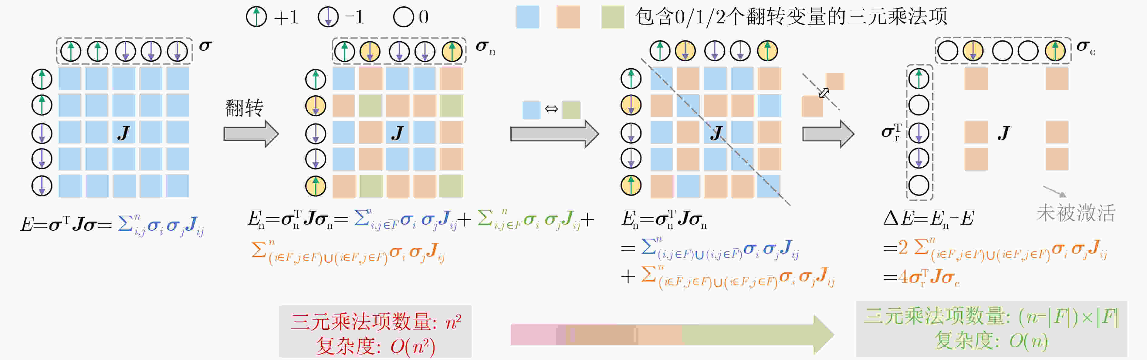 输入:QUBO矩阵$ \boldsymbol{Q} $ 输出:变量$ \boldsymbol{x} $ 1:Initialize $ T,\boldsymbol{x} $ // 初始化 2:$ E=f\left(\boldsymbol{x}\right) $ 3:while $ T\ge {T}_{\min} $ do 4: $ {\boldsymbol{x}}^{{'}}={\mathrm{flip}}\left(\boldsymbol{x}\right) $ // 生成新解 5: $ {E}^{{'}}=f\left({\boldsymbol{x}}^{{{'}}}\right) $ // 目标函数计算(迭代关键步骤) 6: if $ {E}^{{'}}\le E $ then 7: $ \boldsymbol{x}={\boldsymbol{x}}^{{{'}}},E={E}^{{'}} $ // 更新当前解 8: else 9: if $ {{\mathrm{e}}}^{-\frac{{E}^{{'}} - E}{T}} < {\mathrm{rand}}\left(\right) $ then // 根据Metropolis准则更新当前解 10: $ \boldsymbol{x}={\boldsymbol{x}}^{{{'}}},E={E}^{{'}} $ 11: $ T=T\times \eta $ // 温度下降 -