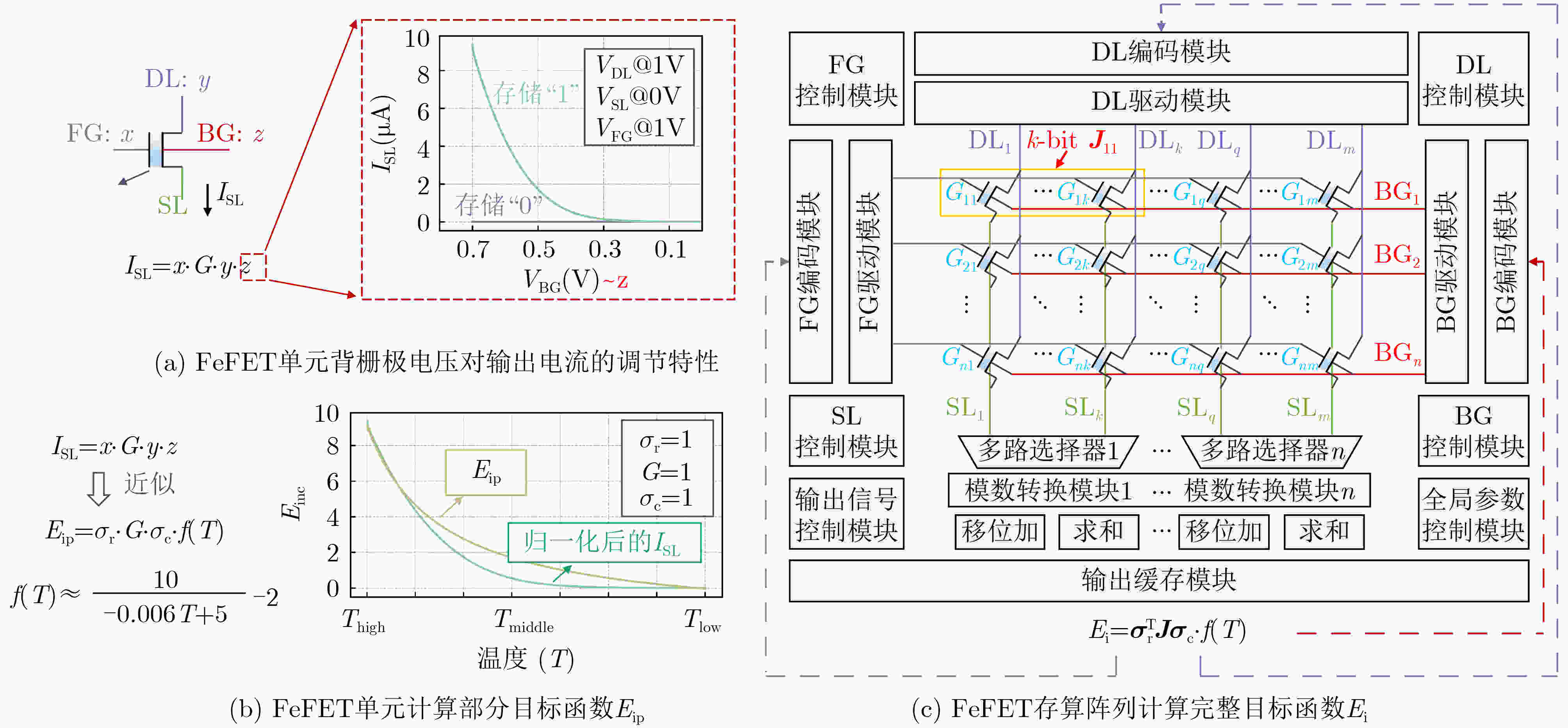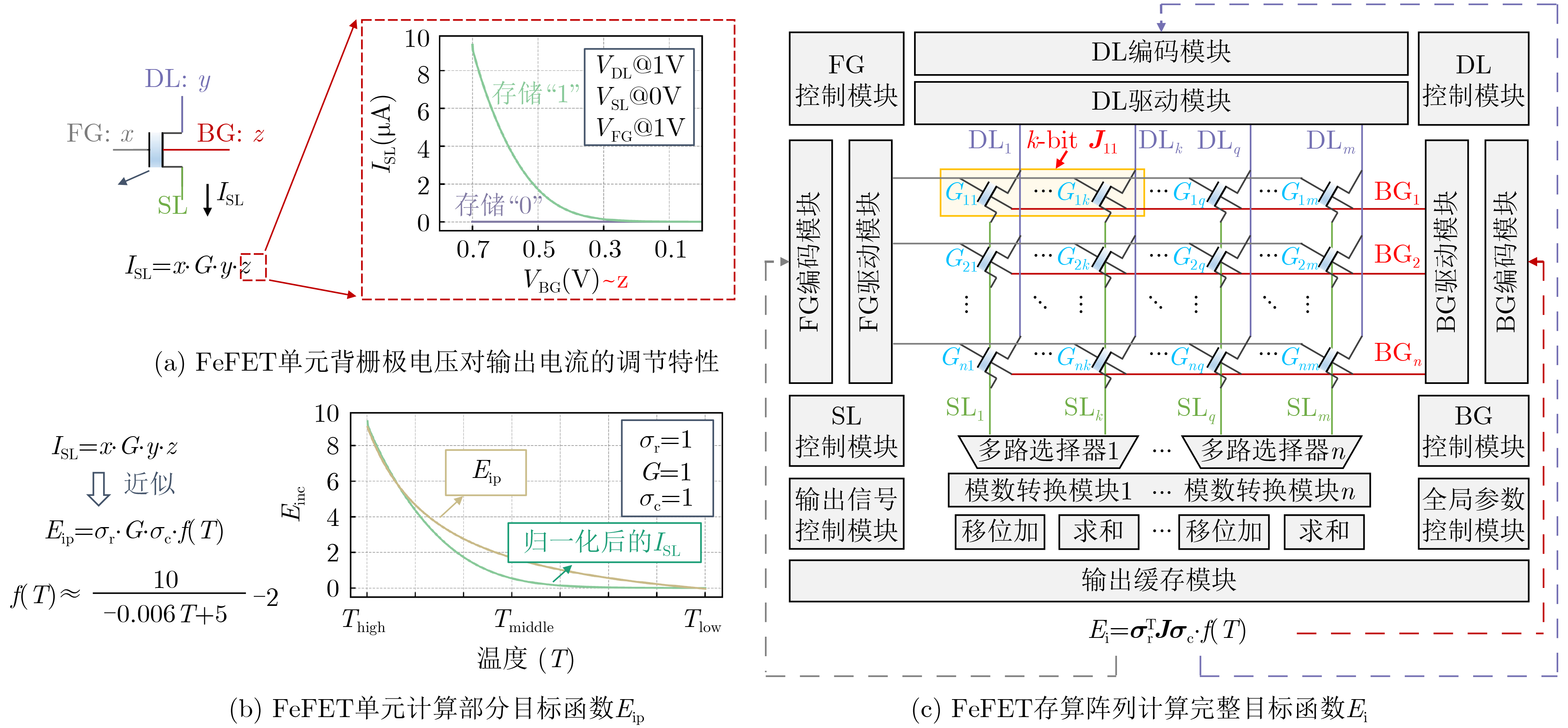 Significance Combinatorial Optimization Problems (COPs) are ubiquitous, profoundly impacting diverse fields from logistics and finance to advanced AI and drug discovery. At their core, these problems demand identifying the absolute best solution from an often unfathomably vast set of possibilities. The vast majority of COPs are classified as NP-hard problems, representing one of the most significant computational challenges in computer science. Traditional digital computers, operating on the von Neumann architecture, face immense difficulties in solving COPs; as problem scales expand, required computational resources, particularly latency, increase exponentially. Given these limitations, there’s an urgent need to explore novel architectures for efficiently solving COPs, a pursuit with both significant theoretical importance and profound practical implications for tackling complex, resource-intensive real-world problems. Addressing these challenges, researchers have actively explored various novel hardware-based combinatorial optimization solutions, often transforming COPs into Ising models or Quadratic Unconstrained Binary Optimization (QUBO) problems for hardware implementation. Broadly, existing approaches fall into two categories: digital Application-Specific Integrated Circuit (ASIC) annealers, which suffer from data movement bottlenecks, and dynamical system solvers, which leverage physical dynamics but often demand high device parameter precision, struggle with cross-chip scalability, and may find it difficult to integrate Ising model self-interaction terms. Beyond these, other non-traditional methods like quantum computing (e.g., D-Wave’s quantum annealers requiring cryogenic cooling and having limited connectivity) and certain optical computing approaches (e.g., relying on extremely long optical fibers) exist. While offering unique physical advantages, they generally face substantial challenges in integrating with mature silicon-based Very Large Scale Integration (VLSI) circuits. Consequently, despite a range of novel hardware solutions, their individual limitations highlight the critical need for new combinatorial optimization solvers that offer higher integration, better scalability, superior energy efficiency, and broader problem type support. Progress Ferroelectric Field-Effect Transistors (FeFETs), with their unique threshold voltage programmability and multi-port input structure, are opening exciting new avenues for efficiently solving combinatorial optimization problems (COPs). The FeFET-based compute-in-memory (CiM) architecture is particularly well-suited for these challenges, boasting high energy efficiency, low latency, and the inherent ability to accelerate complex operations like vector-matrix and vector-matrix-vector multiplications. Recent research has seen numerous works proposing FeFET-based CiM COP solvers to tackle a diverse range of problems, including those with equality constraints, inequality constraints, and Nash equilibrium scenarios. The overall solving process for these innovative FeFET-based CiM solutions generally involves four key steps: (1) Problem transformation, where the COP is converted into a hardware-friendly objective function, often by encoding equality constraints, introducing slack variables or penalty methods for inequality constraints, or formulating coupled optimization problems for Nash equilibrium scenarios; (2) Following transformation, the objective function undergoes a crucial compression process. This is specifically achieved by analyzing the simulated annealing algorithm itself, which allows for the partial activation of matrix columns, thus significantly reducing the typical computational complexity associated with fully active matrices. Furthermore, this step involves approximating and merging the exponential function components inherent in the algorithm directly into the matrix representation, thereby optimizing the function for efficient hardware implementation on the CiM array; (3) Leveraging the unique three-port and four-port structures of FeFETs, specialized CiM circuit designs are utilized to achieve high-speed acceleration of the compressed objective function. This allows for the efficient computation of a single iteration or a key part of the objective function often within a single clock cycle, significantly mitigating the von Neumann bottleneck; and (4) Finally, based on the optimized and simplified objective function, combinatorial optimization algorithms, such as simulated annealing, are simplified and applied over multiple cycles. This iterative process, efficiently accelerated by the underlying CiM hardware, aims to achieve high-quality and efficient solutions for the given problem. This structured approach highlights the adaptability and potential of FeFET-based CiM for a broad spectrum of challenging combinatorial optimization tasks. Conclusions This paper provides a comprehensive review of FeFET-based CiM solvers for solving COPs, which are prevalent across various domains and demand significant computational resources. It first outlines the device characteristics of FeFET and the fundamental process of solving COPs. The core of the paper focused on recent advancements in FeFET-based CiM solvers tailored for three specific scenarios: equality constraints, inequality constraints, and Nash equilibrium. The discussion highlighted how these architectures leverage the unique properties of FeFET to address the computational intensity of these problems. Prospects FeFET-based COP solvers show immense potential. By merging FeFET device strengths with CiM advantages, these solvers offer an efficient path to tackling highly complex optimization challenges, leading to substantial gains in speed and energy efficiency for real-world problems. However, significant challenges remain: (1) FeFET endurance is limited, restricting the number of processable problems. (2) Analog-to-digital converters (ADCs) in FeFET CiM arrays 