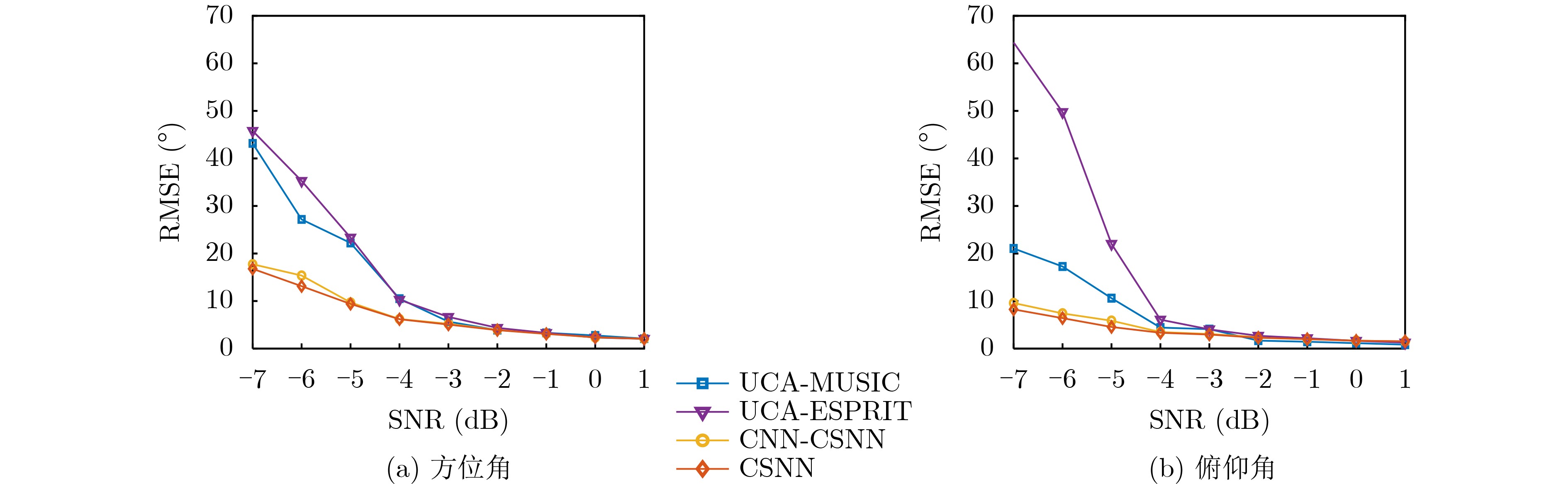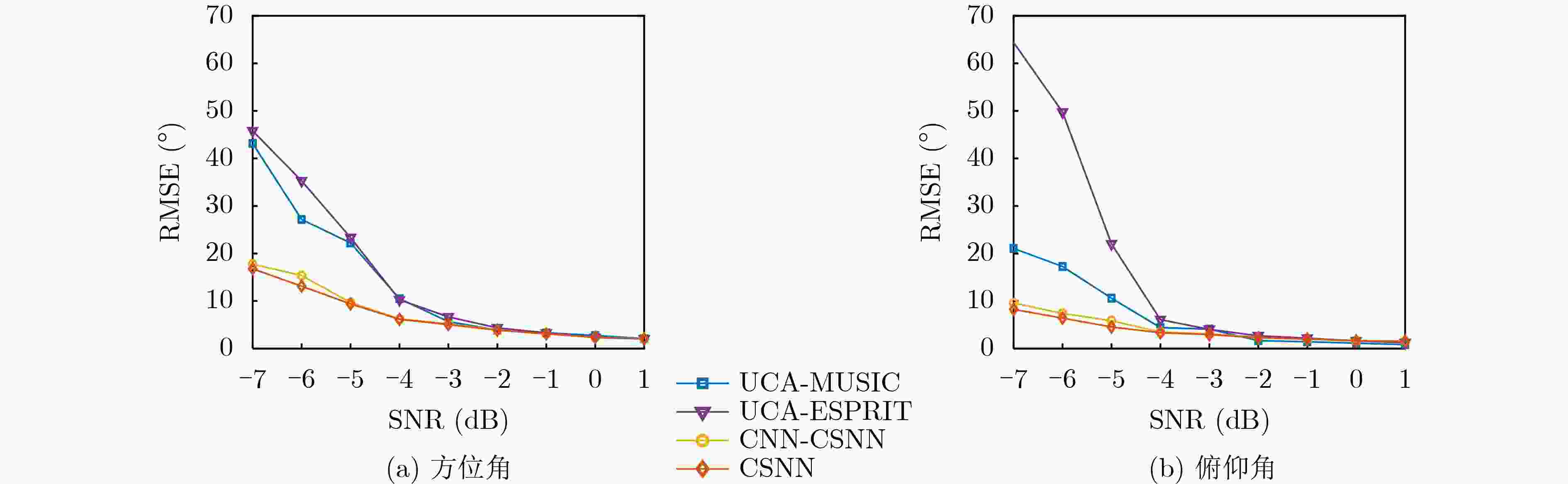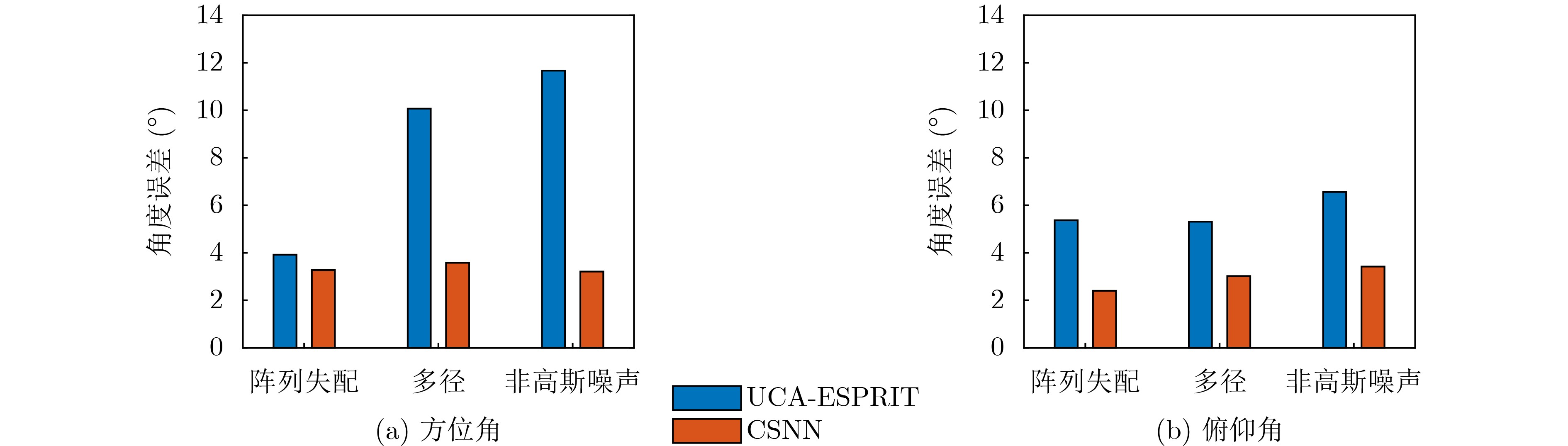 方法 方位角 俯仰角 UCA-ESPRIT 9.23 11.48 UCA-MUSIC 10.48 22.84 FPM 5.94 9.85 CVCNN[14] 1.97 2.21 CSNN 1.07 1.28 表 2 跨场景角度估计误差(°)