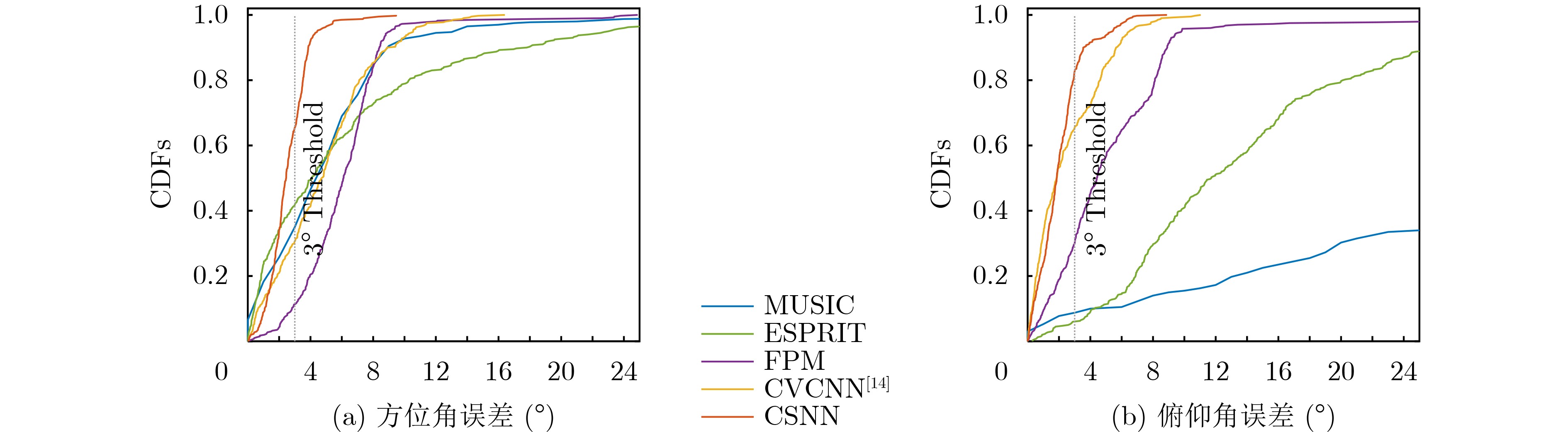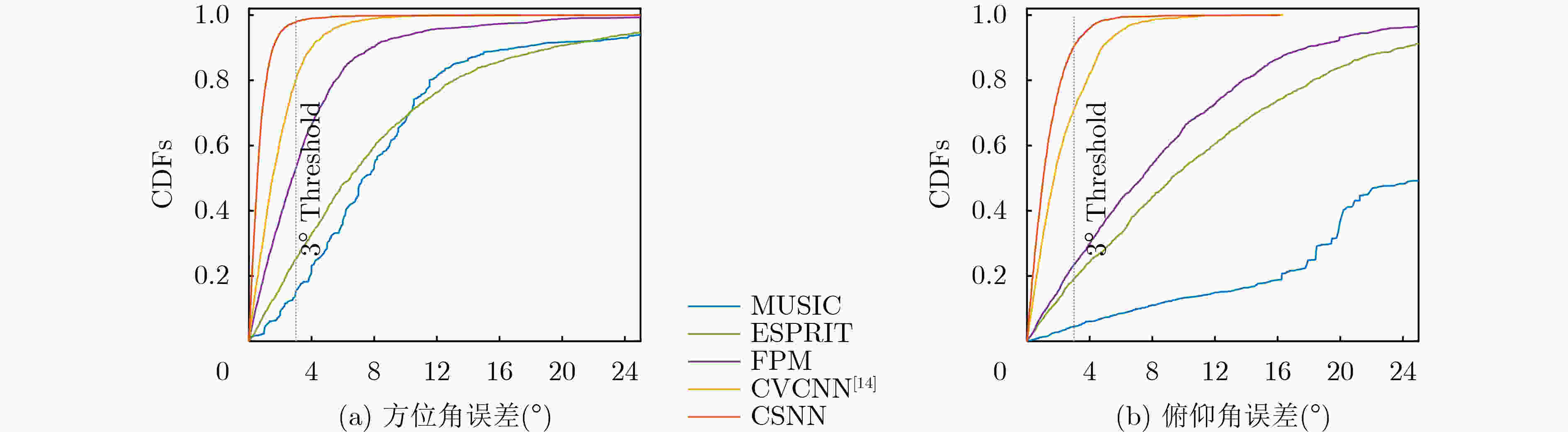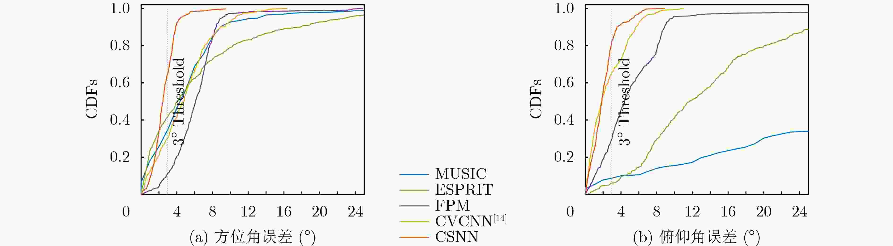 方法 方位角 俯仰角 UCA-ESPRIT 9.23 11.48 UCA-MUSIC 10.48 22.84 FPM 5.94 9.85 CVCNN[14] 1.97 2.21 CSNN 1.07 1.28 表 2 跨场景角度估计误差(°)