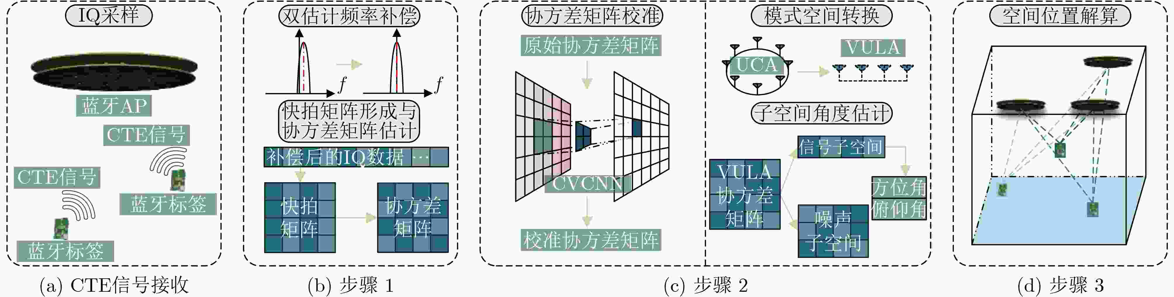 Objective High-precision indoor localization is increasingly required in intelligent service scenarios, yet existing techniques continue to face difficulties in complex environments where signal frequency offset, multipath propagation, and noise interfere with accuracy. To address these limitations, a 3D localization method using a Uniform Circular Array (UCA) driven by a Complex Subspace Neural Network (CSNN) is proposed to improve accuracy and robustness under challenging conditions. Methods The proposed method establishes a complete localization pipeline based on a hierarchical signal processing framework that includes frequency offset compensation, three-dimensional angle estimation, and spatial mapping ( Fig. 2 ). A dual-estimation frequency compensation algorithm is first designed. The frequency offsets during the Channel Time Extension (CTE) reference period and sample period are estimated separately, and the estimate obtained from the reference period is used to resolve ambiguity in the antenna sample period, which enables high-precision frequency compensation. The CSNN is then constructed to estimate the two-dimensional angle (Fig. 3 ). Within this framework, a Complex-Valued Convolutional Neural Network (CVCNN) (Fig. 4 ) is introduced to calibrate the covariance matrix of the received signals, which suppresses correlated noise and multipath interference. Based on the theory of mode-space transformation, the calibrated covariance matrix is projected onto a virtual Uniform Linear Array (ULA). The azimuth and elevation angles are jointly estimated by the ESPRIT algorithm. The estimated angles from three Access Points (APs) are subsequently fused to obtain the final position estimate.Results and Discussions Experiments are conducted to evaluate the performance of the proposed method. For frequency offset suppression, the dual-estimation frequency compensation algorithm markedly reduces the effect on angle estimation, improving estimation accuracy by 91.7% compared with uncorrected data and showing clear improvement over commonly used approaches ( Fig. 6 ). For angle estimation, the CSNN achieves reductions of more than 40% in azimuth error and 25% in elevation error compared with the MUSIC algorithm under simulation conditions (Fig. 7 ), and verifies the capability of the CVCNN module to suppress various interferences. In practical experiments, the CSNN achieves an average azimuth error of 1.07° and an average elevation error of 1.28° in the training scenario (Table 1 ,Fig. 10 ). Generalization experiments conducted in three indoor environments (warehouse, corridor, and office) show that the average angular errors remain low at 2.78° for azimuth and 3.39° for elevation (Table 2 ,Fig. 11 ). The proposed method further maintains average positioning accuracies of 28.9 cm in 2D and 36.5 cm in 3D after cross-scene migration (Table 4 ,Fig. 13 ).Conclusions The proposed high-precision indoor localization method integrates dual-estimation frequency compensation, the CSNN angle estimation algorithm, and three-AP cooperative localization. It demonstrates strong performance in both simulation and real-environment experiments. The method also maintains stable cross-scene adaptability and accuracy that meet the requirements of high-precision indoor localization. -