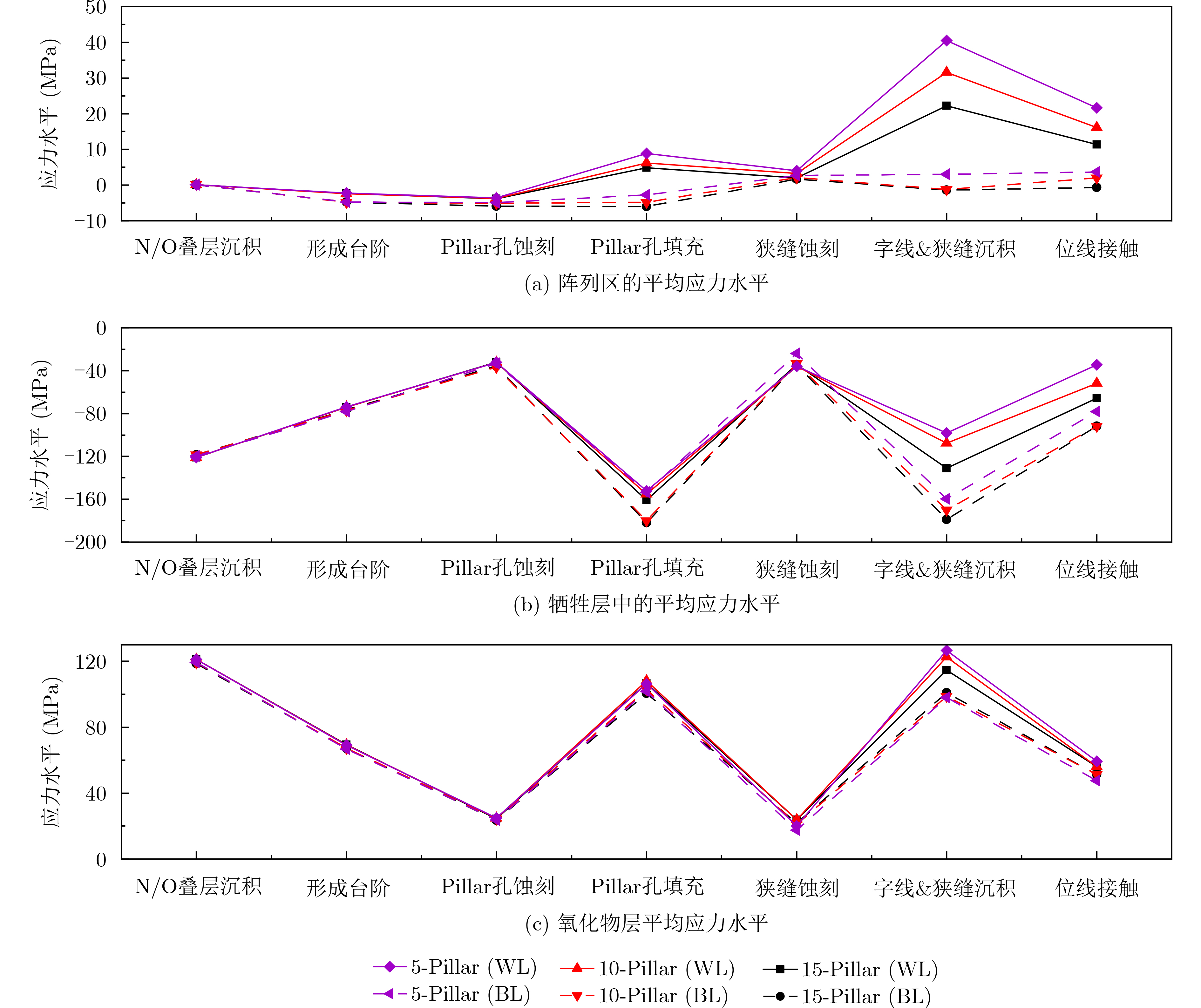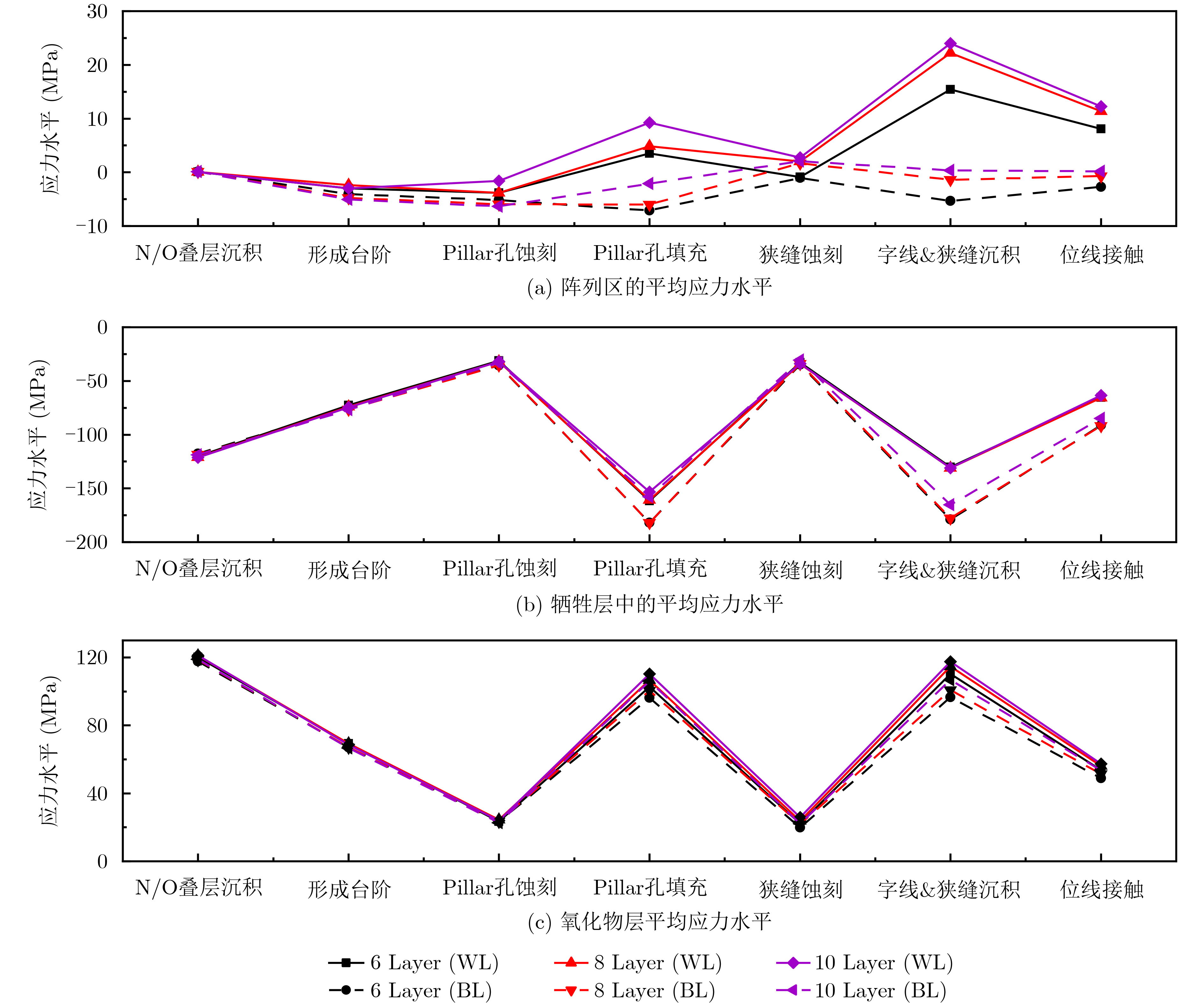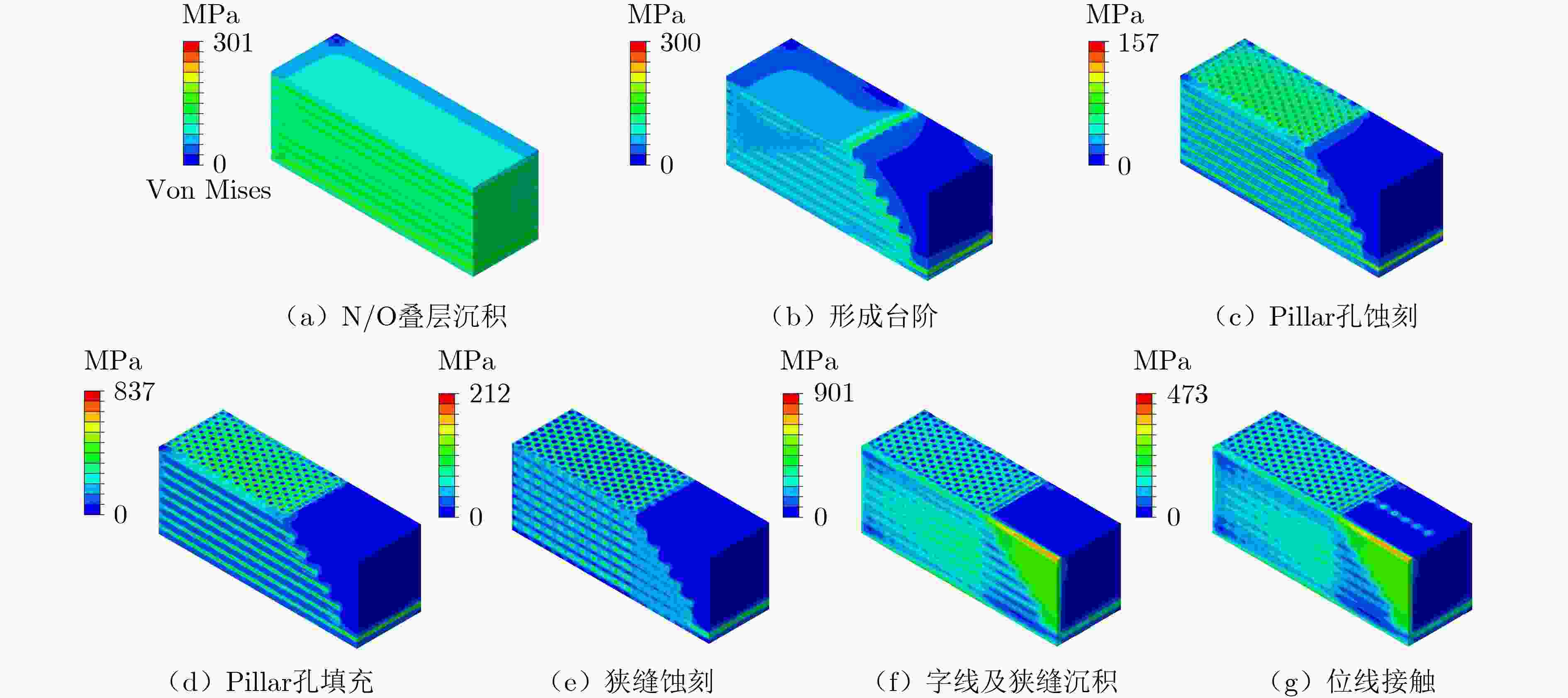 Objective To improve the performance of 3D NAND architecture, a series of horizontal and vertical miniaturization strategies have been proposed. While these designs increase storage density, they also introduce integration challenges. In particular, thermo-mechanical stress during fabrication has become a critical limitation on device yield and performance. This study establishes a high-precision process mechanics model of 3D NAND based on a local Representative Volume Element (RVE) finite element modeling framework, accounting for the multilayer stacked structure and various block architecture designs. By systematically investigating stress evolution during fabrication, the analysis identifies the root causes of stress non-uniformity and characterizes the dynamic distribution of mechanical stress under different miniaturization schemes. These findings have practical relevance for yield improvement and device reliability, addressing key challenges in advancing 3D NAND storage density. Methods This study constructs a high-precision, device-level finite element model of 3D NAND based on the theory of RVE. The simulation of thermal stress evolution throughout the manufacturing process uses the element birth/death technique in Abaqus. The baseline model features a representative 3D NAND structure comprising 8 Nitride/Oxide (N/O) bilayers, each 25 nm thick. Within a 40-nm-wide slit, 15 storage pillars, each with a diameter of 24 nm and spaced at 36 nm intervals, are arranged in a staggered configuration. To explore the effect of stacking layer number on stress evolution, modified models with 6 and 10 N/O layers are also developed. In addition, to examine the effect of different block architecture transitions, models incorporating 5 and 10 pillars per block are analyzed. The material properties used are consistent with those reported in previous studies, where both the calibration of material parameters and the modeling methodology are validated. Results and Discussions Process-dependent simulations were conducted to examine the evolution of stress distribution during key 3D NAND fabrication steps and to assess the effects of vertical stacking layers ( Fig. 7 ) and block architecture designs (Fig. 8 ). The results show that metal volume fraction, the number of pillars in the array region, and the presence of oxide stairs are primary factors influencing stress distribution. A higher metal volume fraction markedly increases internal stress due to thermal expansion mismatch. Asymmetric metal layouts in the Word Line (WL) and Bit Line (BL) directions intensify stress anisotropy between these axes. Pillars in the array region help alleviate stress concentration by generating tensile zones during nitride/metal thermal deformation, thereby reducing the overall compressive stress. In contrast, oxide stairs constrain deformation along the WL direction, inhibiting stress relaxation and resulting in localized compressive regions. These combined mechanisms indicate that increasing the number of WL layers tends to enhance stress asymmetry, whereas block architectures with a larger number of pillars reduce the degree of stress non-uniformity.Conclusions Using a process mechanics model based on the RVE approach, this study explored stress evolution in 3D NAND fabrication. The effects of two major scaling strategies—vertical layer stacking and horizontal block architecture conversion, were systematically analyzed with respect to stress magnitude and directional asymmetry. The results show that asymmetric stress distribution originates during the step etching stage and peaks following WL and slot filling. As the number of vertical stacking layers increases, structural compressive stress intensifies, particularly in the WL and BL directions. Increasing the number of layers from 6 to 10 results in an 8.54 MPa rise in WL compressive stress and a 5.66 MPa rise in BL stress, with the WL-BL stress difference increasing from 20.76 MPa to 24.64 MPa. Larger-area block architectures effectively mitigate stress asymmetry. Compared with the 5-pillar configuration, the 15-pillar architecture reduces WL-BL stress asymmetry by 22.4%. The composite structure of oxide and tungsten, combined with the constraint effects of pillars and stepped oxide on sacrificial layer deformation, plays a central role in modulating stress levels and directional distribution in 3D NAND structures. -