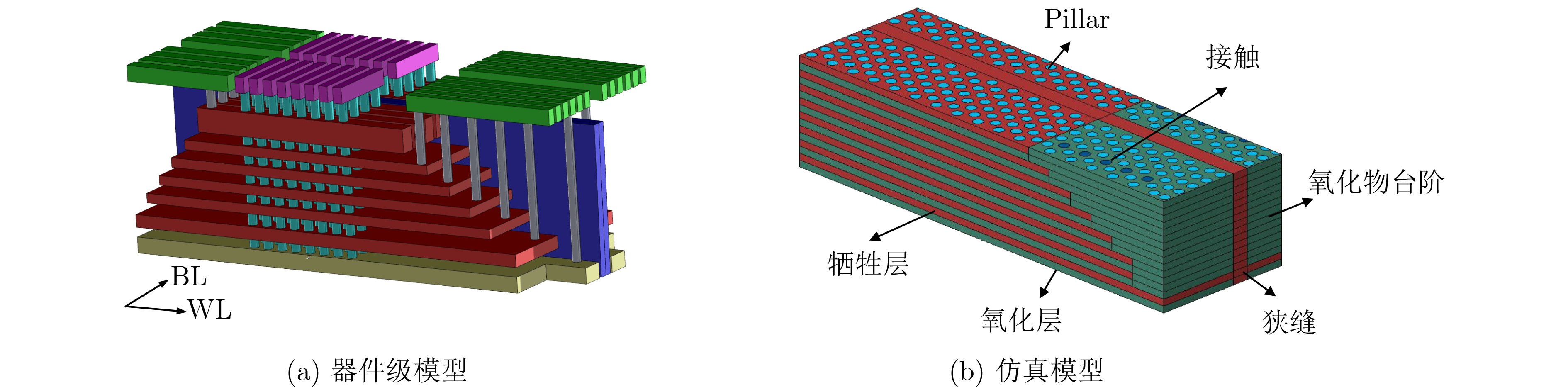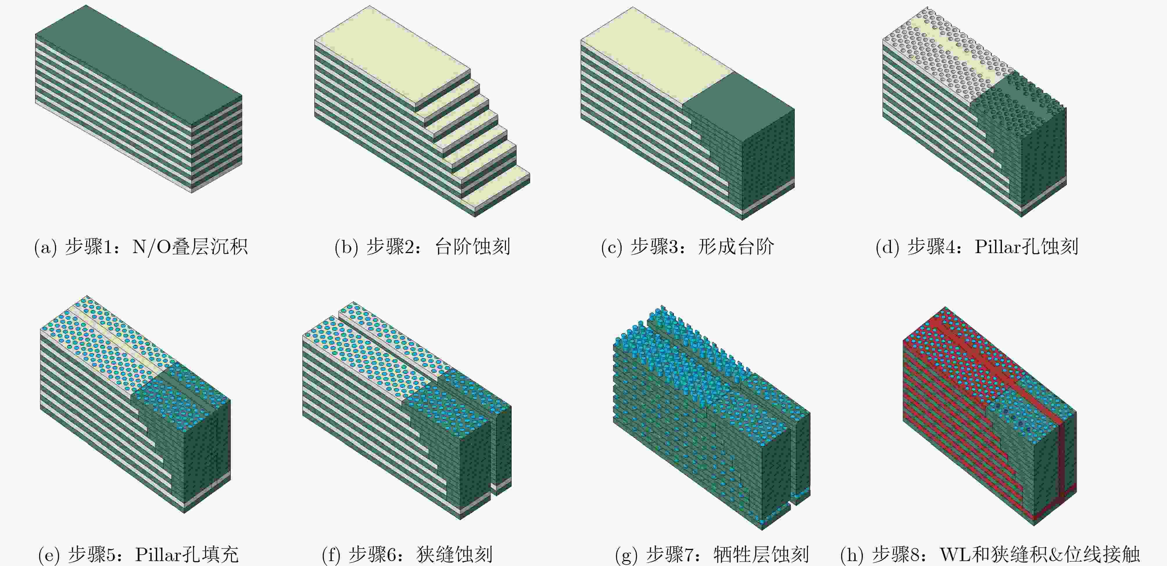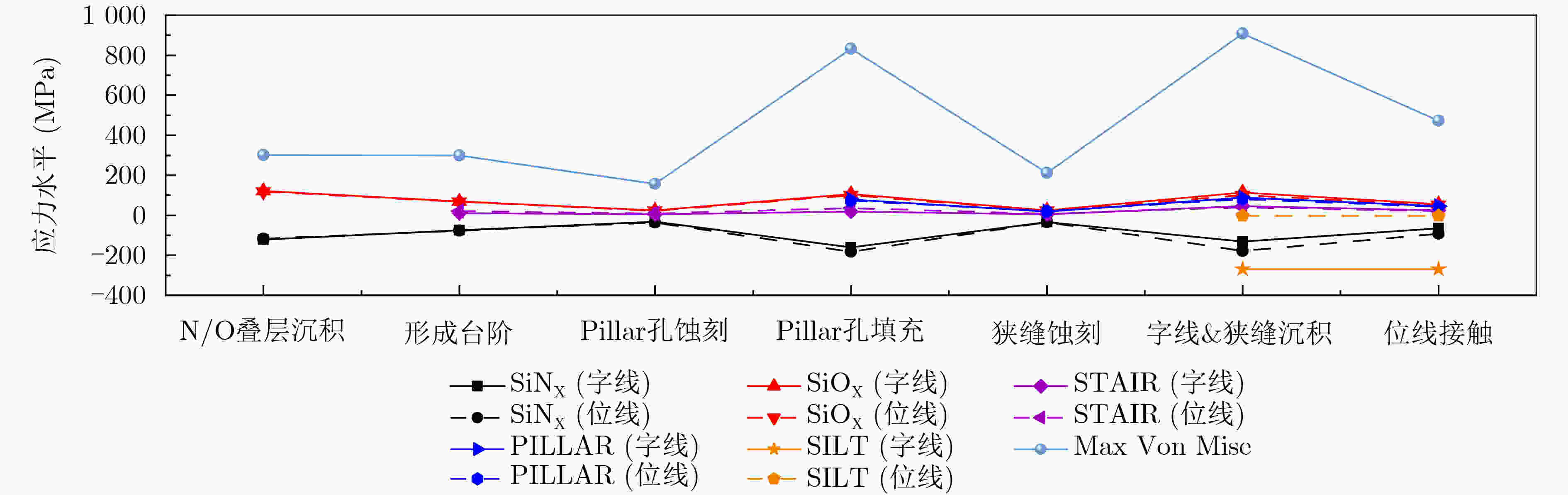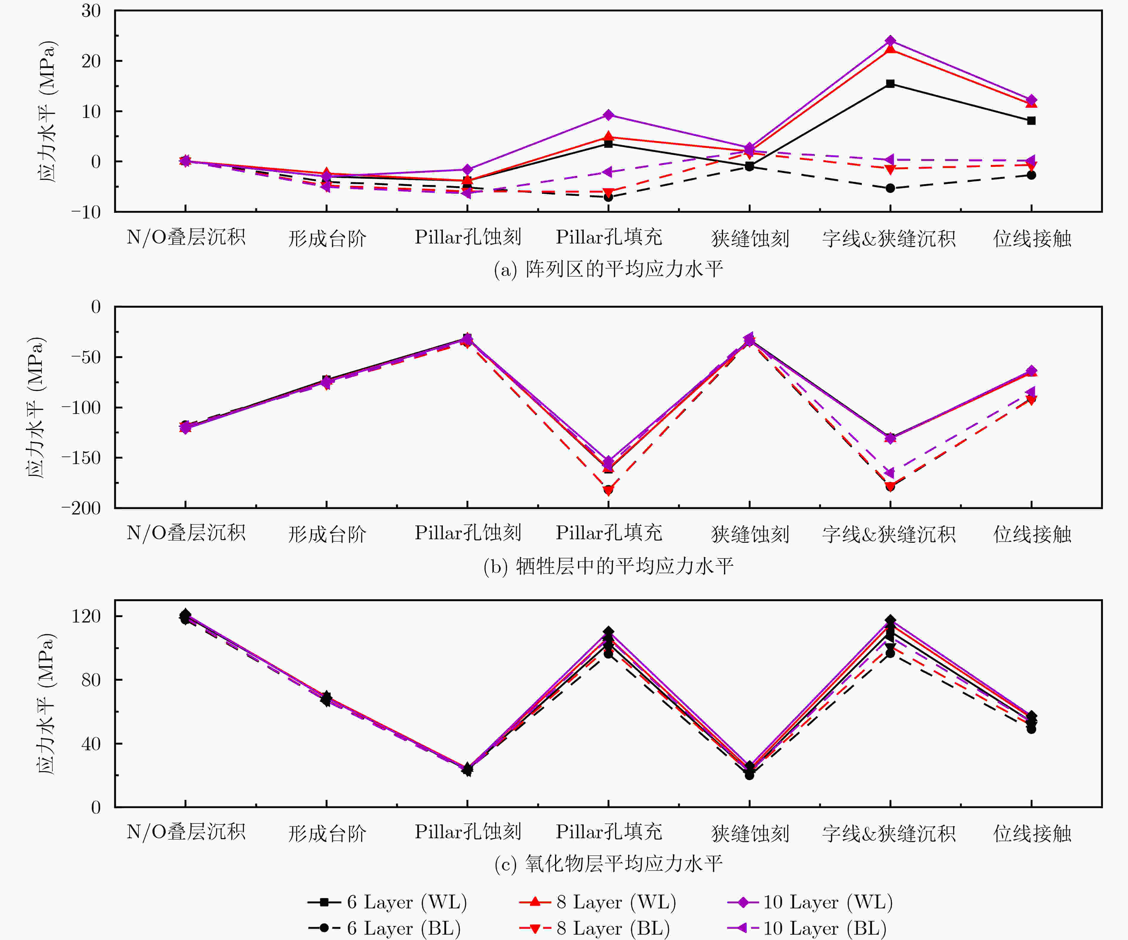 Objective To improve the performance of 3D NAND architecture, a series of horizontal and vertical miniaturization strategies have been proposed. While these designs increase storage density, they also introduce integration challenges. In particular, thermo-mechanical stress during fabrication has become a critical limitation on device yield and performance. This study establishes a high-precision process mechanics model of 3D NAND based on a local Representative Volume Element (RVE) finite element modeling framework, accounting for the multilayer stacked structure and various block architecture designs. By systematically investigating stress evolution during fabrication, the analysis identifies the root causes of stress non-uniformity and characterizes the dynamic distribution of mechanical stress under different miniaturization schemes. These findings have practical relevance for yield improvement and device reliability, addressing key challenges in advancing 3D NAND storage density. Methods This study constructs a high-precision, device-level finite element model of 3D NAND based on the theory of RVE. The simulation of thermal stress evolution throughout the manufacturing process uses the element birth/death technique in Abaqus. The baseline model features a representative 3D NAND structure comprising 8 Nitride/Oxide (N/O) bilayers, each 25 nm thick. Within a 40-nm-wide slit, 15 storage pillars, each with a diameter of 24 nm and spaced at 36 nm intervals, are arranged in a staggered configuration. To explore the effect of stacking layer number on stress evolution, modified models with 6 and 10 N/O layers are also developed. In addition, to examine the effect of different block architecture transitions, models incorporating 5 and 10 pillars per block are analyzed. The material properties used are consistent with those reported in previous studies, where both the calibration of material parameters and the modeling methodology are validated. Results and Discussions Process-dependent simulations were conducted to examine the evolution of stress distribution during key 3D NAND fabrication steps and to assess the effects of vertical stacking layers ( Fig. 7 ) and block architecture designs (Fig. 8 ). The results show that metal volume fraction, the number of pillars in the array region, and the presence of oxide stairs are primary factors influencing stress distribution. A higher metal volume fraction markedly increases internal stress due to thermal expansion mismatch. Asymmetric metal layouts in the Word Line (WL) and Bit Line (BL) directions intensify stress anisotropy between these axes. Pillars in the array region help alleviate stress concentration by generating tensile zones during nitride/metal thermal deformation, thereby reducing the overall compressive stress. In contrast, oxide stairs constrain deformation along the WL direction, inhibiting stress relaxation and resulting in localized compressive regions. These combined mechanisms indicate that increasing the number of WL layers tends to enhance stress asymmetry, whereas block architectures with a larger number of pillars reduce the degree of stress non-uniformity.Conclusions Using a process mechanics model based on the RVE approach, this study explored stress evolution in 3D NAND fabrication. The effects of two major scaling strategies—vertical layer stacking and horizontal block architecture conversion, were systematically analyzed with respect to stress magnitude and directional asymmetry. The results show that asymmetric stress distribution originates during the step etching stage and peaks following WL and slot filling. As the number of vertical stacking layers increases, structural compressive stress intensifies, particularly in the WL and BL directions. Increasing the number of layers from 6 to 10 results in an 8.54 MPa rise in WL compressive stress and a 5.66 MPa rise in BL stress, with the WL-BL stress difference increasing from 20.76 MPa to 24.64 MPa. Larger-area block architectures effectively mitigate stress asymmetry. Compared with the 5-pillar configuration, the 15-pillar architecture reduces WL-BL stress asymmetry by 22.4%. The composite structure of oxide and tungsten, combined with the constraint effects of pillars and stepped oxide on sacrificial layer deformation, plays a central role in modulating stress levels and directional distribution in 3D NAND structures. -