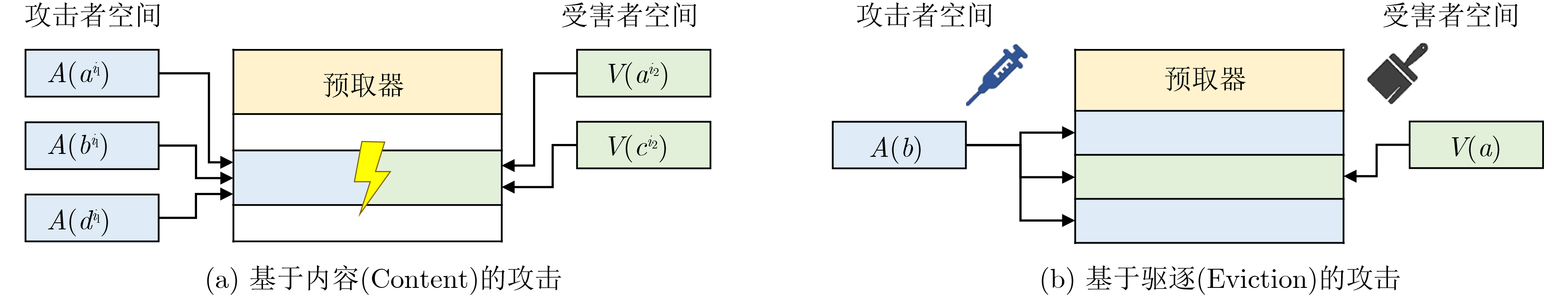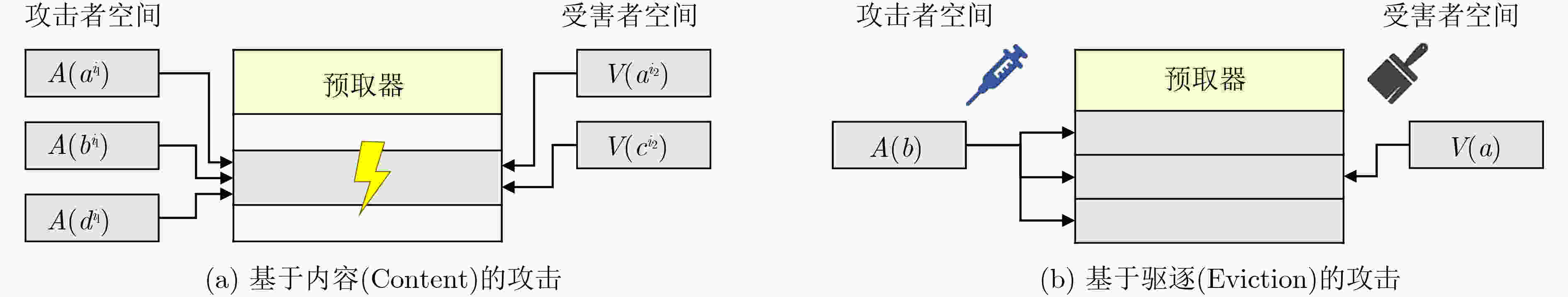 图  3  基于内容和基于驱逐的数据预取器侧信道攻击示意图