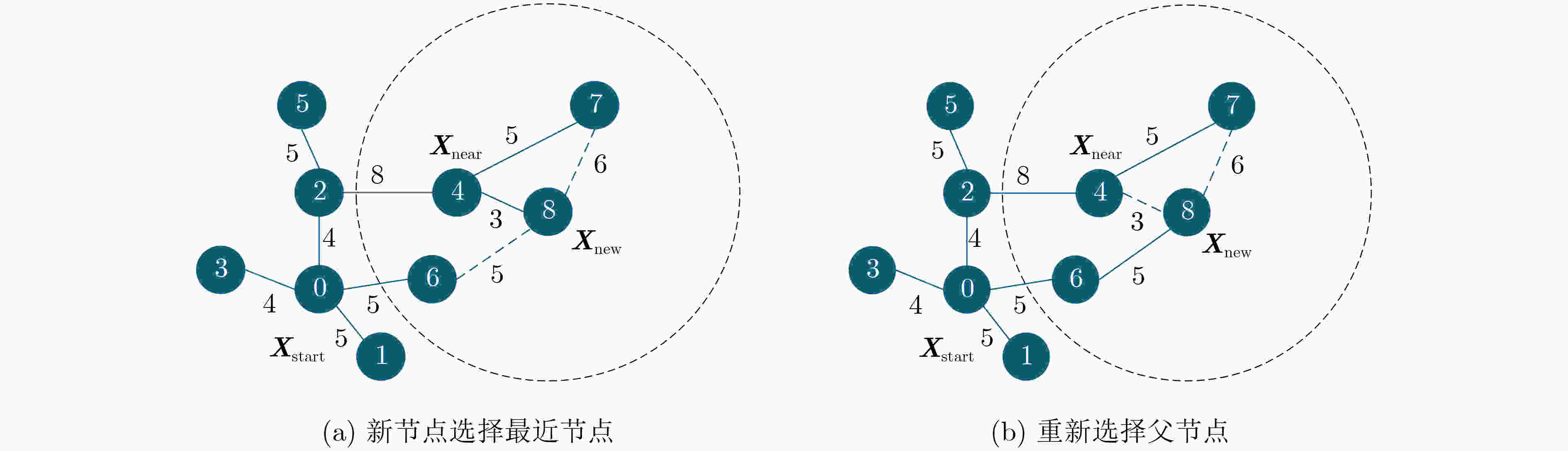 范围内根据式(10)计算综合代价${F_{{\text{rrt*}}}}$,选择最优父节点;(5)更新数据结构:更新搜索树$ \mathbf{\mathrm{\mathbf{Tree}}}_{\text{start}} $,添加${{\boldsymbol X}_{{\text{new}}}}$并优化