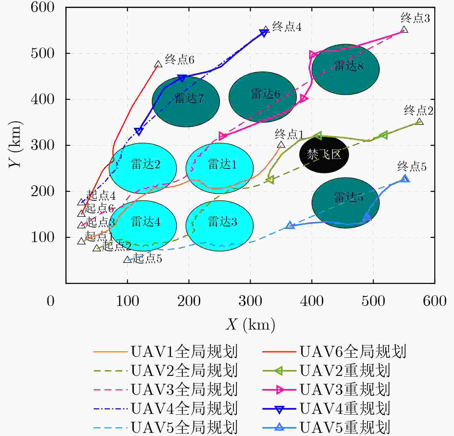 无人机序号 起点 终点 UAV1 (25, 90) (550, 550) UAV2 (50, 75) (390, 275) UAV3 (25, 125) (475, 385) UAV4 (25, 175) (300, 500) UAV5 (100, 50) (550, 225) UAV6 (25, 200) (200, 550) 表 2 场景1中威胁位置设置(km)
