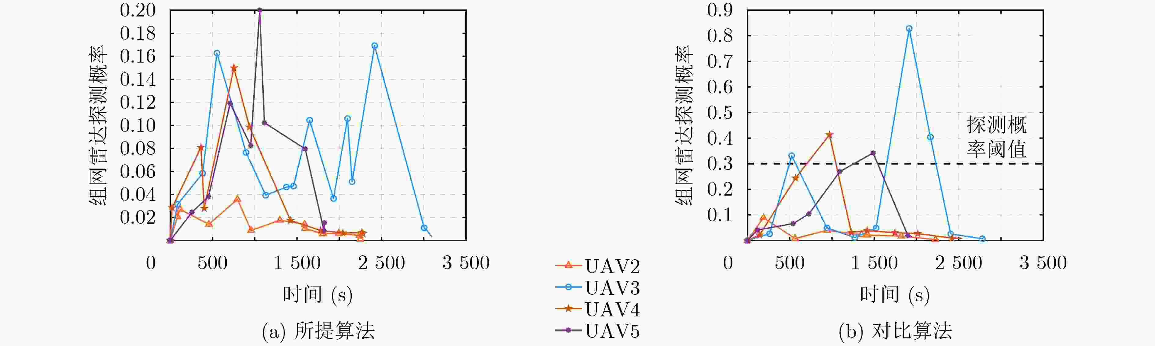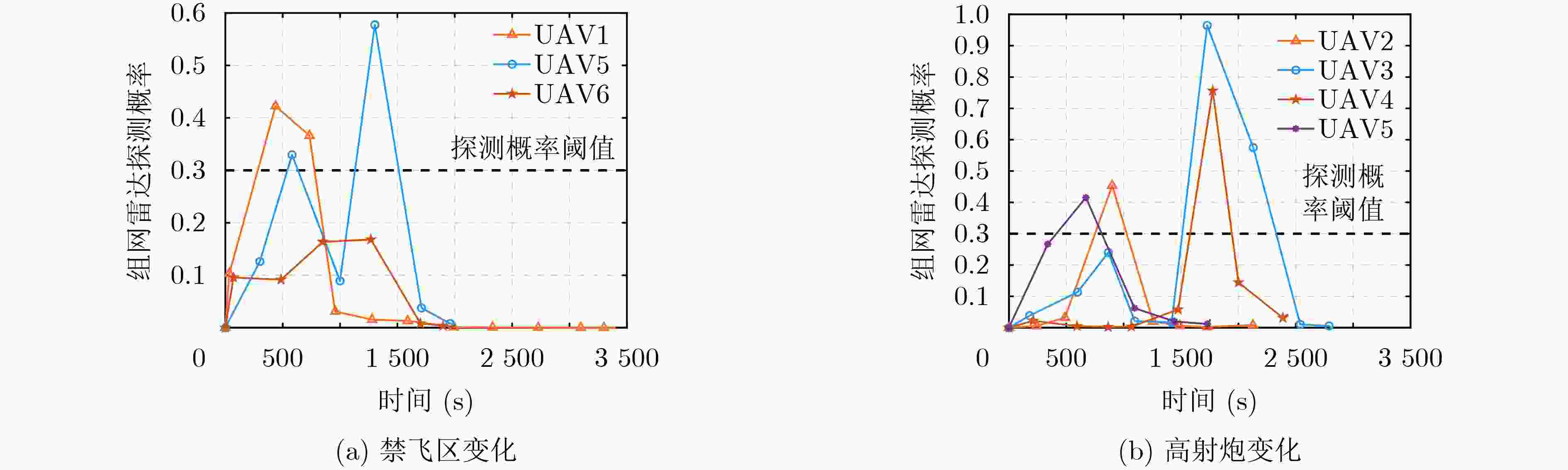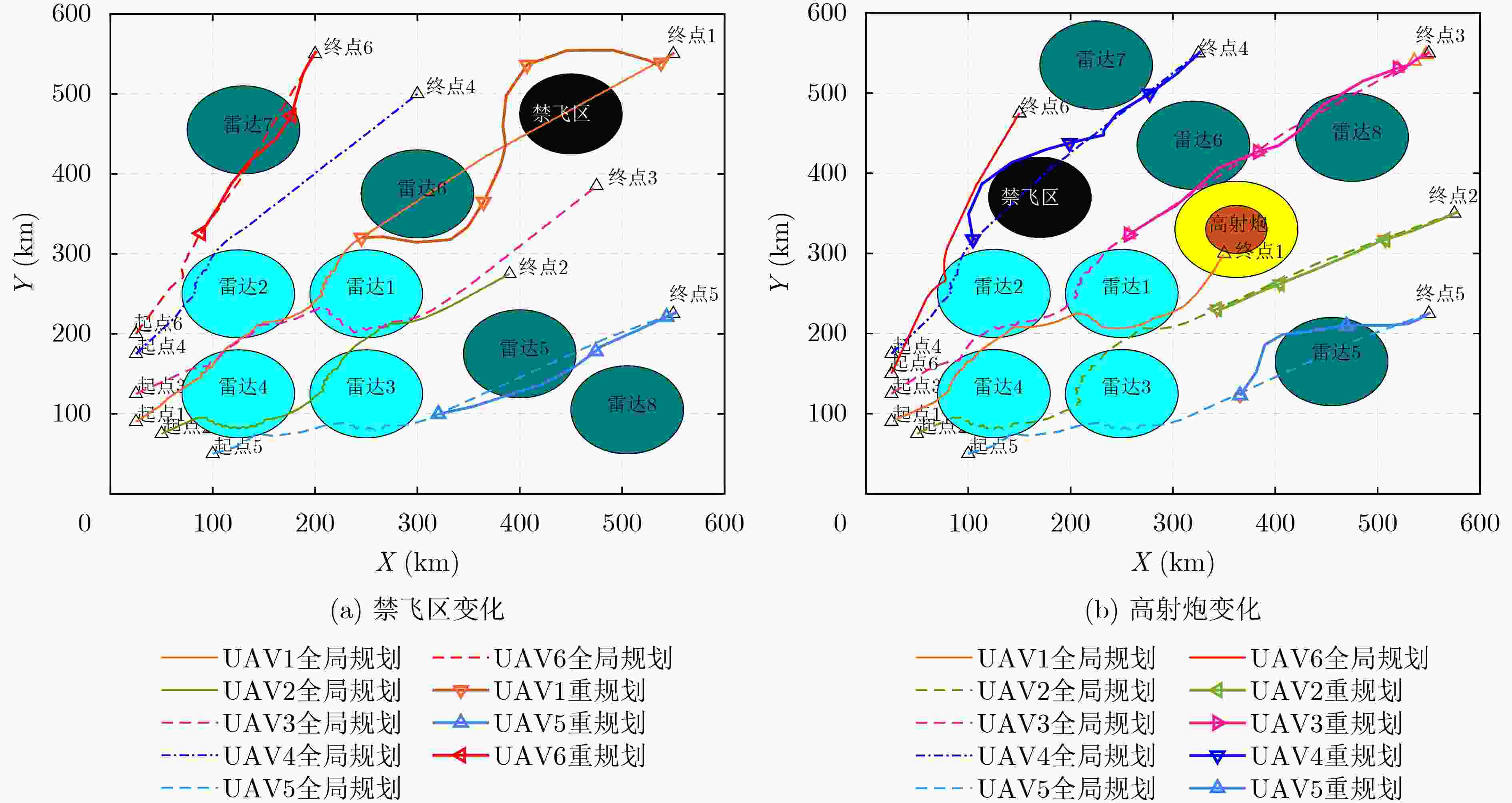 算法 航程(km) 综合代价 运行时间(s) 所提算法 1314.0 15.3403 100.7304 对比算法 1325.1 16.8436 82.9551 表 4 场景2中动态威胁位置设置