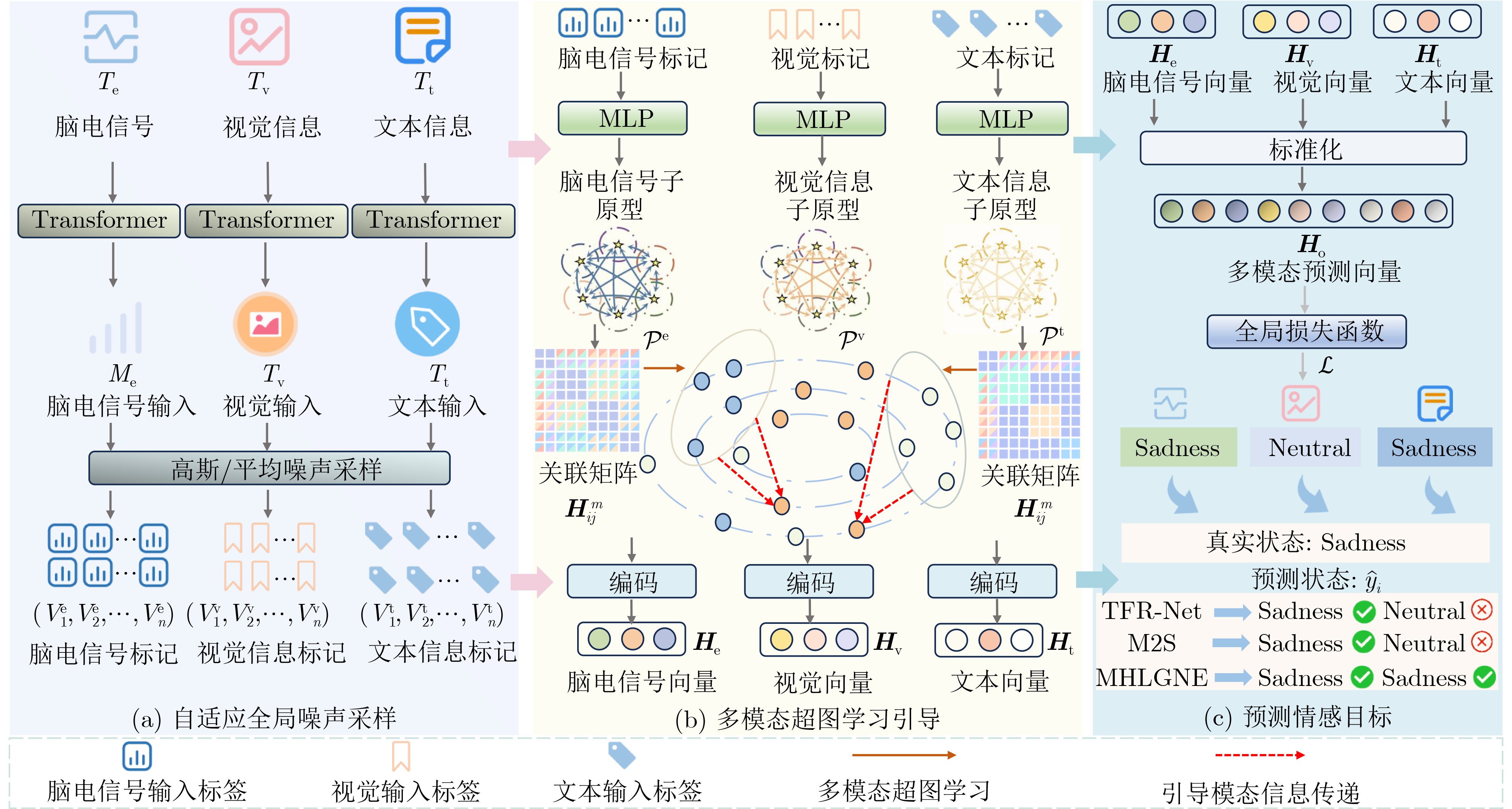 Objective Multimodal Sentiment Analysis (MSA) has shown considerable promise in interdisciplinary domains such as Natural Language Processing (NLP) and Affective Computing, particularly by integrating information from ElectroEncephaloGraphy (EEG) signals, visual images, and text to classify sentiment polarity and provide a comprehensive understanding of human emotional states. However, in complex real-world scenarios, challenges including missing modalities, limited high-level semantic correlation learning across modalities, and the lack of mechanisms to guide cross-modal information transfer substantially restrict the generalization ability and accuracy of sentiment recognition models. To address these limitations, this study proposes a Multimodal Hypergraph Learning Guidance method with Global Noise Enhancement (MHLGNE), designed to improve the robustness and performance of MSA under conditions of missing modality information in complex environments. Methods The overall architecture of the MHLGNE model is illustrated in Fig. 2 and consists of the Adaptive Global Noise Sampling Module, the Multimodal Hypergraph Learning Guiding Module, and the Sentiment Prediction Target Module. A pretrained language model is first applied to encode the multimodal input data. To simulate missing modality conditions, the input data are constructed with incomplete modal information, where a modality $ m\in \{{\mathrm{e,v,t}}\} $ is randomly absent. The adaptive global noise sampling strategy is then employed to supplement missing modalities from a global perspective, thereby improving adaptability and enhancing both robustness and generalization in complex environments. This design allows the model to handle noisy data and missing modalities more effectively. The Multimodal Hypergraph Learning Guiding Module is further applied to capture high-level semantic correlations across different modalities, overcoming the limitations of conventional methods that rely only on feature alignment and fusion. By guiding cross-modal information transfer, this module enables the model to focus on essential inter-modal semantic dependencies, thereby improving sentiment prediction accuracy. Finally, the performance of MHLGNE is compared with that of State-Of-The-Art (SOTA) MSA models under two conditions: complete modality data and randomly missing modality information.Results and Discussions Three publicly available MSA datasets (SEED-IV, SEED-V, and DREAMER) are employed, with features extracted from EEG signals, visual images, and text. To ensure robustness, standard cross-validation is applied, and the training process is conducted with iterative adjustments to the noise sampling strategy, modality fusion method, and hypergraph learning structure to optimize sentiment prediction. Under the complete modality condition, MHLGNE is observed to outperform the second-best M2S model across most evaluation metrics, with accuracy improvements of 3.26%, 2.10%, and 0.58% on SEED-IV, SEED-V, and DREAMER, respectively. Additional metrics also indicate advantages over other SOTA methods. Under the random missing modality condition, MHLGNE maintains superiority over existing MSA approaches, with improvements of 1.03% in accuracy, 0.24% in precision, and 0.08 in Kappa score. The adaptive noise sampling module is further shown to effectively compensate for missing modalities. Unlike conventional models that suffer performance degradation under such conditions, MHLGNE maintains robustness by generating complementary information. In addition, the multimodal hypergraph structure enables the capture of high-level semantic dependencies across modalities, thereby strengthening cross-modal information transfer and offering clear advantages when modalities are absent. Ablation experiments confirm the independent contributions of each module. The removal of either the adaptive noise sampling or the multimodal hypergraph learning guiding module results in notable performance declines, particularly under high-noise or severely missing modality conditions. The exclusion of the cross-modal information transfer mechanism causes a substantial decline in accuracy and robustness, highlighting its essential role in MSA. Conclusions The MHLGNE model, equipped with the Adaptive Global Noise Sampling Module and the Multimodal Hypergraph Learning Guiding Module, markedly improves the performance of MSA under conditions of missing modalities and in tasks requiring effective cross-modal information transfer. Experiments on SEED-IV, SEED-V, and DREAMER confirm that MHLGNE exceeds SOTA MSA models across multiple evaluation metrics, including accuracy, precision, Kappa score, and F1 score, thereby demonstrating its robustness and effectiveness. Future work may focus on refining noise sampling strategies and developing more sophisticated hypergraph structures to further strengthen performance under extreme modality-missing scenarios. In addition, this framework has the potential to be extended to broader sentiment analysis tasks across diverse application domains. -