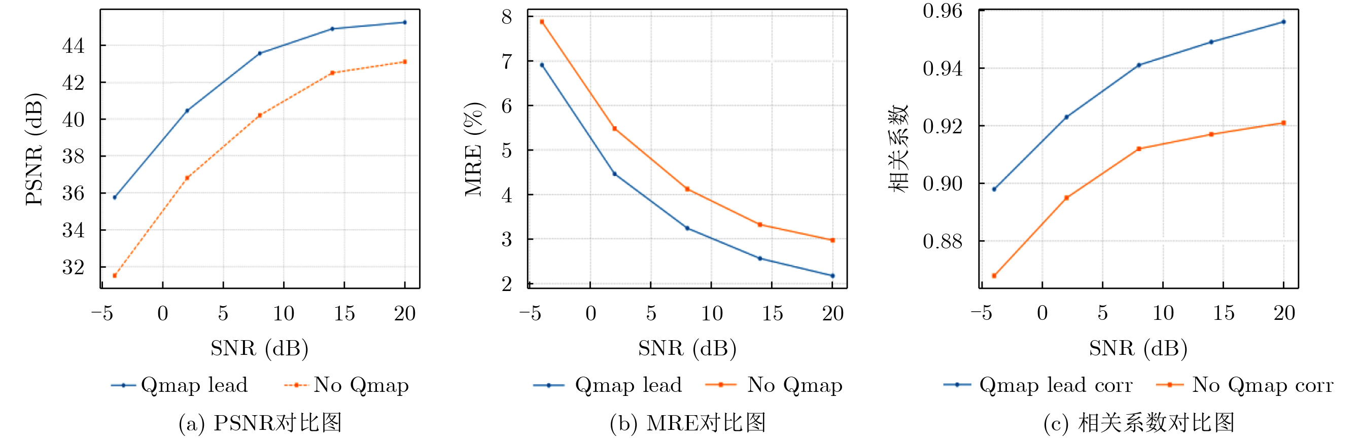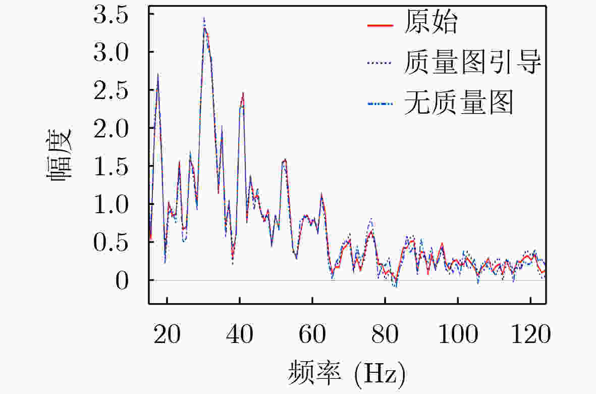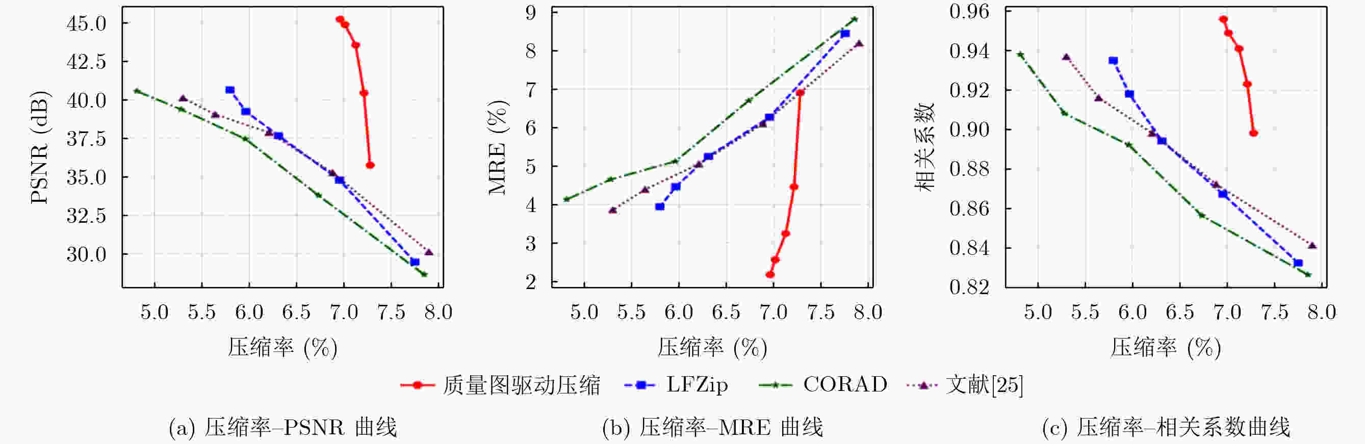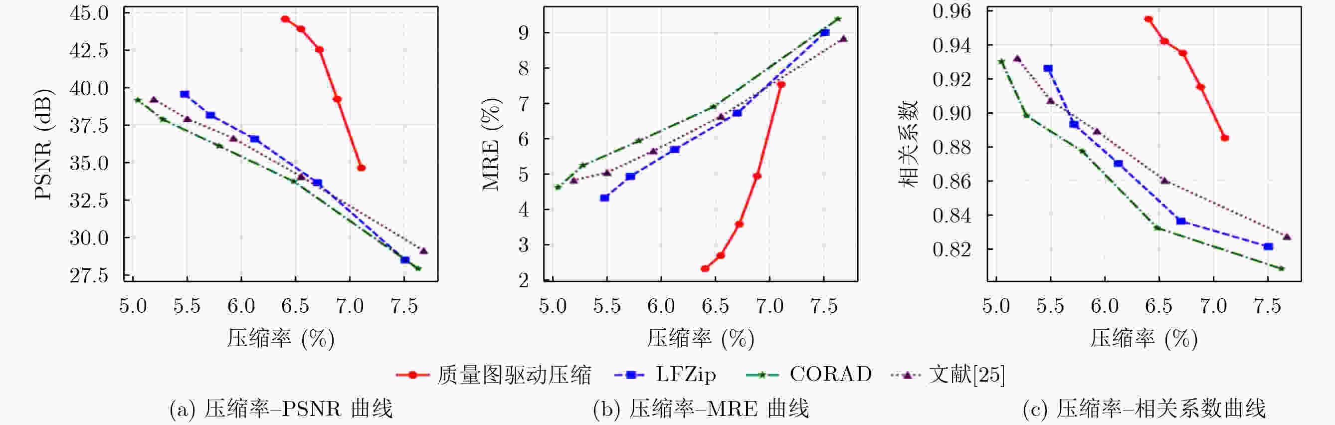 压缩结果 压缩方法 –4 dB数据 2 dB数据 8 dB数据 14 dB数据 20 dB数据 压缩率(%) 质量图驱动压缩 7.104 6.882 6.718 6.547 6.403 LFZip 7.506 6.700 6.124 5.716 5.478 CORAD 7.625 6.482 5.794 5.279 5.049 文献[25]方法 7.677 6.551 5.927 5.502 5.194 PSNR(dB) 质量图驱动压缩 34.61 39.21 42.51 43.89 44.55 LFZip 28.46 33.62 36.54 38.13 39.53 CORAD 27.88 33.71 36.08 37.84 39.13 文献[25]方法 29.09 34.03 36.59 37.89 39.20 MRE(%) 质量图驱动压缩 7.53 4.94 3.58 2.69 2.27 LFZip 9.00 6.72 5.69 4.93 4.32 CORAD 9.38 6.90 5.93 5.24 4.62 文献[25]方法 8.83 6.63 5.65 5.04 4.82 相关系数 质量图驱动压缩 0.885 0.915 0.935 0.942 0.955 LFZip 0.821 0.836 0.870 0.893 0.926 CORAD 0.808 0.832 0.877 0.898 0.930 文献[25]方法 0.827 0.860 0.889 0.907 0.932 -