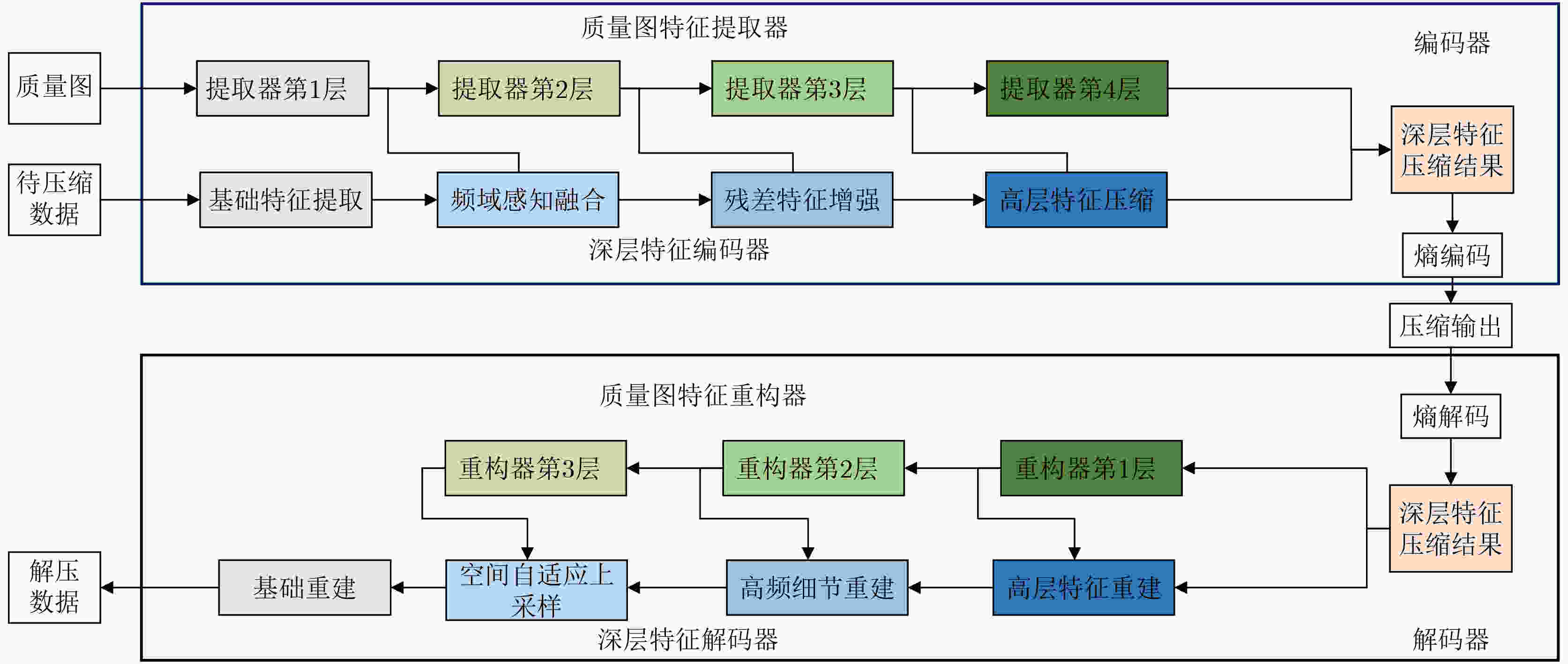 摘要: 在通信与雷达技术智能化演进过程中,射频数据压缩效率已成为制约传输带宽扩展和系统能效提升的关键因素。传统压缩方法在面对非均匀能量分布复杂场景时,往往难以兼顾压缩率与重构精度的平衡。针对非均匀能量分布的频谱数据保真压缩难题,该文提出一种质量图引导的频谱数据高能量区域保真压缩方法。该方法通过构建三维能量掩码,动态引导编码器增强高能量区域特征,同时结合多级复数卷积与逆向残差连接,实现数据特征的高效提取与精准重构。该方法的核心创新点包括3方面:复数提取网络生成质量图,实现能量与幅度分布多尺度建模;结合门控归一化抑制低能量噪声;引入残差结构和空间特征变换模块保留高频细节。实验结果表明,该方法在公开数据集RML2018.01a和自建数据集上的重构精度优于现有的经典算法,消融实验验证了质量图对高能量区域的关键保护作用,为非均匀能量分布数据压缩提供了新思路。Abstract:
