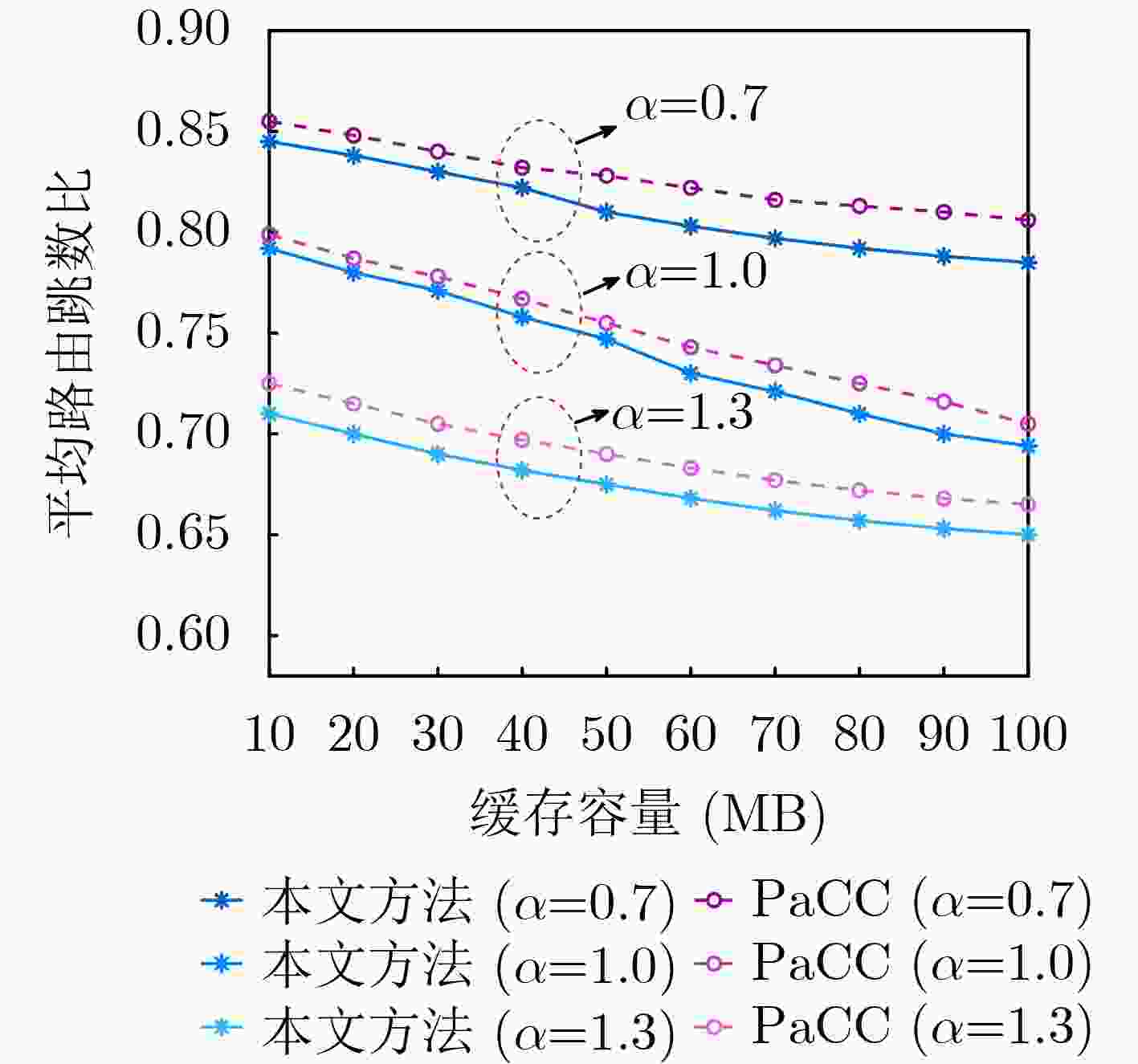 图  9  不同Zipf分布参数下平均路由跳数比与缓存容量的关系图