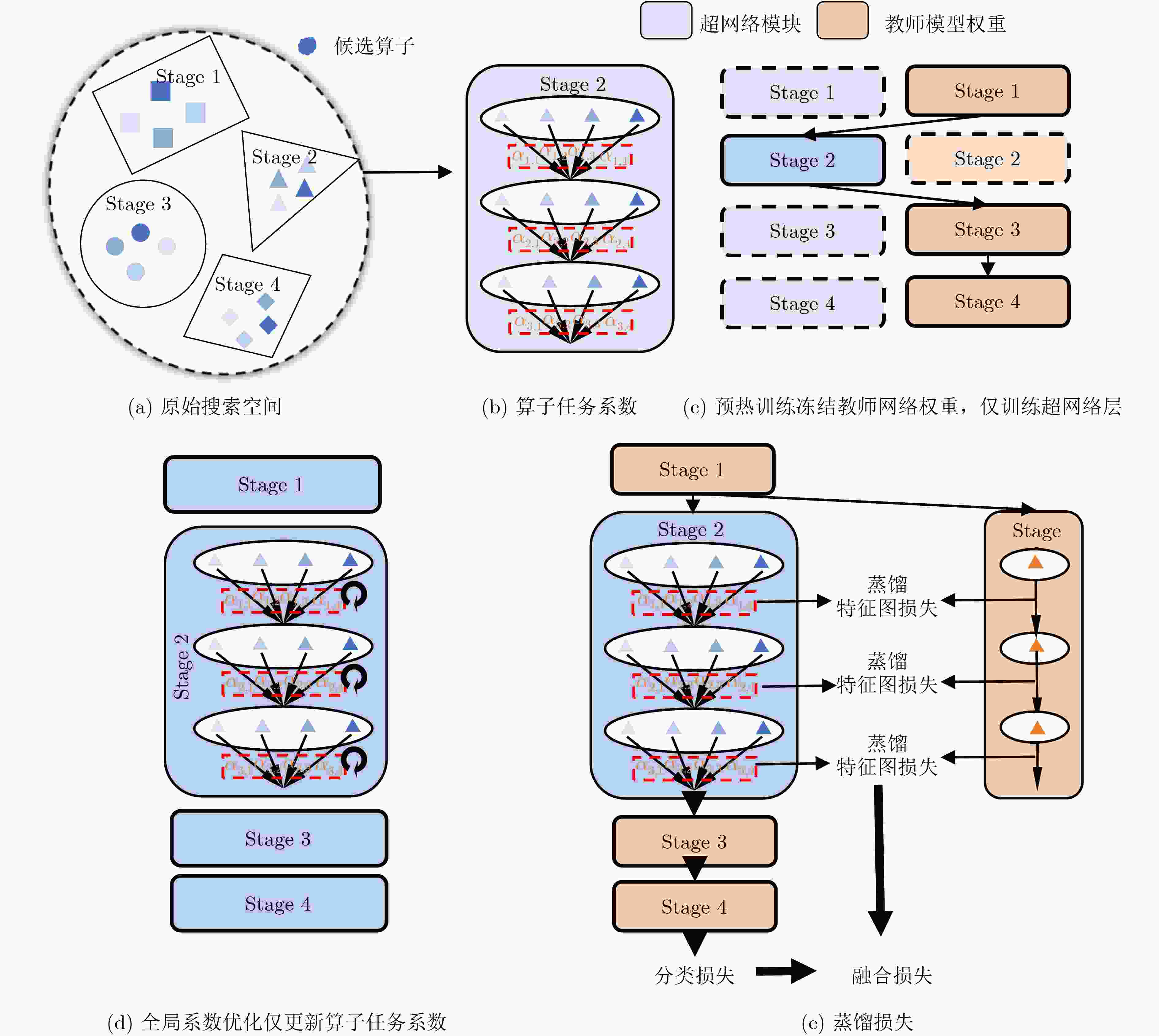 输入: 训练数据集D 含有L个stage的教师网络T={T1, T2, ···, T3} 超网络模块集合S={S1, S2, ···, S3},每个Si含候选权重参数