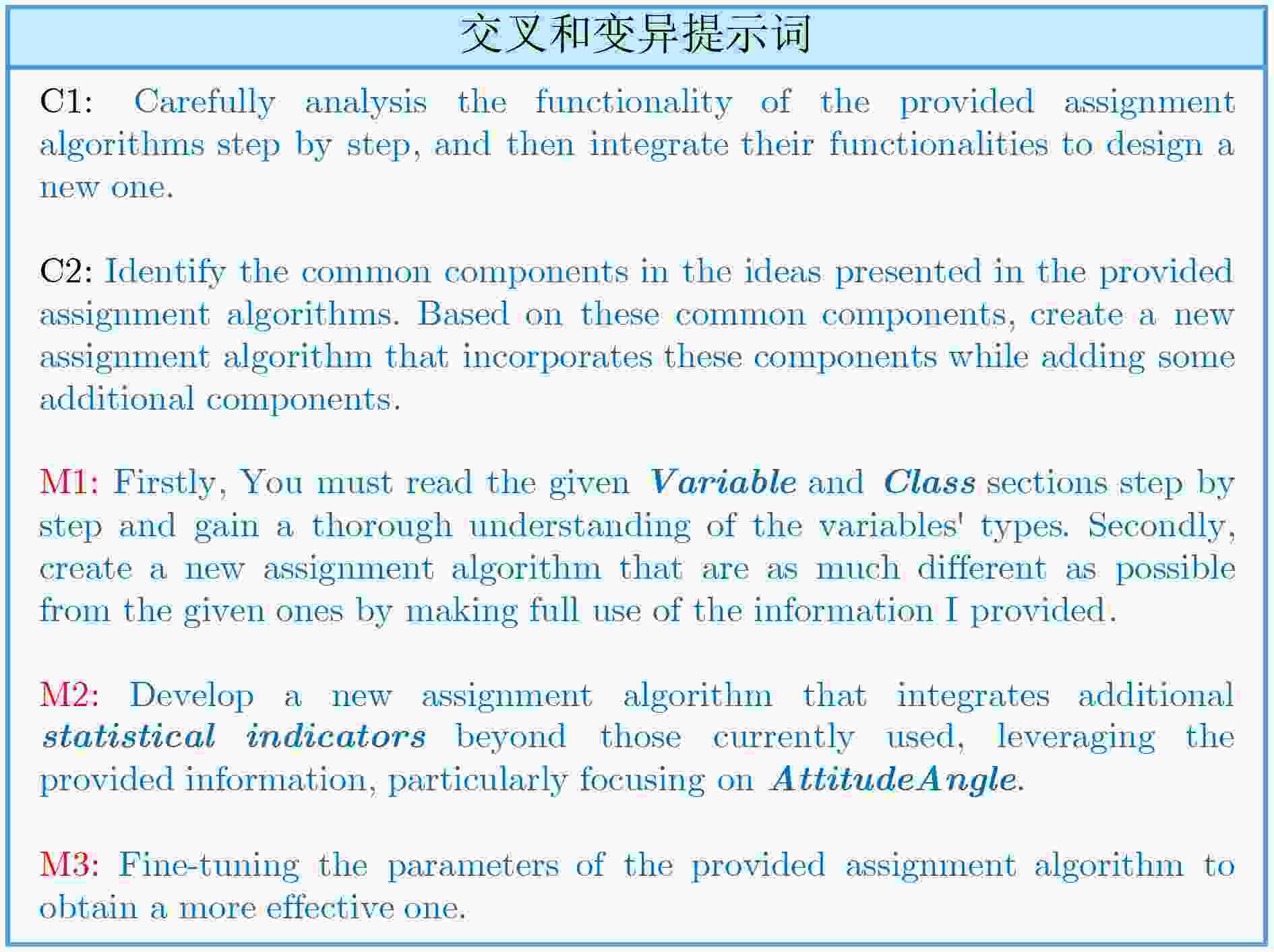 $ N\mathrm{_o} $,学习率$ \alpha $,折扣因子$ \gamma $,训练迭代次数$ E\mathrm{_{max}} $输出:最优任务分配算法库$ \mathcal{A} $,训练好的RL策略$ {Q}^{\mathrm{*}} $ /* 第一阶段:基于多场景进化的离线算法库构建 */ 1 初始化算法库$ \mathcal{A}\leftarrow \mathcal{\varnothing } $ 2 for 每个场景$ S\mathit{\mathrm{_{\mathit{\mathrm{\mathrm{k\mathrm{ }}}}}}}\in\mathcal{S}_{\mathrm{train}} $ do: 3 初始化:使用LLM生成针对场景$ S{_{{{k}}}} $的初始种群$ \mathrm{Pop} $ 4 for $ g=1 $ to $ G\mathrm{_{EC}} $ do 5 评估$ \mathrm{Pop} $中所有个体的适应度(在场景$ S{_k} $下的收益) 6 通过轮盘赌方法选择父代个体 7 交叉与变异: 8 for 每一对父代 do 9 if $ \text{Random} < p\mathrm{_c} $ then 10 通过LLM对父代代码进行交叉,生成子代 11 else 12 直接保留父代 13 end if 14 end for 15 for 每个子代 do 16 if $ \text{Random} < p\mathrm{_c} $ then 17 通过LLM变异提示对代码进行变异 18 end if 19 end for 20 更新种群$ \mathrm{\mathrm{Pop}\mathrm{ }} $,保留最优个体 21 end for 22 $ \pi_{\mathrm{\mathit{k}}}^{\mathrm{*}}\leftarrow $从$ \mathrm{Pop} $中选取的最优算法 23 $ \mathcal{A}\leftarrow \mathcal{A}\cup \{\pi _{k}^{\mathrm{*}}\} $ 24 end for /* 第二阶段:基于求解状态的RL策略训练 */ 25 初始化Q表$ Q(\boldsymbol{s},a)\leftarrow 0 $ 26 for episode $ e=1 $ to $ E\mathrm{_{max}} $ do 27 随机选择场景$ S\in\mathcal{S}\mathrm{_{train}} $,初始化解$ {\boldsymbol{x}}_{0} $ 28 初始化求解状态$ {\boldsymbol{s}}_{0} $ 29 while 未满足终止条件 do 30 动作选择:基于当前状态$ {\boldsymbol{s}}_{t} $,使用$\varepsilon $-greedy策略从库