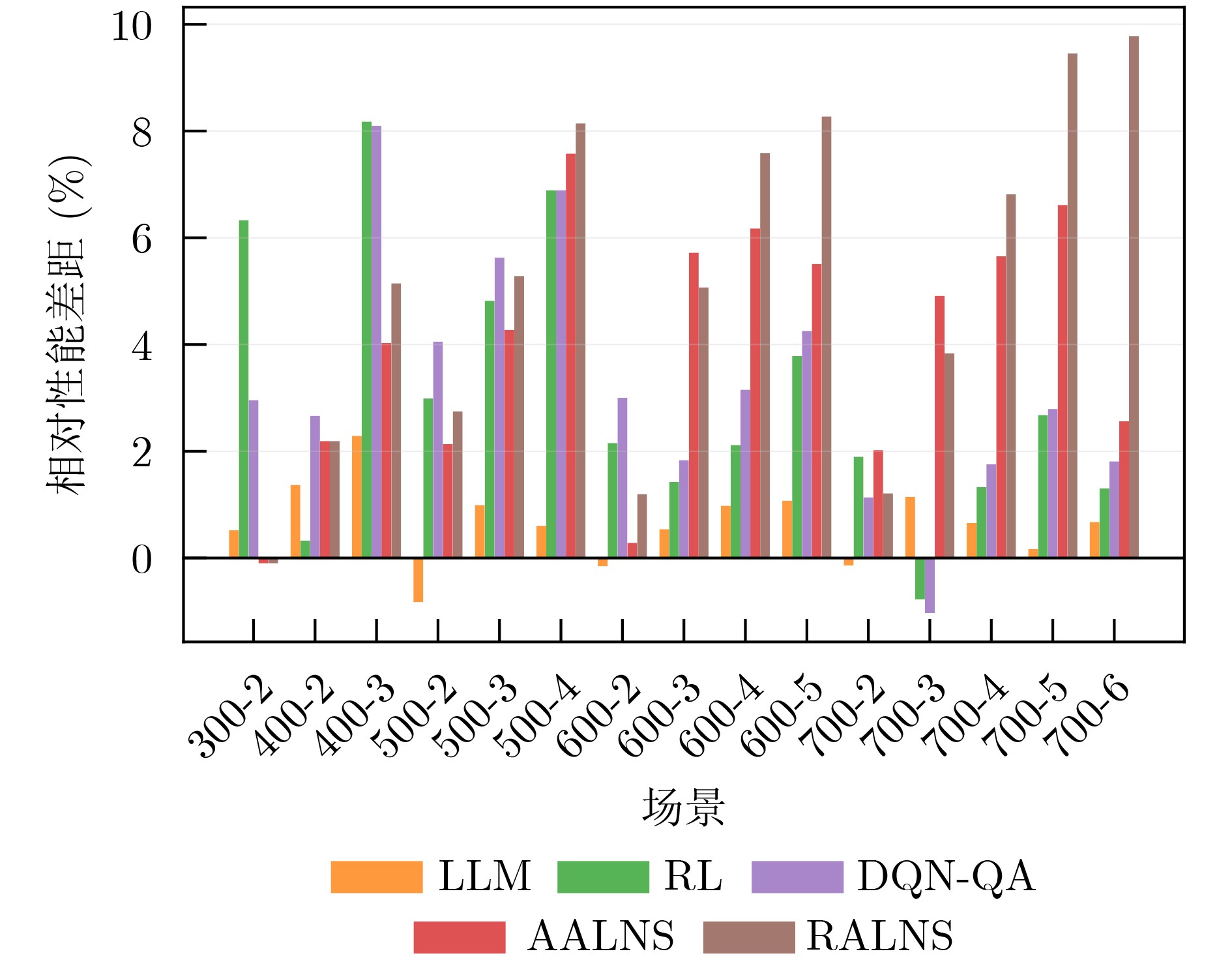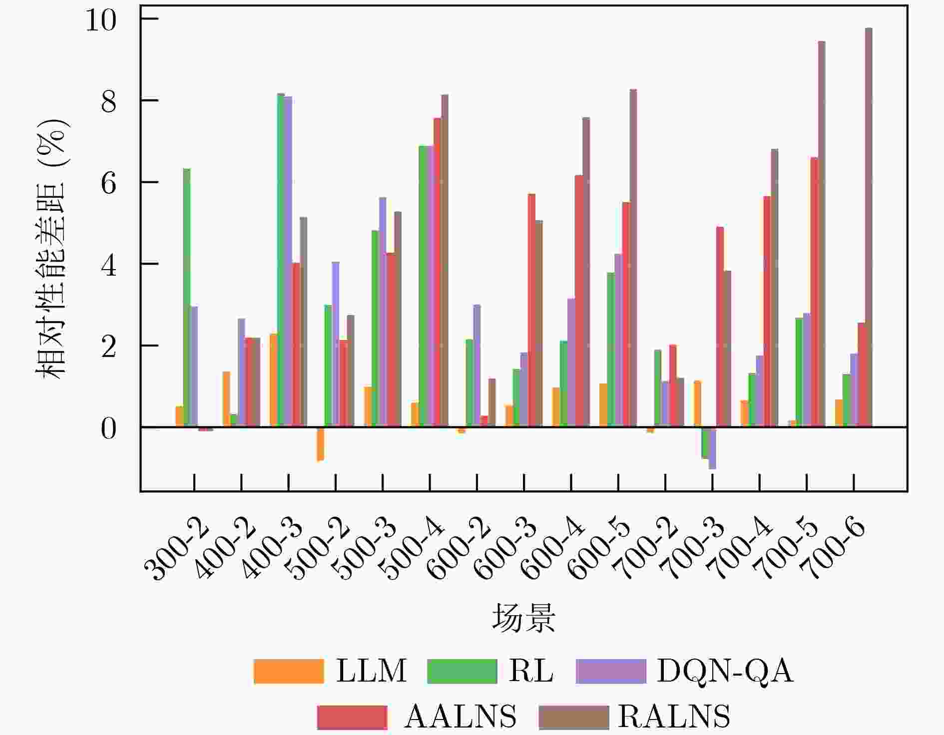 Scen. AAD LLM-Only RL-Only DQN-QA A-ALNS R-ALNS Profit Profit Gap Profit Gap Profit Gap Profit Gap Profit Gap 300-2 1405.8 1398.5 0.5 1316.8 6.3 1364.2 3.0 1407.2 –0.1 1407.2 –0.1 400-2 1693 1669.8 1.4 1687.5 0.3 1647.9 2.7 1655.9 2.2 1655.9 2.2 400-3 1969.9 1924.8 2.3 1808.8 8.2 1810.4 8.1 1890.5 4.0 1868.5 5.1 500-2 1836.9 1852.1 –0.8 1782 3.0 1762.4 4.1 1797.7 2.1 1786.4 2.8 500-3 2388.2 2364.5 1.0 2273.1 4.8 2253.8 5.6 2286.1 4.3 2262 5.3 500-4 2586.2 2570.6 0.6 2408 6.9 2408 6.9 2390.2 7.6 2375.6 8.1 600-2 2004.7 2007.8 –0.2 1961.5 2.2 1944.5 3.0 1999 0.3 1980.7 1.2 600-3 2569.4 2555.5 0.5 2532.8 1.4 2522.3 1.8 2422.4 5.7 2439.1 5.1 600-4 2989.4 2960.1 1.0 2926.1 2.1 2895.1 3.2 2804.8 6.2 2762.6 7.6 600-5 3067.2 3034.2 1.1 2951.1 3.8 2936.7 4.3 2898.2 5.5 2813.4 8.3 700-2 2260 2263.2 –0.1 2217.1 1.9 2234.3 1.1 2214.3 2.0 2232.6 1.2 700-3 2762.4 2730.7 1.1 2783.9 –0.8 2790.9 –1.0 2626.7 4.9 2656.4 3.8 700-4 3246.3 3225 0.7 3203.1 1.3 3189.3 1.8 3062.8 5.7 3025.1 6.8 700-5 3646.3 3640.1 0.2 3548.6 2.7 3544.5 2.8 3405.1 6.6 3301.6 9.5 700-6 3865.6 3839.5 0.7 3815.2 1.3 3795.6 1.8 3766.5 2.6 3487.5 9.8 表 2 AAD框架在不同规模场景下的离线训练时间开销(h)
