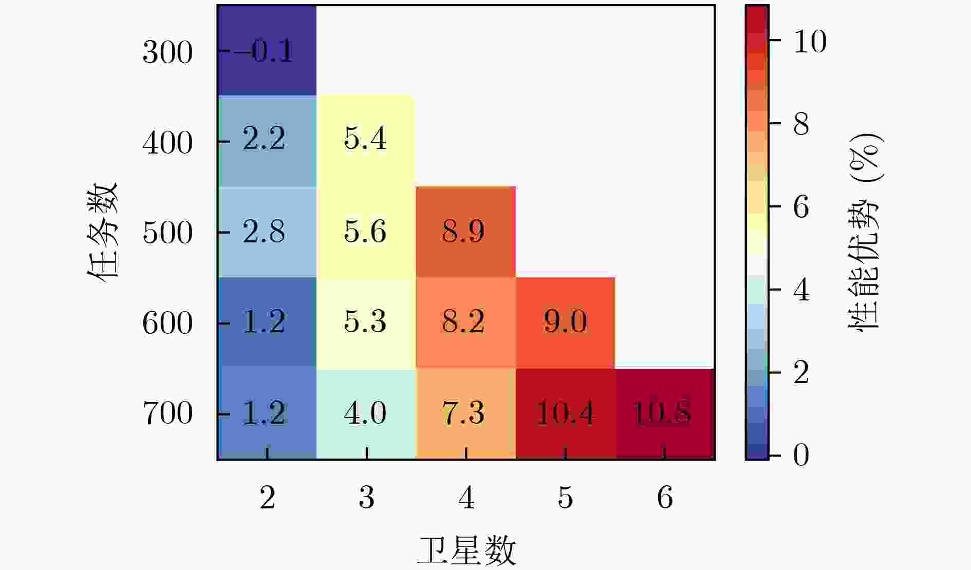 均衡因子根据卫星当前的负载情况,动态调整其被分配任务的可能性。负载越高,该因子越低,从而在系统层面促进任务的均衡分配:$ {F}_{\text{load}}(j)=\mathrm{max}(0.5,1-\dfrac{{L}_{j}}{{N}_{\text{rem}}}) $ 系统资源均衡 在每次决策中实现动态均衡,而非静态或后置调整 历史性能激励 为被成功分配任务的卫星累积一个性能因子,模拟一种“优胜劣汰”的自适应机制,使其在后续分配中更具竞争力:$ H_{j}^{(t+1)}=(1+\beta )\cdot H_{j}^{(t)} $ 卫星性能演化 新颖概念:引入自适应学习机制,打破了卫星能力固定的传统假设 地理/时间分布均衡度 评估将任务分配给某卫星后,是否有助于该卫星任务集的时空聚集性,鼓励其对已覆盖区域或已安排任务的日期进行强化观测:$ {S}_{\mathrm{geo}/\text{temp}}(i,j)\propto \sum (\text{History}+1) $ 时空覆盖策略 新颖概念:从微观的任务满足,转向宏观的系统级时空布局优化 表 4 数学符号定义