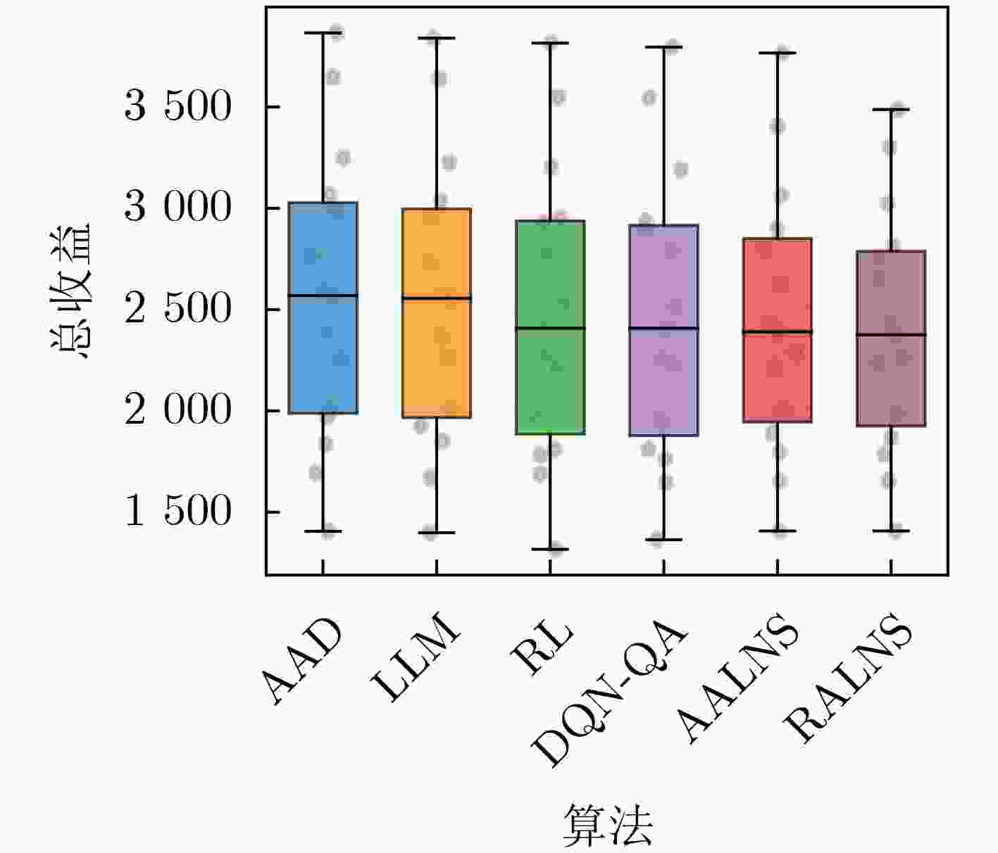 $ \alpha [{r}_{t}+\gamma \underset{a\mathrm{'}}{\max }Q({\boldsymbol{s}}_{t+1},a\mathrm{'})-Q({\boldsymbol{s}}_{t},{a}_{t})] $35 更新当前解与状态:$ {\boldsymbol{x}}_{t}\leftarrow {\boldsymbol{x}}_{t+1},{\boldsymbol{s}}_{t}\leftarrow {\boldsymbol{s}}_{t+1} $ 36 end while 37 end for 38 return $ \mathcal{A},{Q}^{\mathrm{*}} $ 表 1 对比算法在求解MAEOSMSP上的收益结果对比
