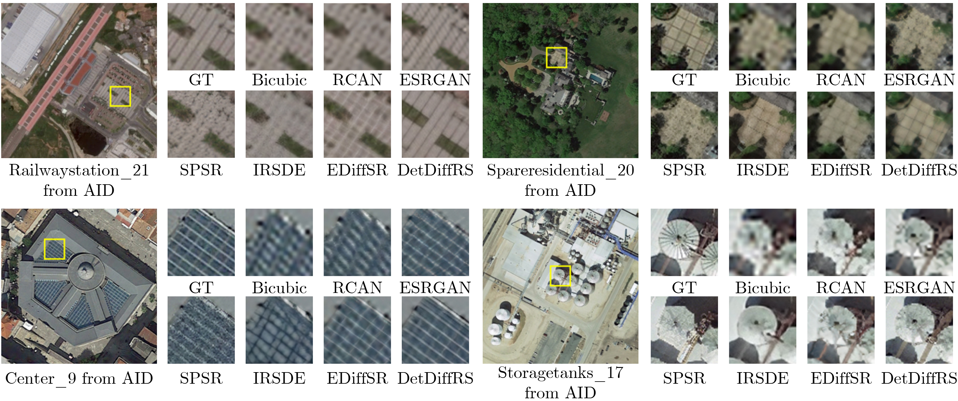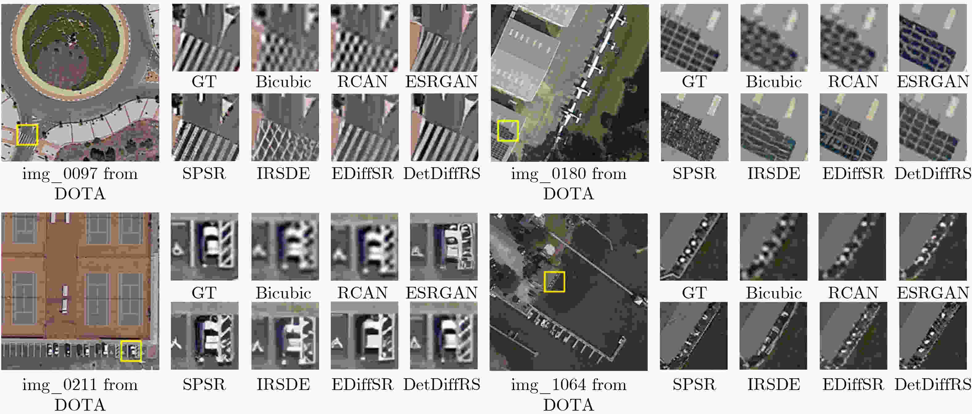 类别 Bicubic EDSR[33] RCAN[34] HAT-L[41] TTST[59] MSRGAN[44] ESRGAN[12] SPSR[45] SR3[16] IRSDE[48] EDiffSR[51] 本文 Airport 126.84 86.77 88.27 87.46 86.47 54.23 55.23 57.55 56.93 54.47 53.33 50.83 Bare Land 112.58 91.31 93.86 90.81 90.12 66.66 61.83 70.93 77.75 80.25 66.38 67.13 Baseball Field 130.83 88.67 92.01 90.85 90.91 50.48 46.39 56.85 71.56 57.95 52.58 51.53 Beach 122.18 105.67 104.97 101.97 102.06 50.07 48.45 52.34 51.38 42.39 43.49 40.55 Bridge 138.11 80.77 81.96 81.63 80.84 48.34 50.85 49.93 74.43 45.64 50.45 46.02 Center 139.63 71.68 73.32 70.99 72.19 49.88 55.44 48.15 53.27 44.93 42.73 44.09 Church 122.35 86.47 88.44 88.57 87.67 52.38 51.59 54.86 62.99 49.66 50.12 50.85 Commercial 111.69 110.98 110.77 103.94 105.05 54.75 56.53 60.38 70.82 51.92 55.44 54.69 Dense Residential 126.94 112.81 126.07 125.57 122.28 51.21 58.55 55.76 64.04 39.87 40.59 37.57 Desert 114.92 77.88 77.49 76.88 75.41 55.61 54.88 63.27 59.86 60.11 53.79 53.02 Farmland 144.04 91.86 94.38 95.59 95.03 67.17 55.39 57.49 78.23 61.11 50.94 51.68 Forest 103.82 88.32 94.51 95.85 95.64 59.53 64.44 62.13 72.79 48.49 46.28 43.26 Industrial 106.64 78.49 81.02 75.68 72.80 38.94 37.65 45.88 45.09 36.92 42.26 37.69 Meadow 134.26 108.74 105.79 102.09 101.07 96.61 69.71 65.49 86.11 69.64 65.95 68.78 Medium Residential 116.72 99.53 104.77 101.10 102.32 46.65 50.76 48.85 74.12 42.18 40.58 39.43 Mountain 103.45 106.11 106.29 103.11 101.10 58.24 54.94 70.40 71.89 58.55 51.93 52.48 Park 137.36 110.36 112.83 110.82 103.57 60.05 61.47 73.19 81.58 63.76 63.28 60.35 Parking 134.26 60.09 67.81 63.55 65.14 42.25 42.43 44.32 55.42 36.74 35.69 35.77 Playground 113.08 58.52 62.03 59.91 58.72 41.34 39.49 40.78 54.89 38.47 36.26 33.88 Pond 162.09 123.54 124.05 127.08 126.09 61.91 54.44 63.54 103.73 55.69 56.77 55.42 Port 134.49 77.28 79.89 80.11 82.35 46.27 46.94 51.13 58.19 47.90 47.62 47.54 Railway Station 113.93 92.81 94.43 88.41 87.88 49.58 53.01 57.65 56.99 49.01 51.57 50.06 Resort 131.65 100.04 104.77 105.61 105.13 59.20 61.23 68.16 68.03 59.86 57.76 57.43 River 150.87 105.66 108.52 108.43 107.60 54.18 59.81 64.47 83.71 59.55 57.15 58.21 School 109.36 85.29 89.02 81.65 82.24 50.59 49.66 53.26 59.63 48.28 46.63 46.39 Sparse Residential 148.27 134.92 141.27 133.06 132.01 72.99 75.88 76.72 84.86 69.16 71.89 69.32 Square 109.76 71.02 75.39 72.66 72.68 43.70 45.55 45.85 53.65 44.67 42.95 42.38 Stadium 121.39 55.55 59.47 59.77 56.22 37.02 35.74 37.65 38.71 33.05 33.94 32.49 Storage Tanks 162.28 90.12 92.94 88.55 90.39 46.16 50.93 50.82 52.71 45.45 43.74 41.16 Viaduct 109.63 67.43 68.73 66.48 65.54 35.84 33.86 38.17 45.65 33.84 33.26 31.02 平均值 126.48 90.62 93.50 91.27 90.55 53.39 52.77 56.20 65.63 50.98 49.51 48.37 表 2 AID, DOTA和DIOR数据集上PSNR/SSIM对比结果